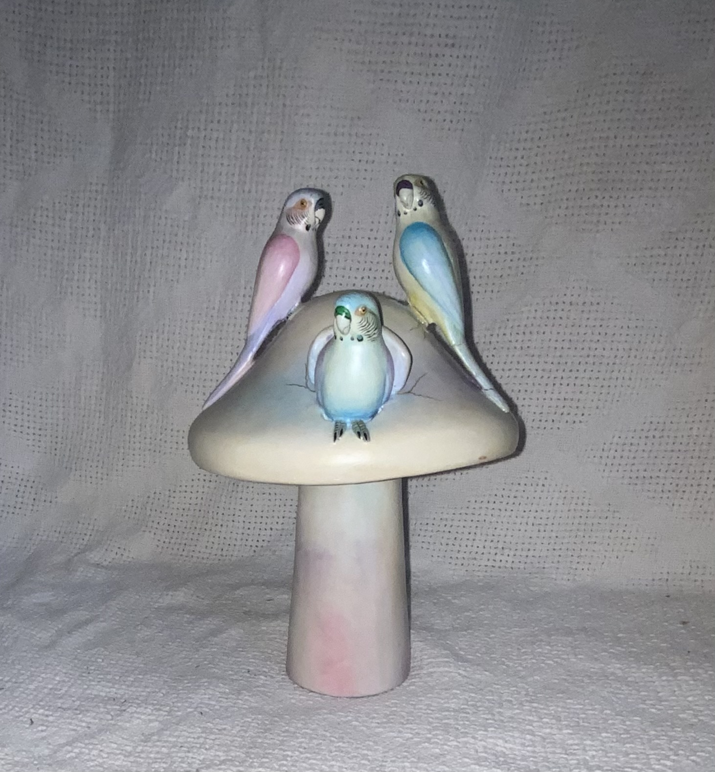 Signed Hector Gonzales 7/100 Mushroom And Three Parakeets Porcelain C. 1850. Yellow bird repaired. Dimensions are: 12” tall x 8” wide. Fair condition.