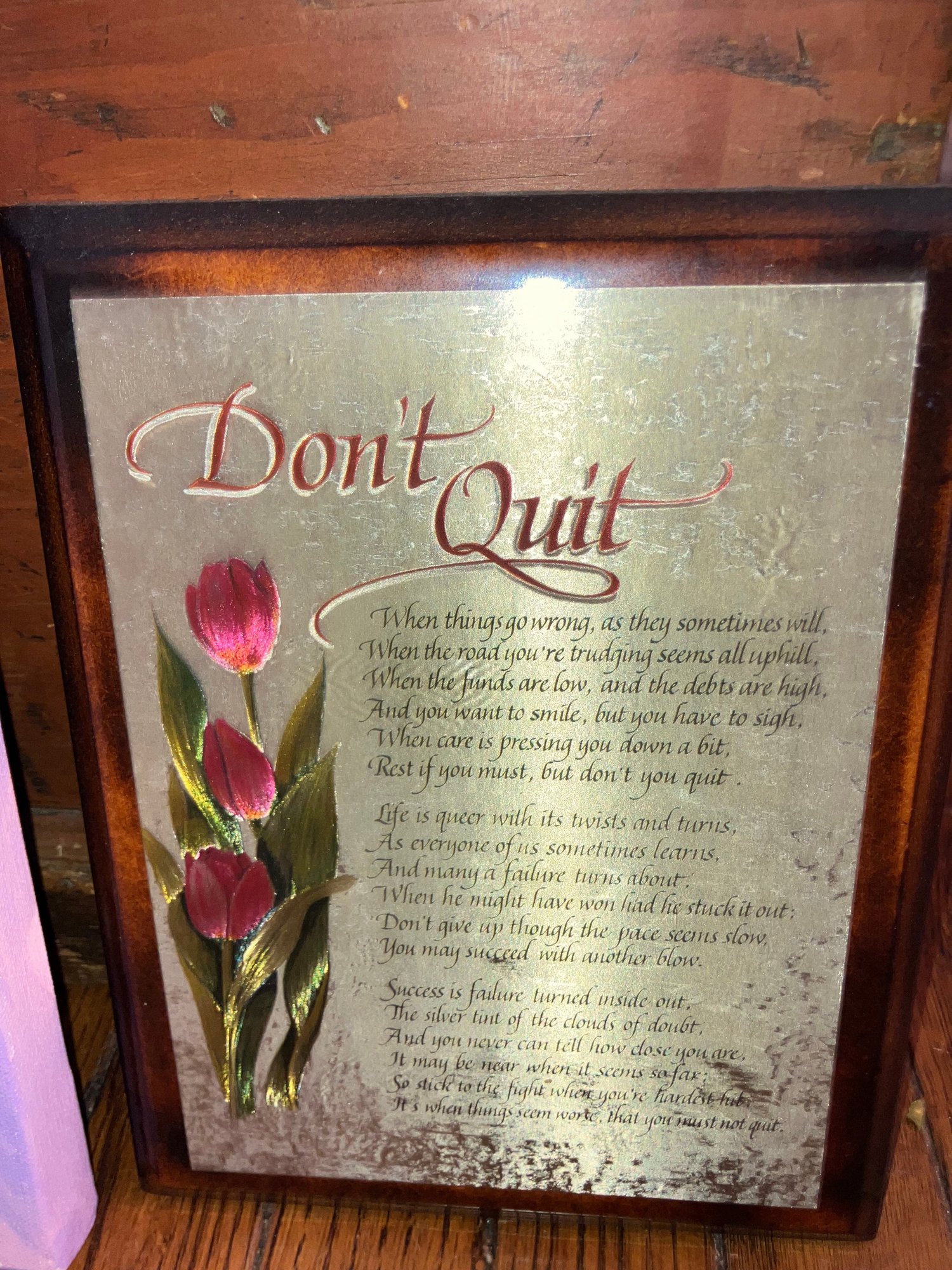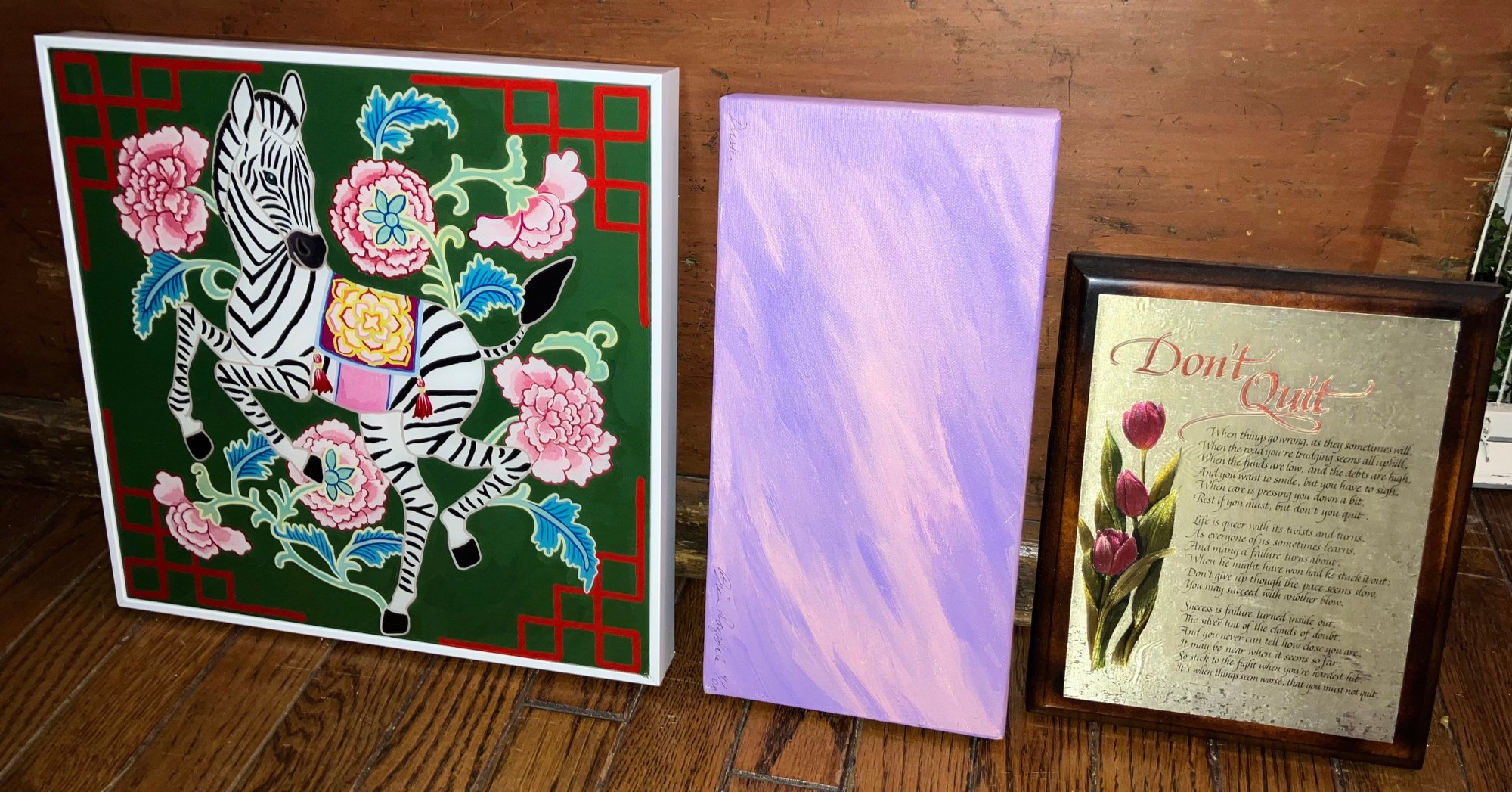 Signed oil painting by Brian Ragsdale & two framed prints. Dimensions: “Don’t Quit” dimensions: 9” tall x 7 1/4” wide, purple painting: 6” tall x 12” wide & 12 1/2” tall x 12 1/2” wide. Good condition.