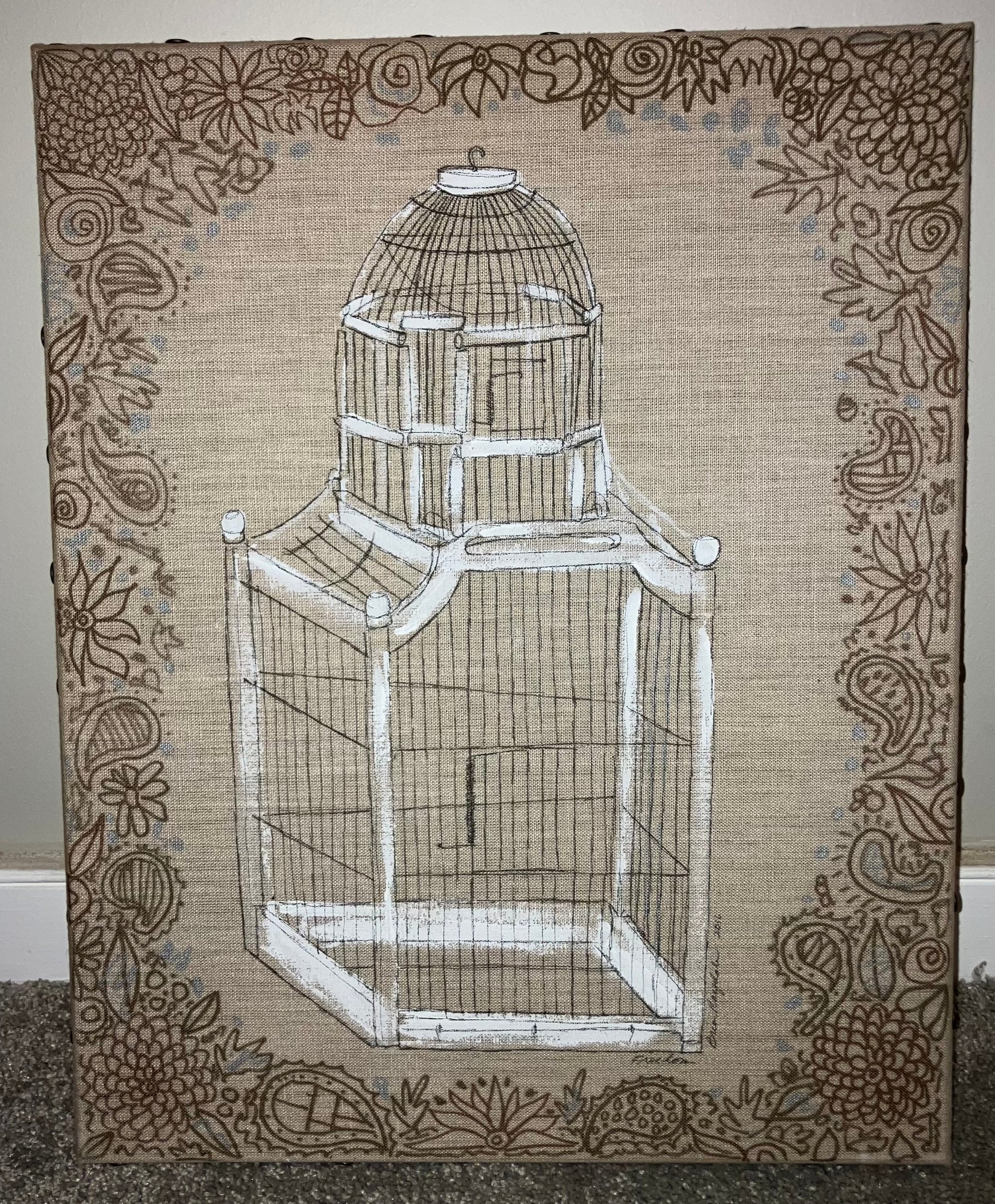Signed painting on linen of a birdcage by Brian Ragsdale. Dimensions: 20 1/2” tall x 16” wide. Good condition.