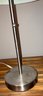 Silver table lamp with shade. Dimensions: 19 1/4” tall x 5” round. Good condition.