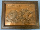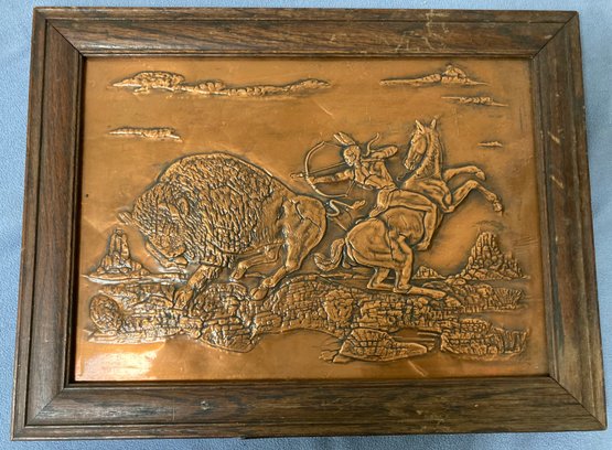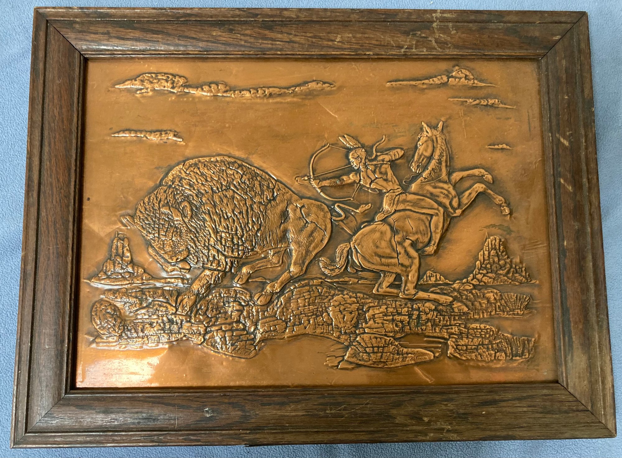 Stamped Copper Native American scene with wooden oak frame. Frame dimensions are: 14” tall x 10 1/4” wide. Copper scene dimensions: 12 1/4” tall x 16 3/8” wide. Condition: See photos.