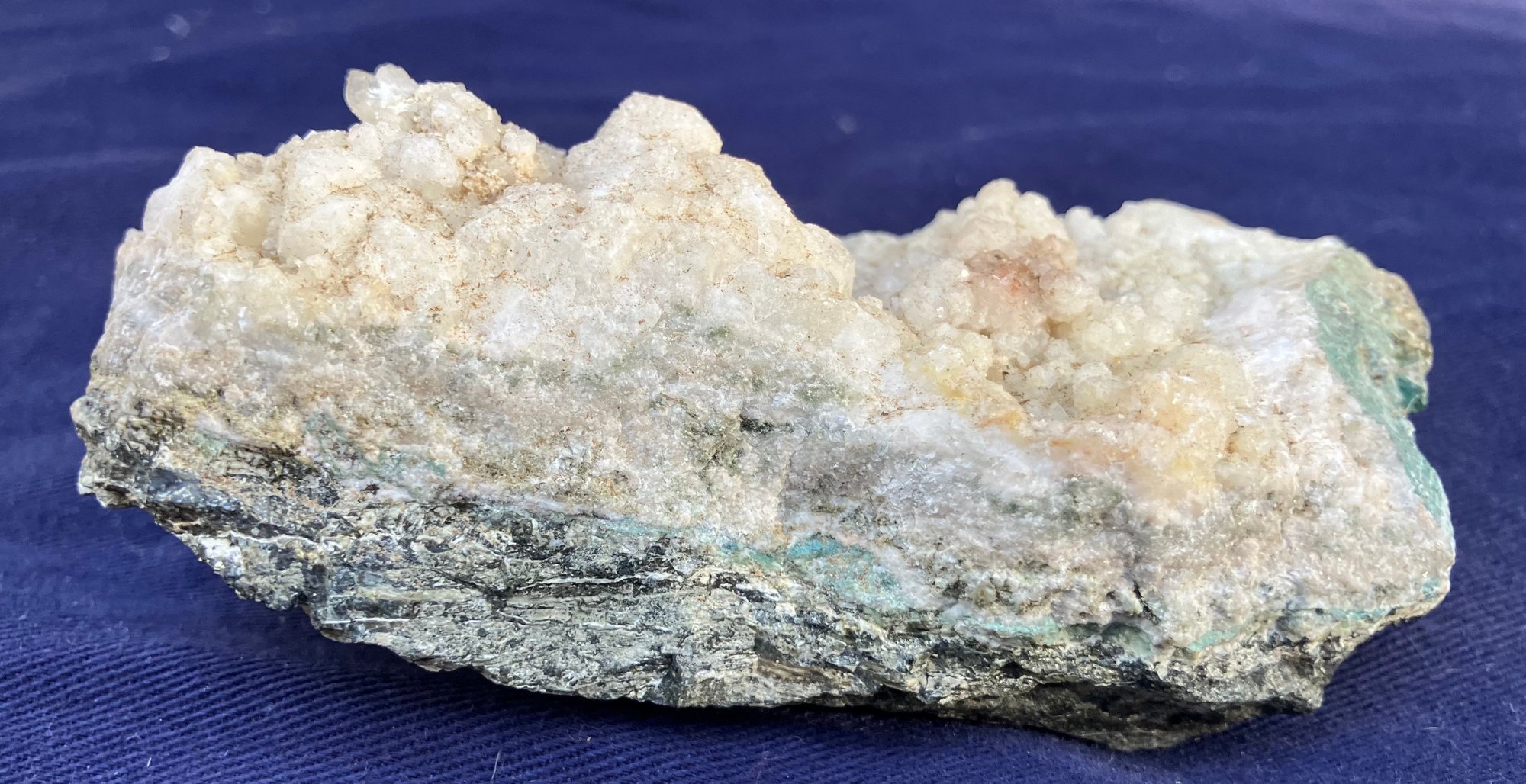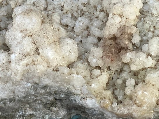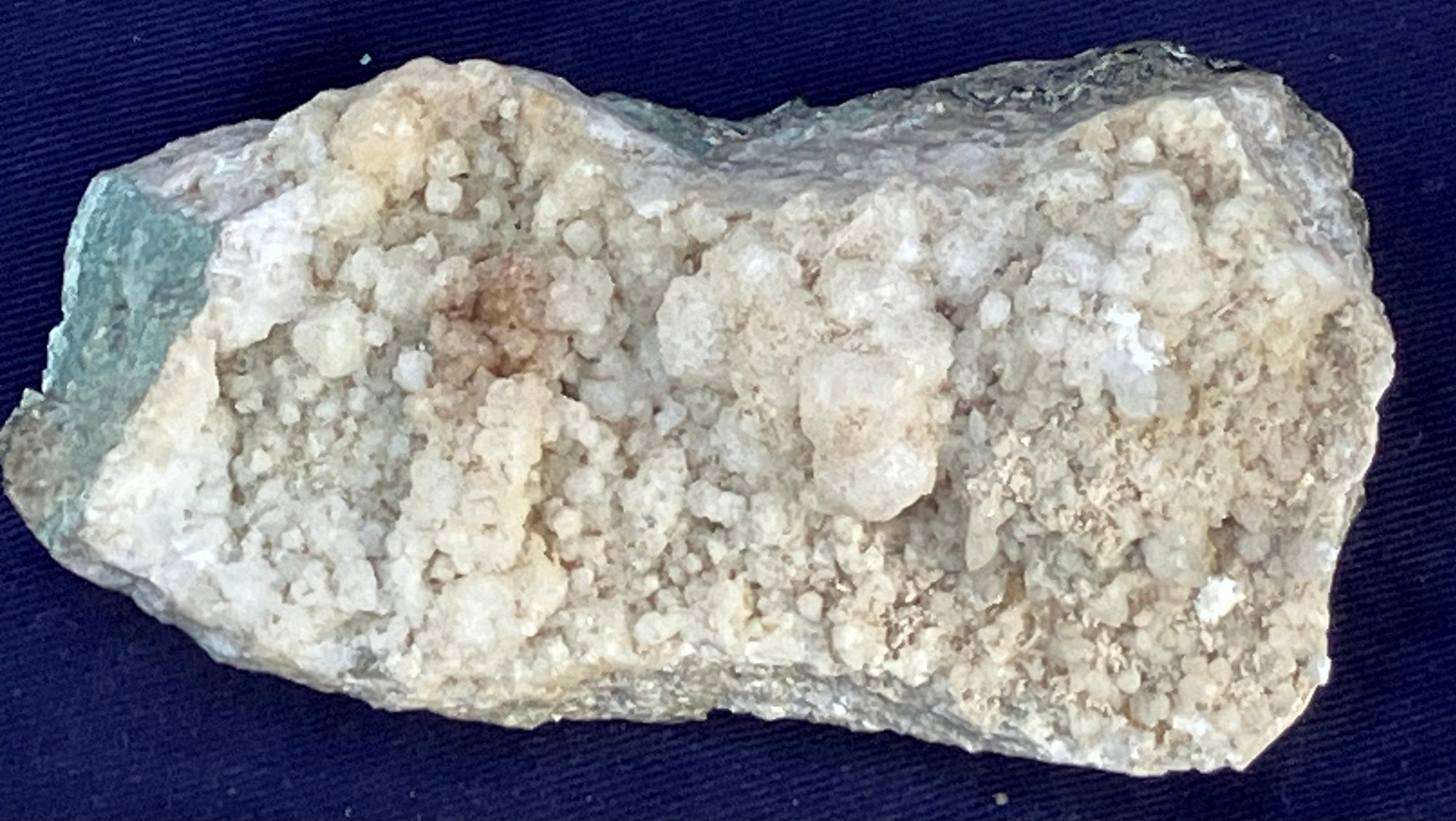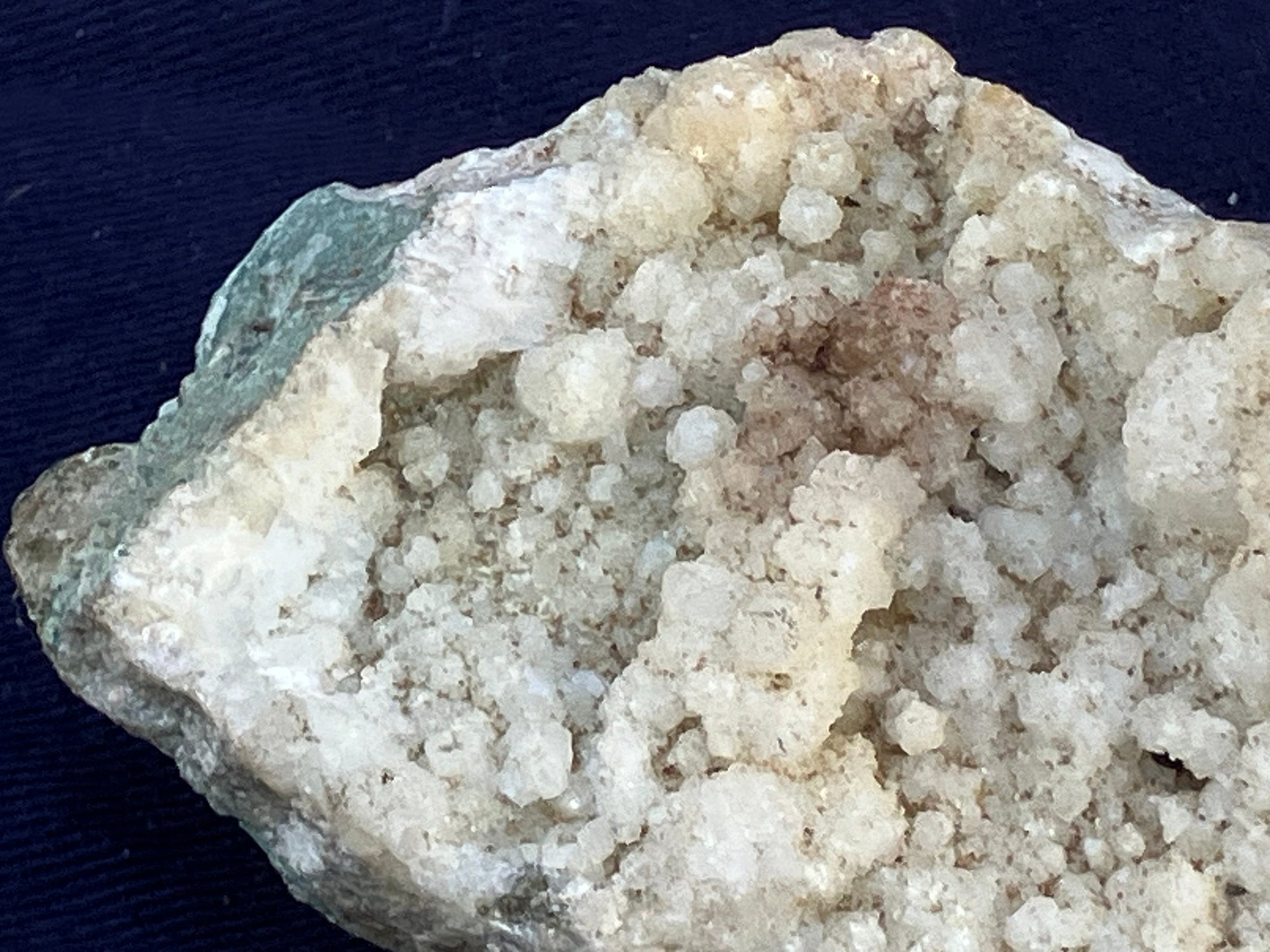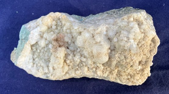 Stilbite with botryoidal formation. One small area showing a pinkish tone and there are two small sites of yellow sulfides. Measures: 1 1/2” tall x 2” wide x 4” long. Weighs: 7.9 ounces.