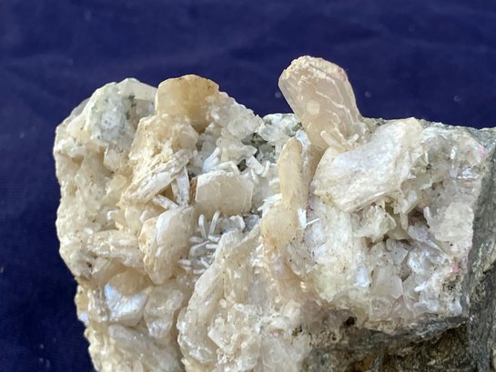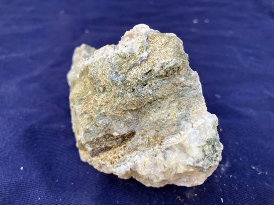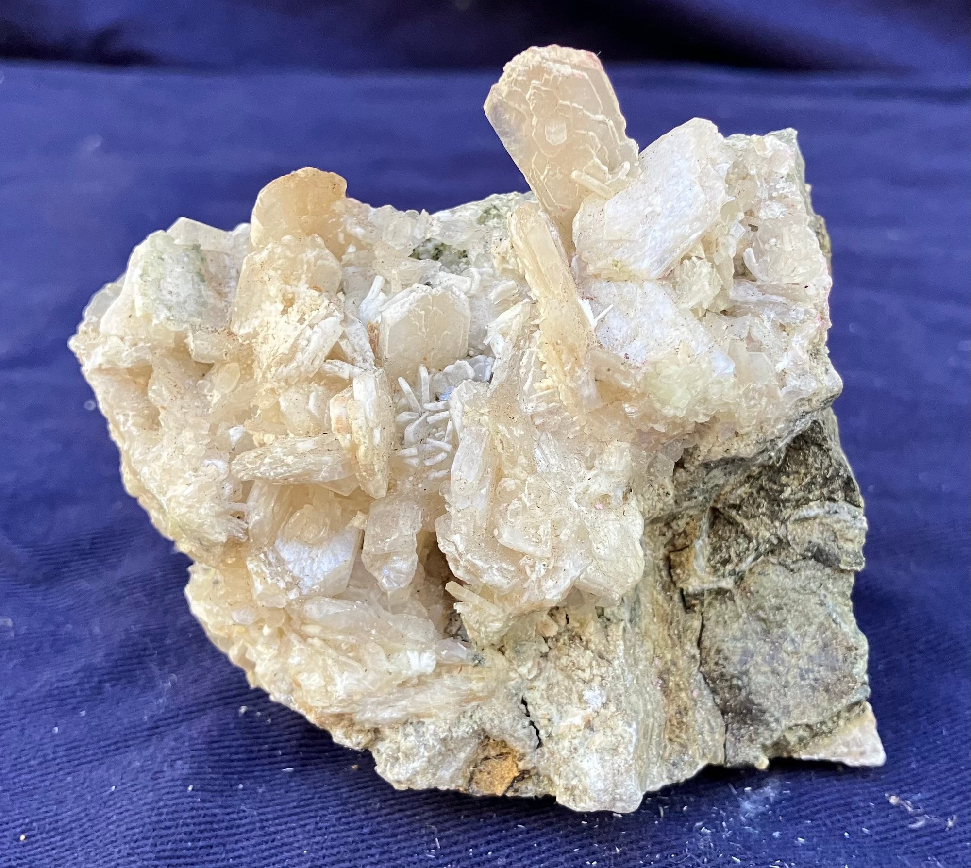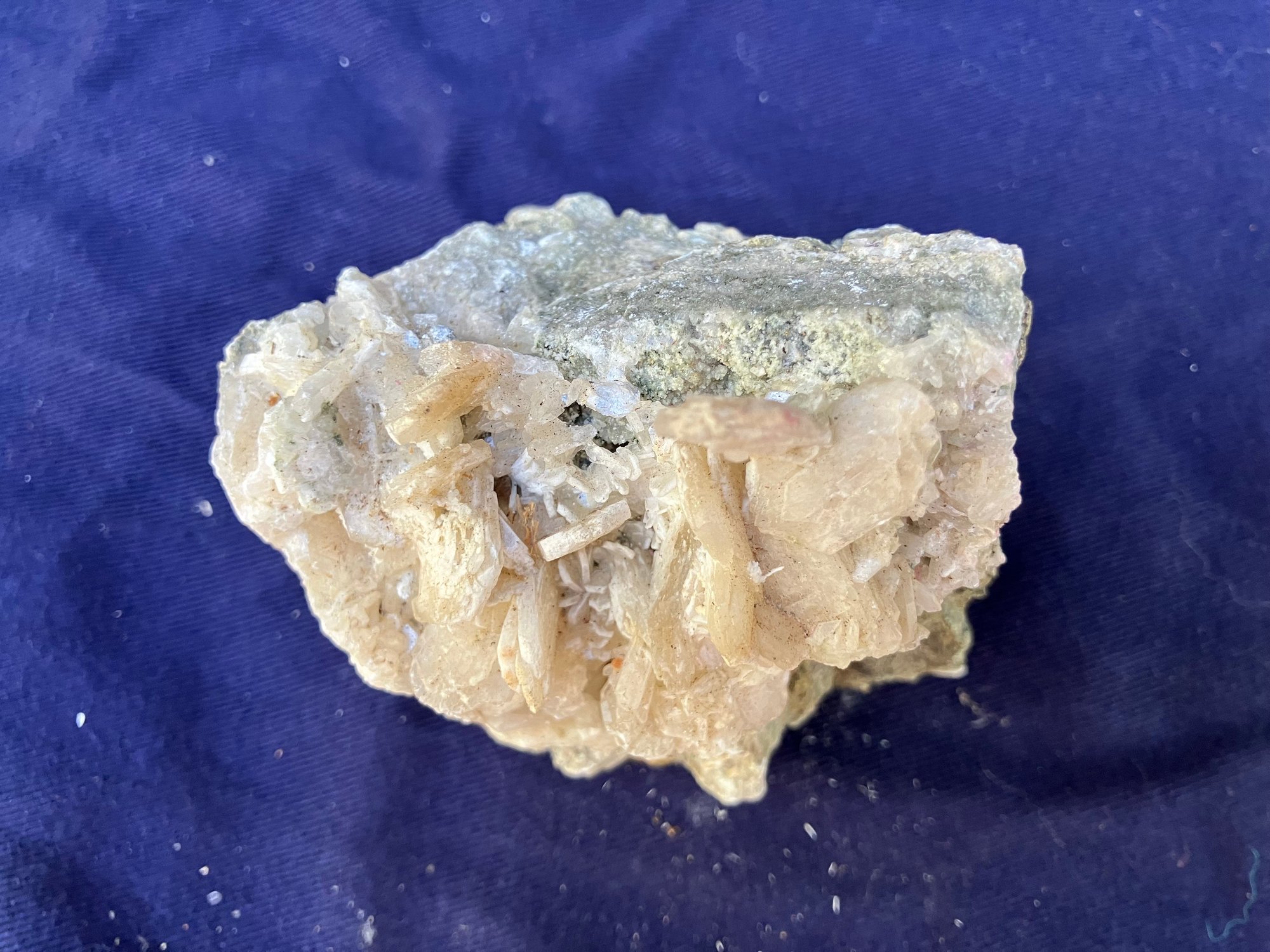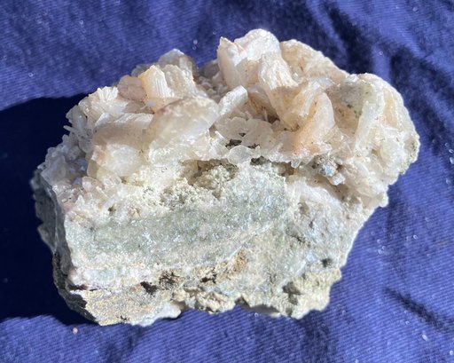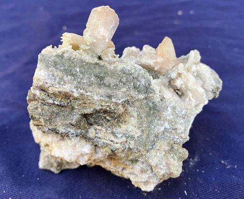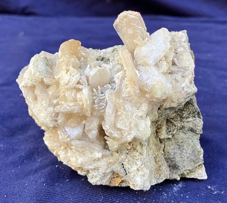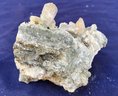 Stilbite Crystal cluster with sulfides. It has some green tint in small areas. Crystal structure is mostly tabular. Measures: 2 1/4” tall x 2 3/4” wide x 3 1/2” long. Weighs: 7.3 ounces.