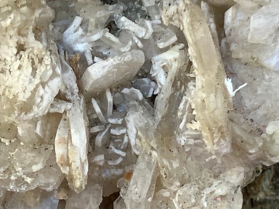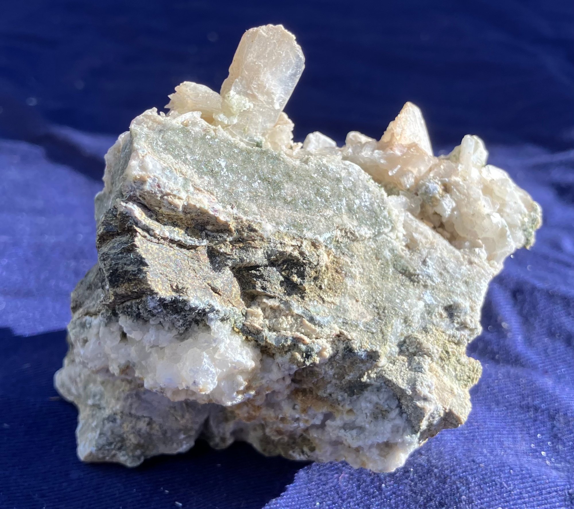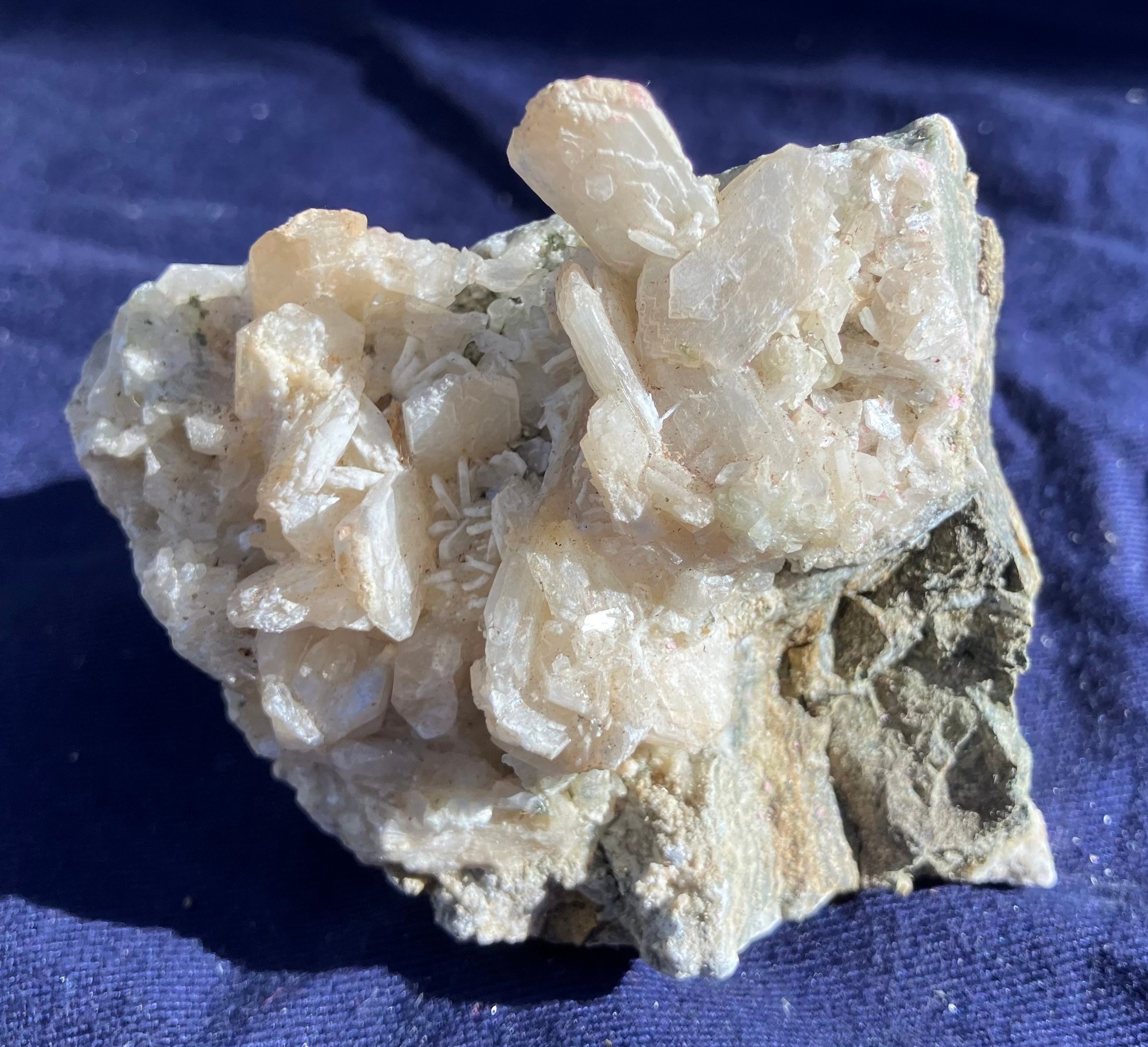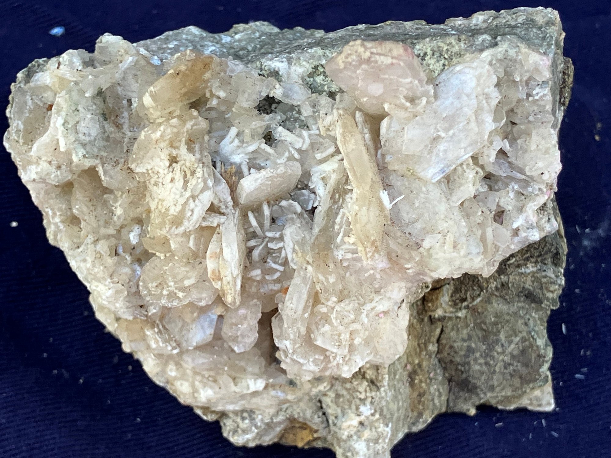 Stilbite Crystal cluster with sulfides. It has some green tint in small areas. Crystal structure is mostly tabular. Measures: 2 1/4” tall x 2 3/4” wide x 3 1/2” long. Weighs: 7.3 ounces.