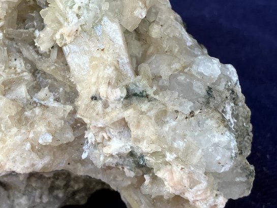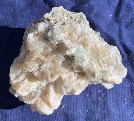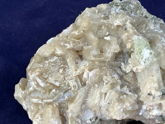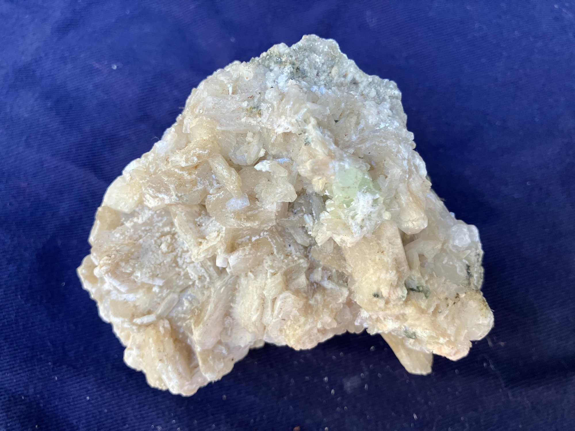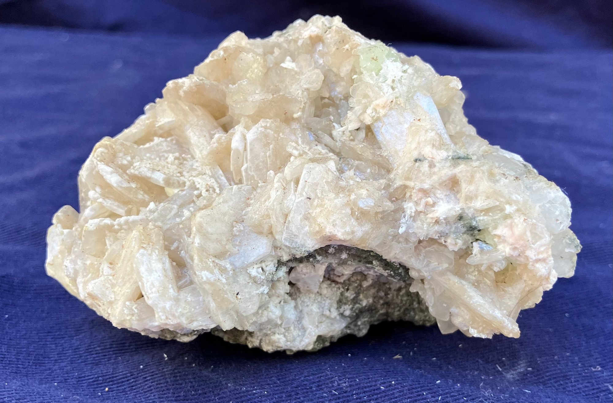 Stilbite Crystal cluster with one green crystal. Measures: 2 7/8” tall x 2 7/8” wide x 3 1/4” long. Weighs: 7.4 ounces.