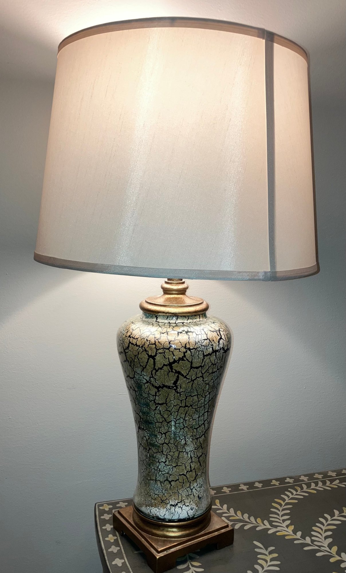 Table lamp with shades. There is a small chip as shown in photo. Dimensions: 31 1/2” tall x 6 1/2” square. Except for the small chip, the lamp is in good condition.