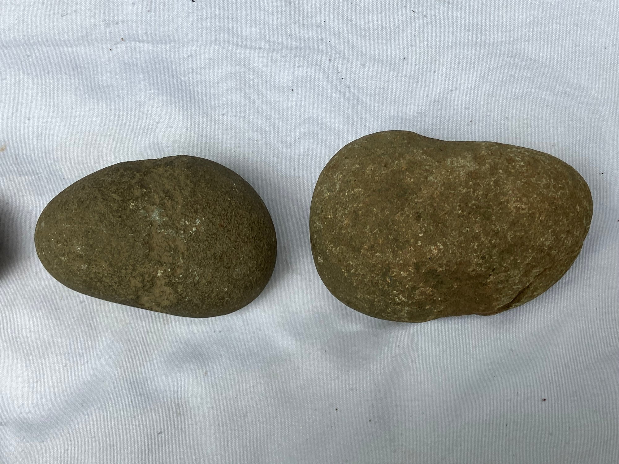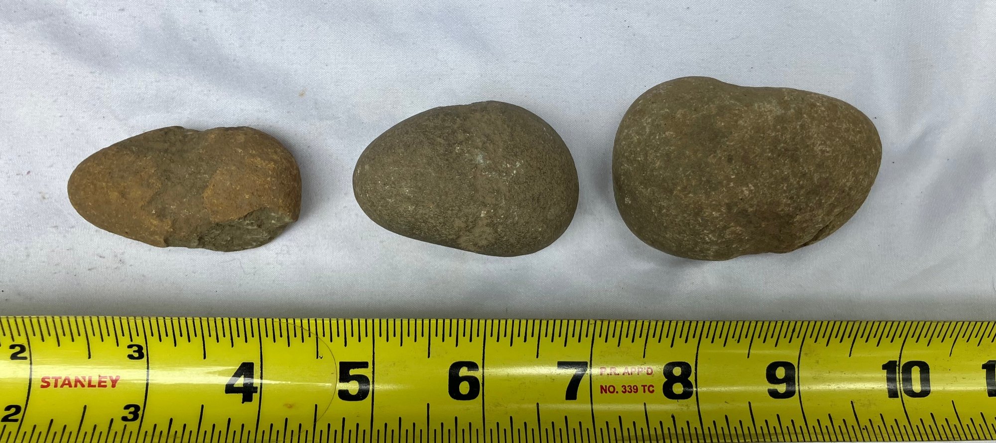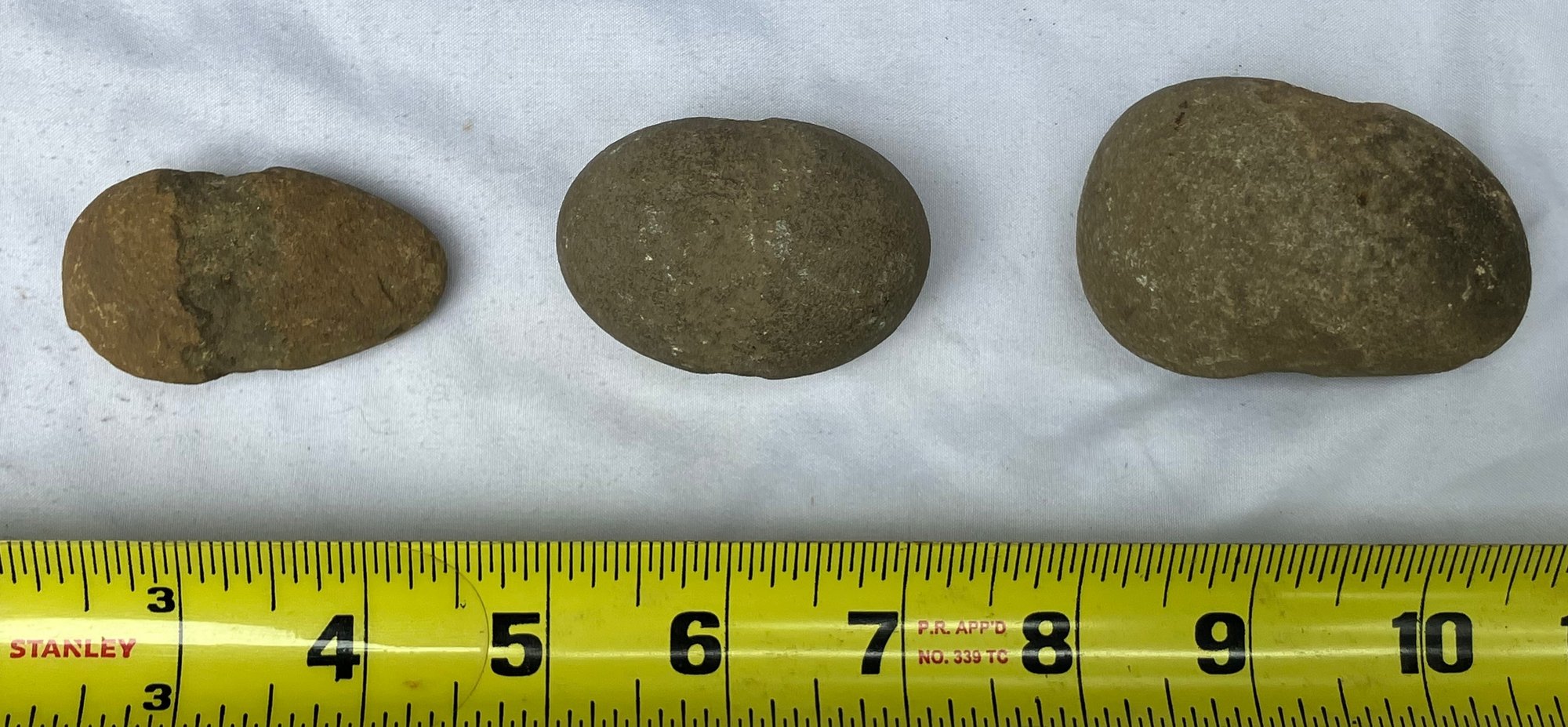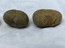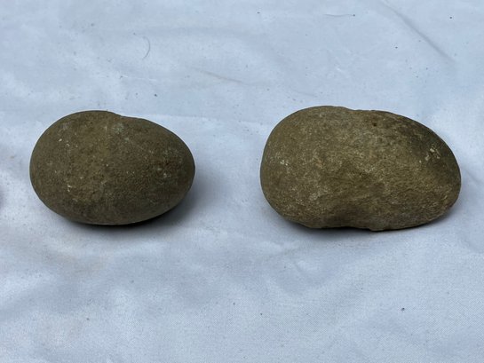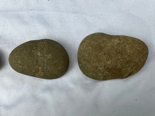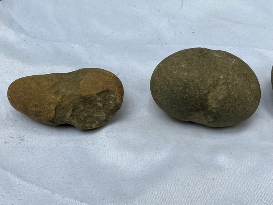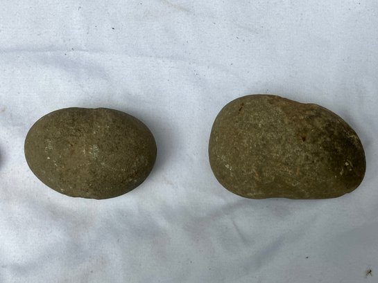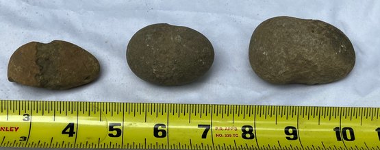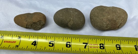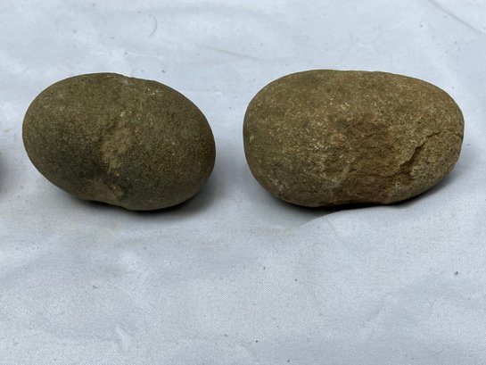 Found at a Native American dig site. Three Native American hammer stones. All three show signs of hand pecking.