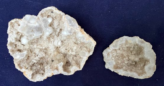 Two calcite geode halves. Measures: 3 1/4ā long x 2 3/eā wide and 2ā long x 1 3/4ā wide.