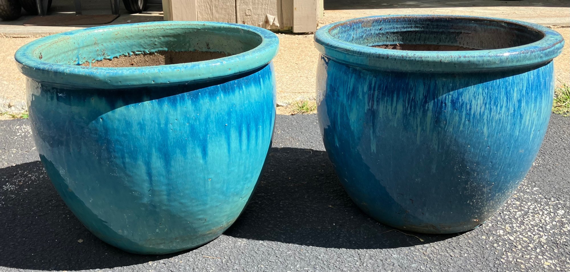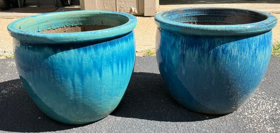 Two ceramic flower/planter pots. Dimensions: 12 1/4” tall x 18” round. Good condition.