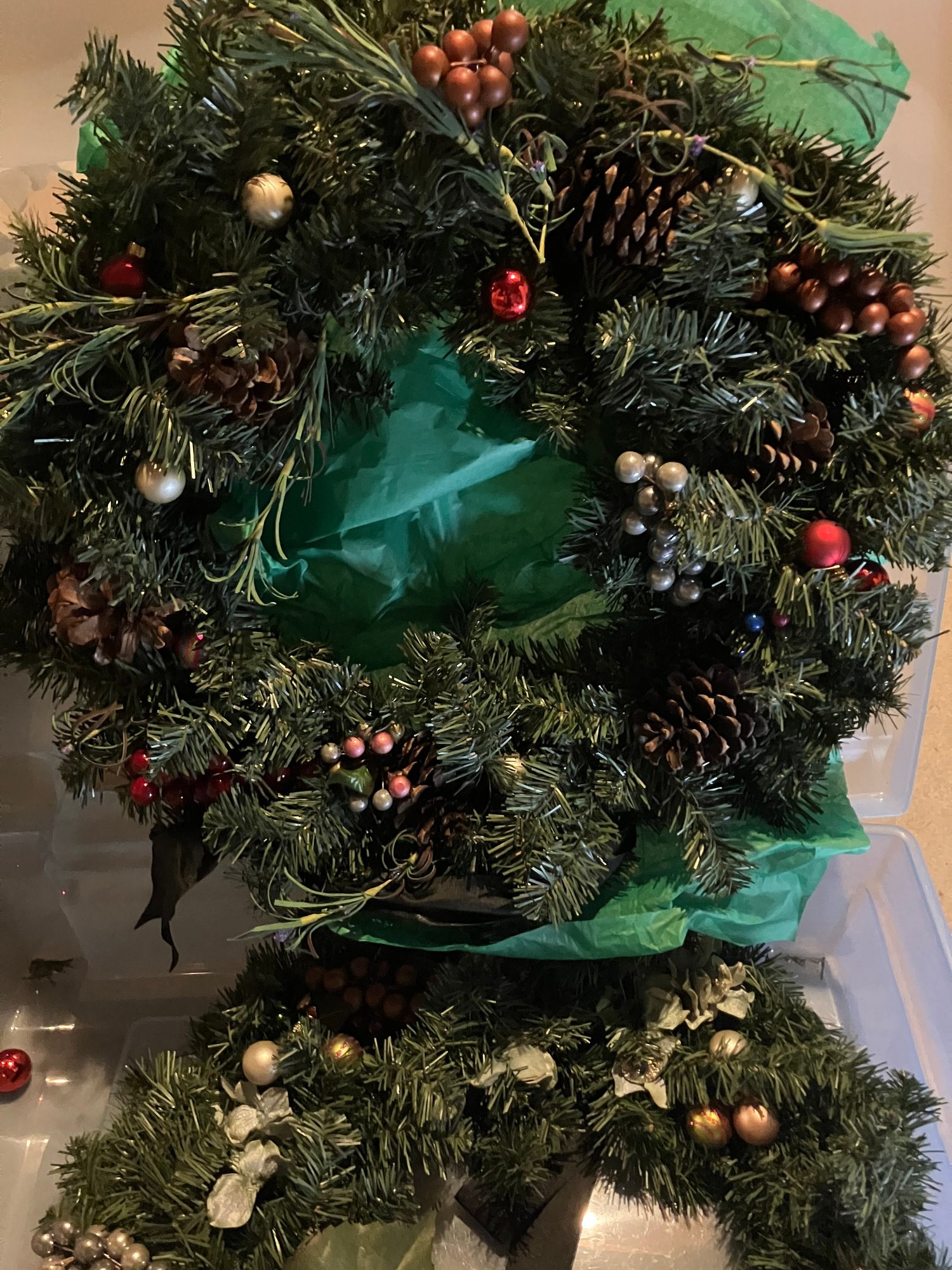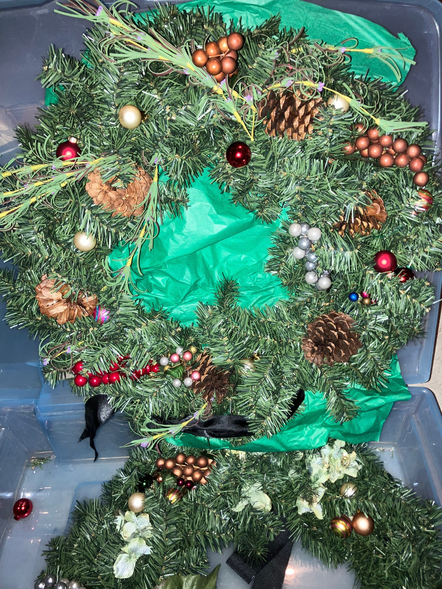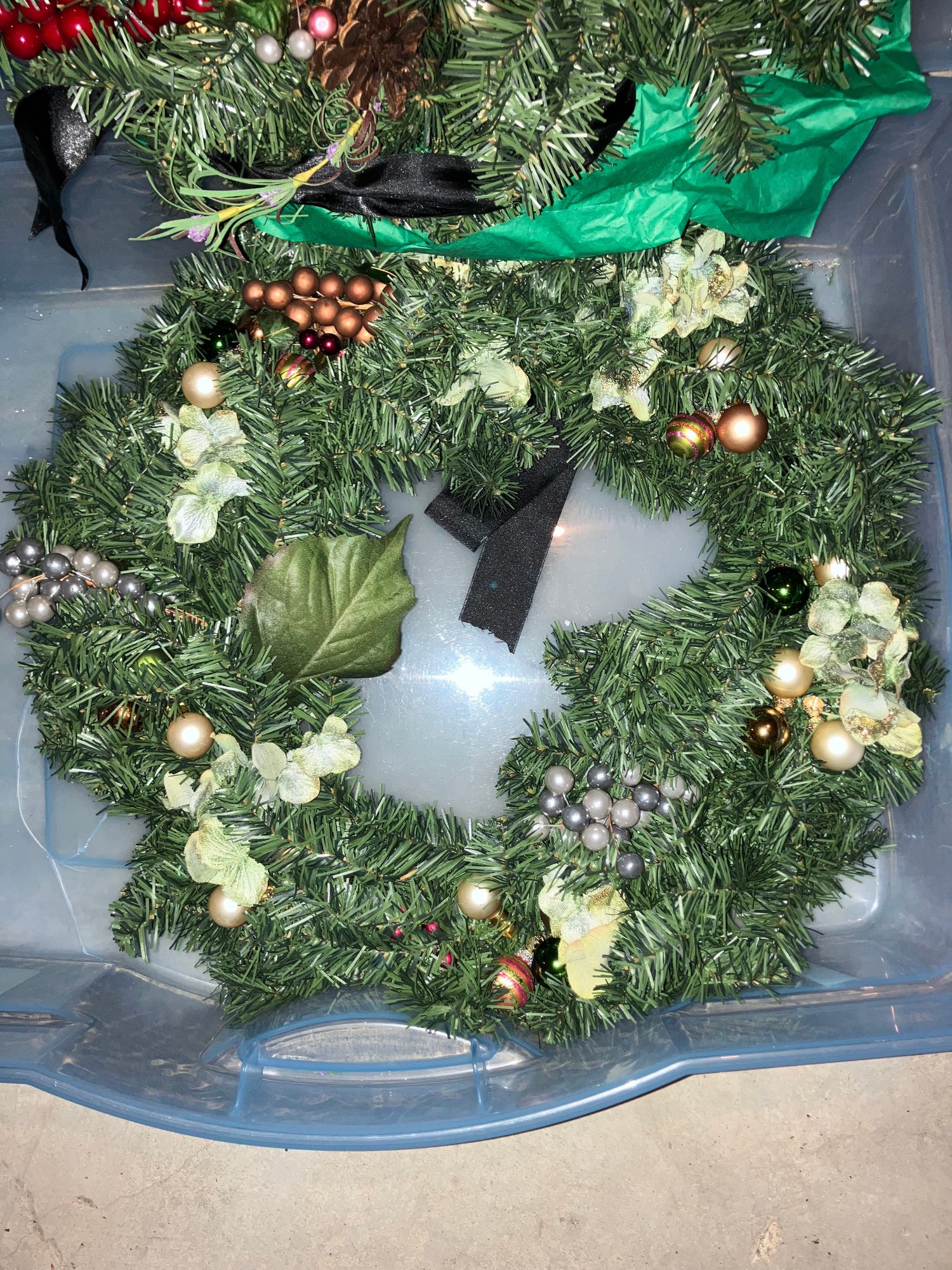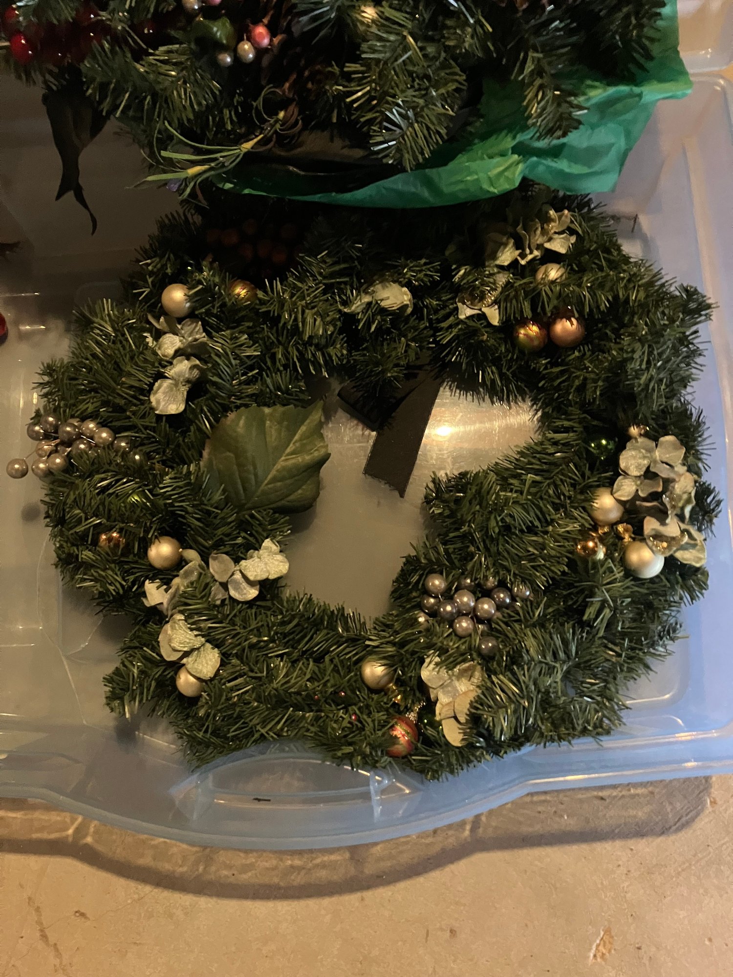 Two Christmas Wreaths. (Tote not included). Dimensions: 20” round & 22” round. Good condition.