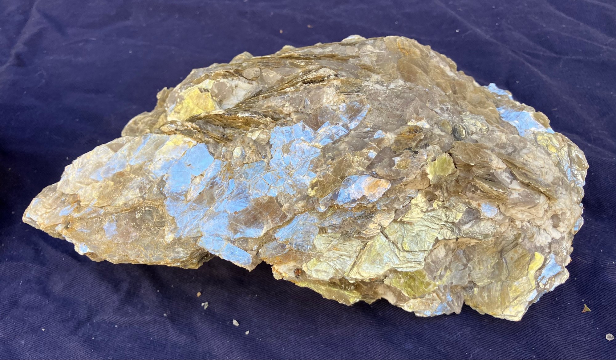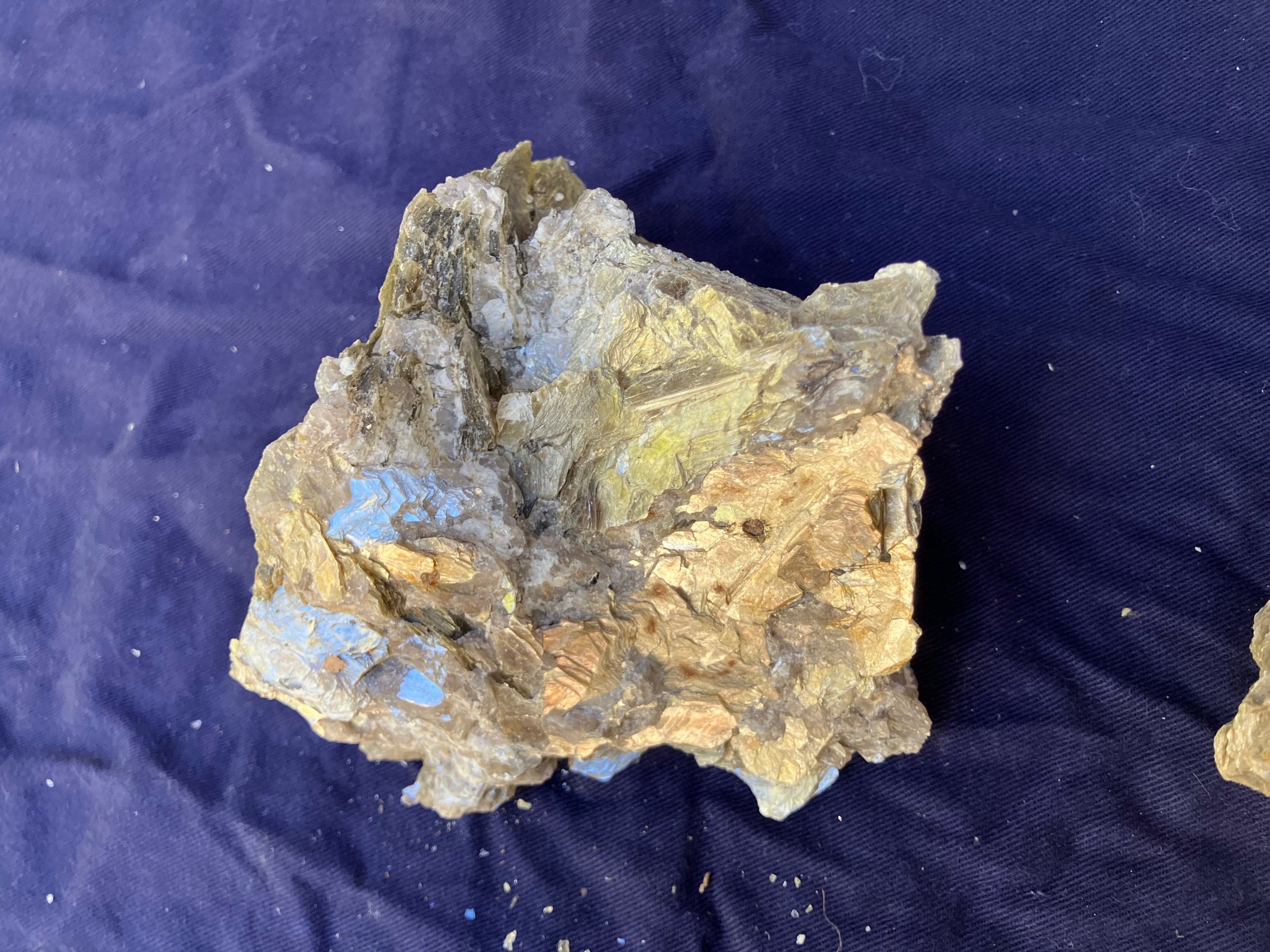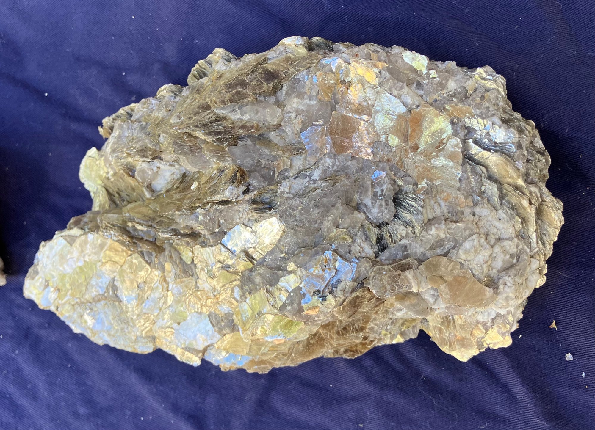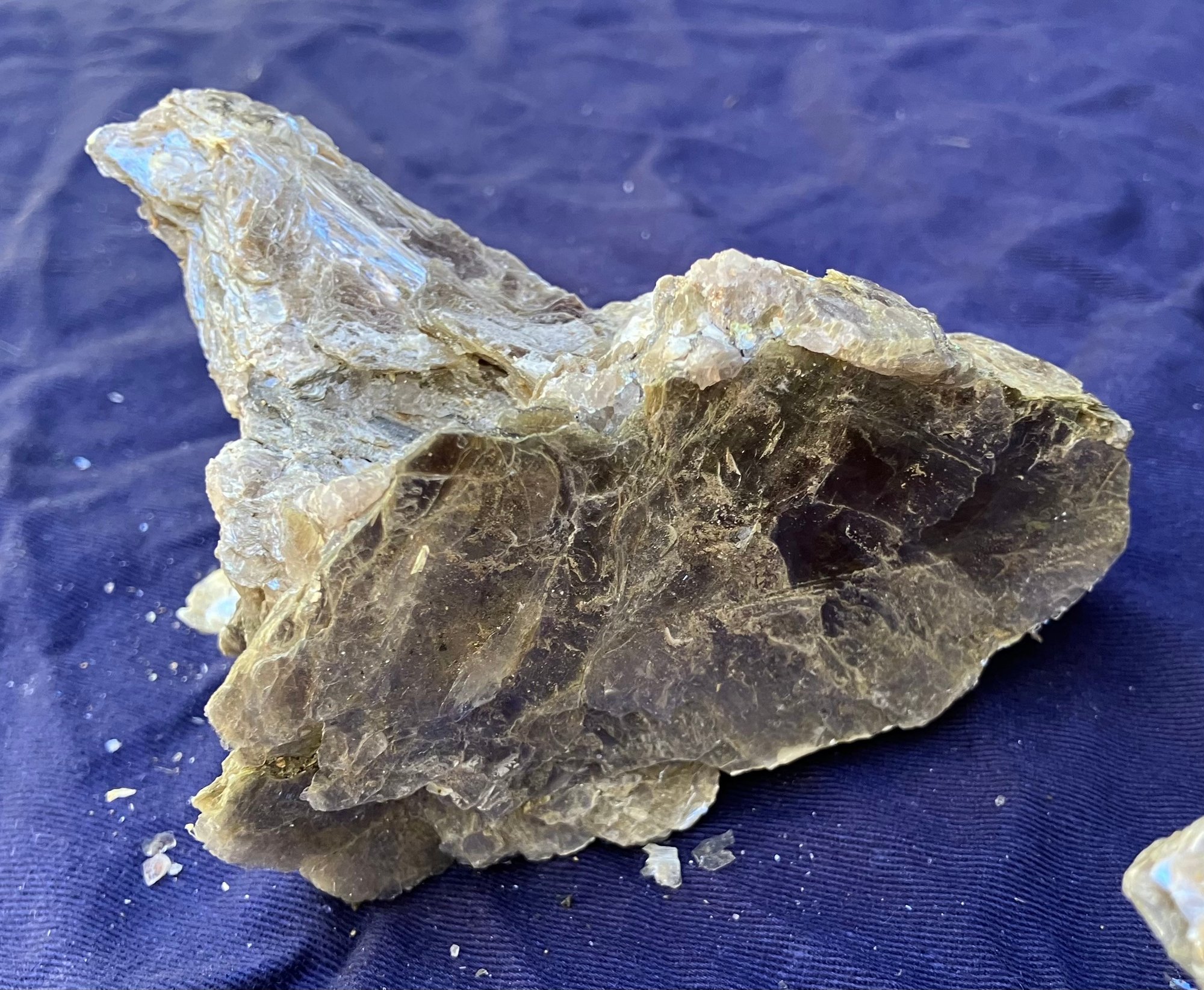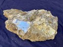 Two large Muscovite mineral specimens. Large piece measures: 3” tall x 8” long x 4 1/4” wide, smaller piece measures: 2 1/2” tall x 4” long x 4” wide. 3 pounds 6 ounces.