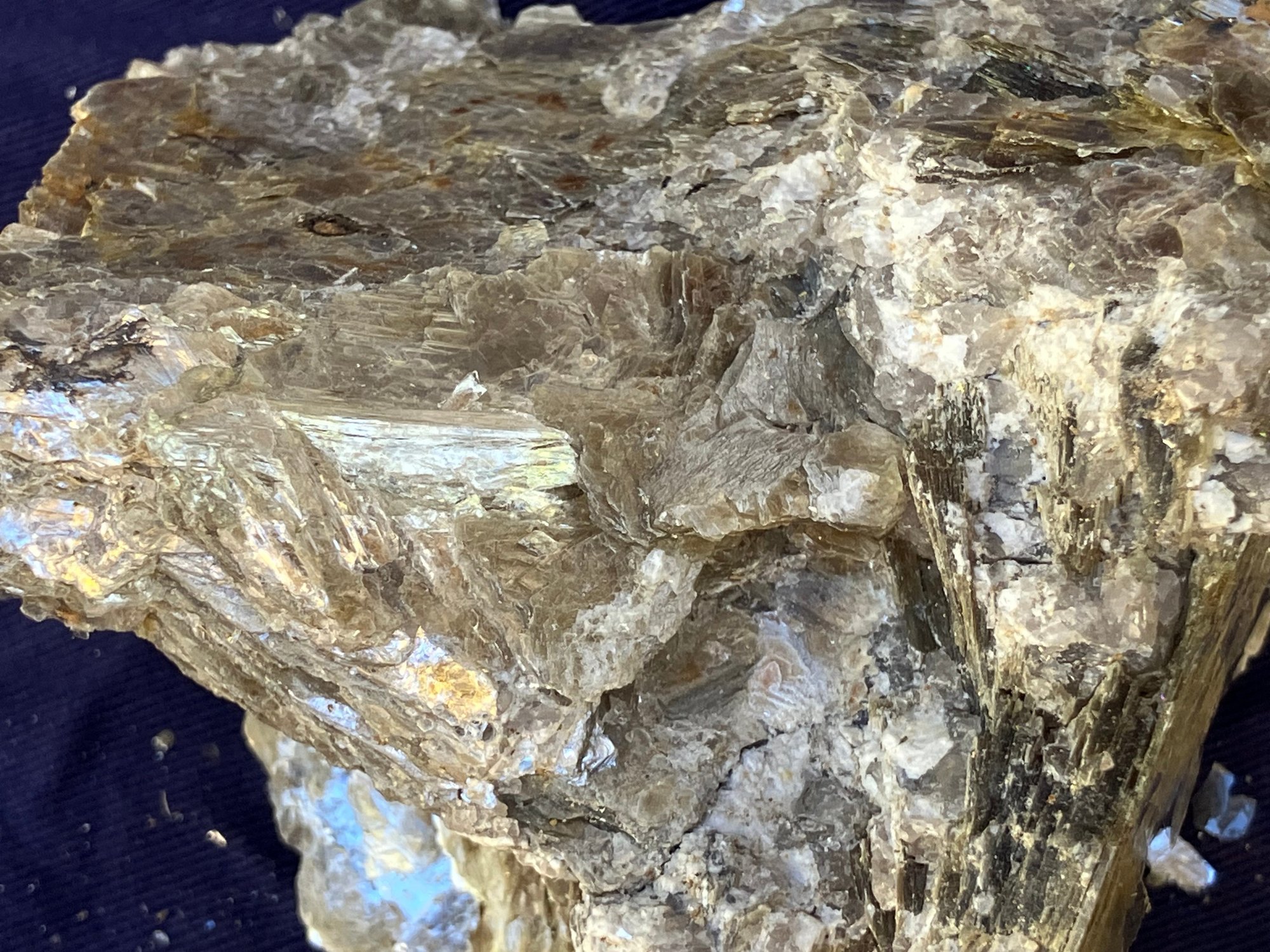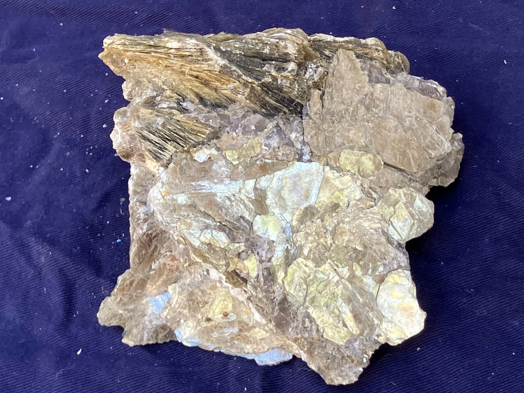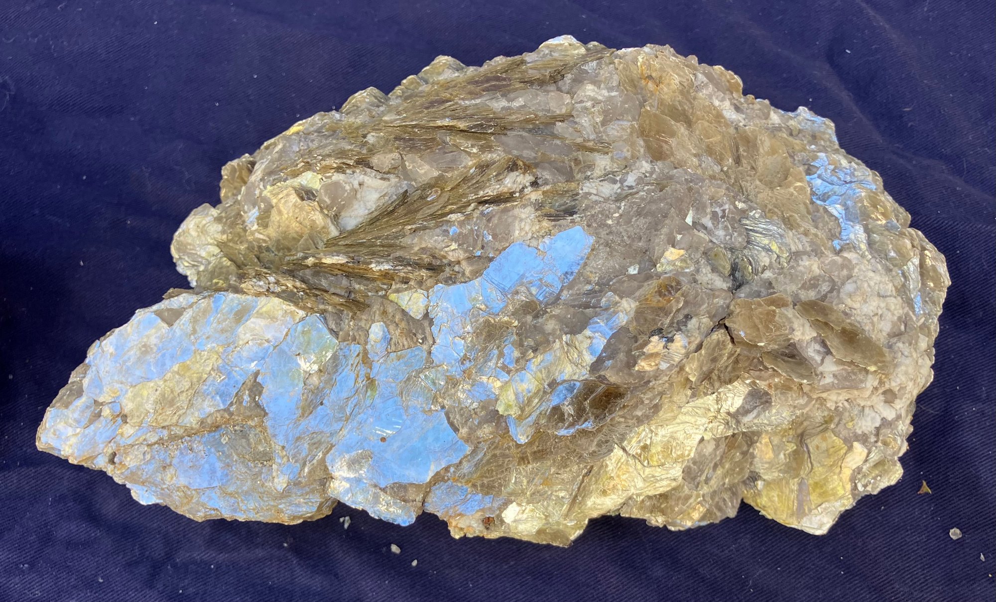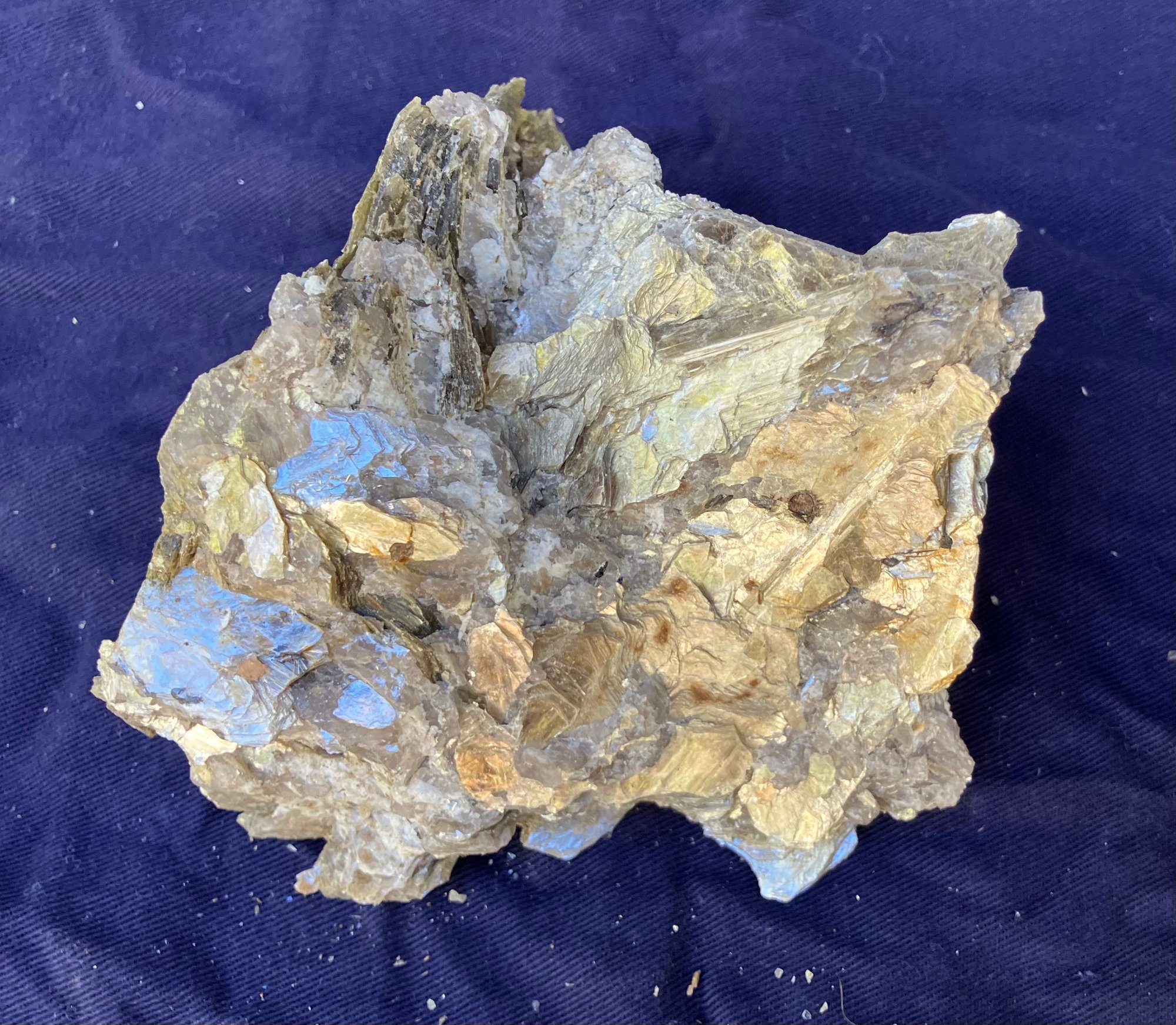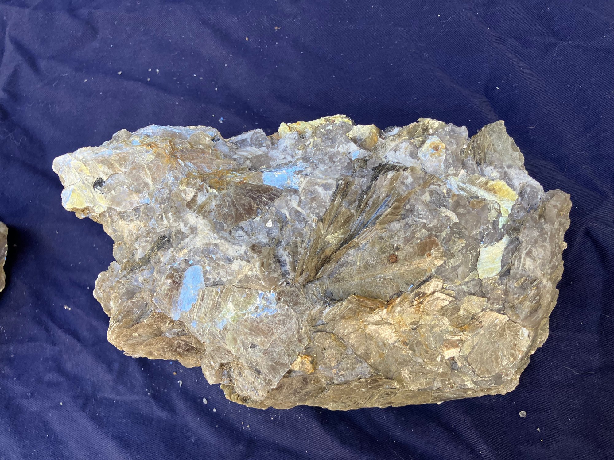 Two large Muscovite mineral specimens. Large piece measures: 3” tall x 8” long x 4 1/4” wide, smaller piece measures: 2 1/2” tall x 4” long x 4” wide. 3 pounds 6 ounces.