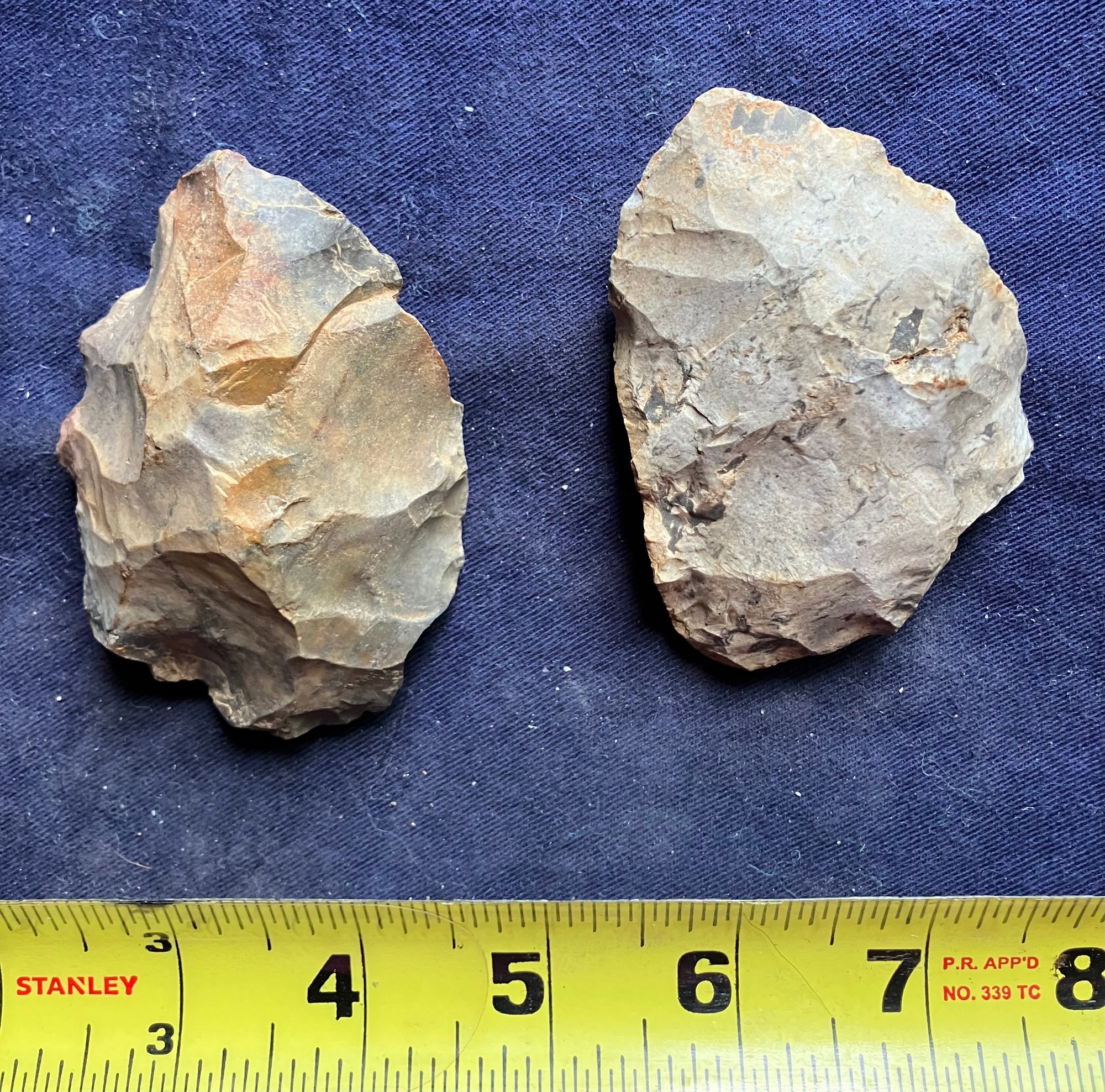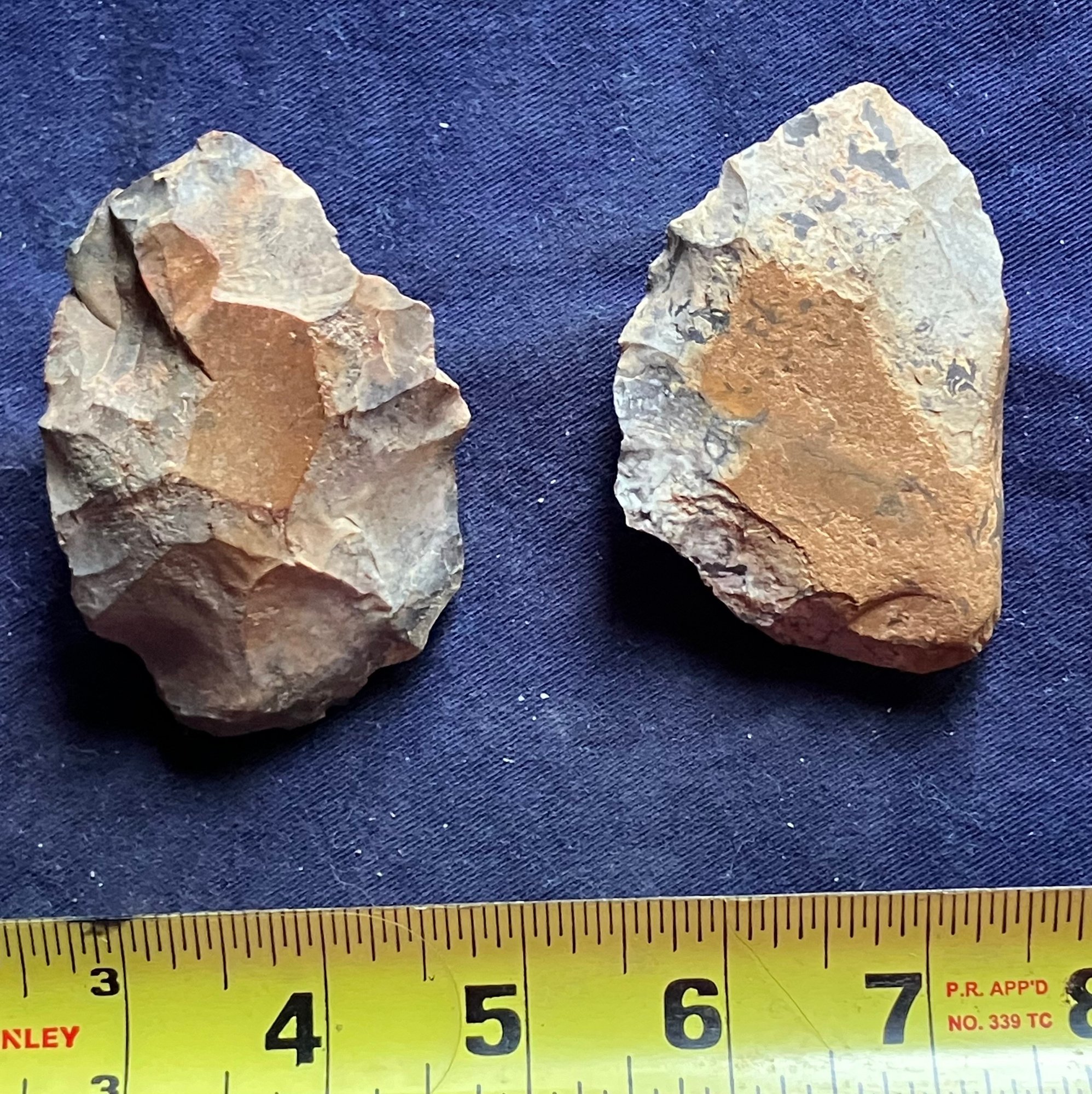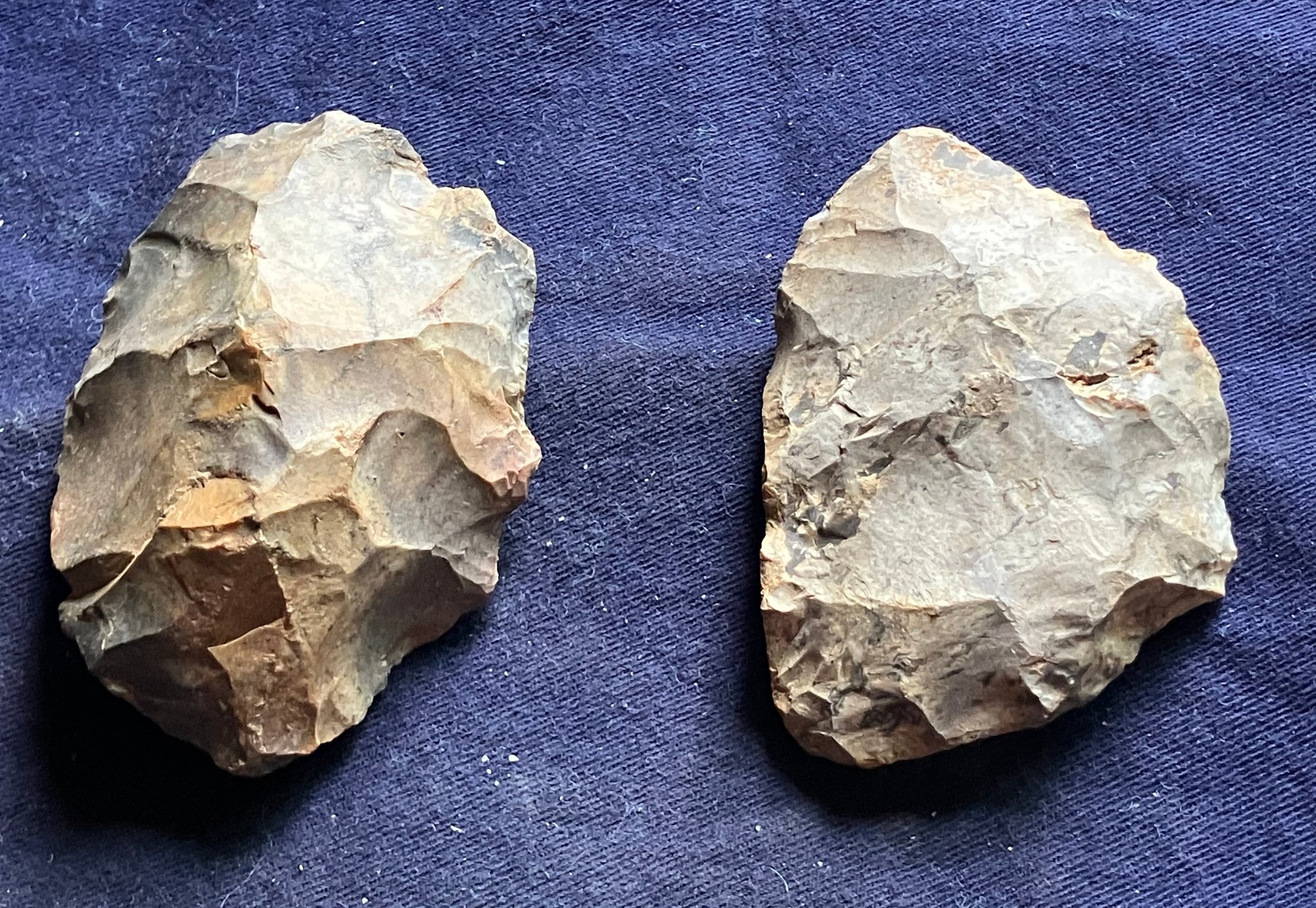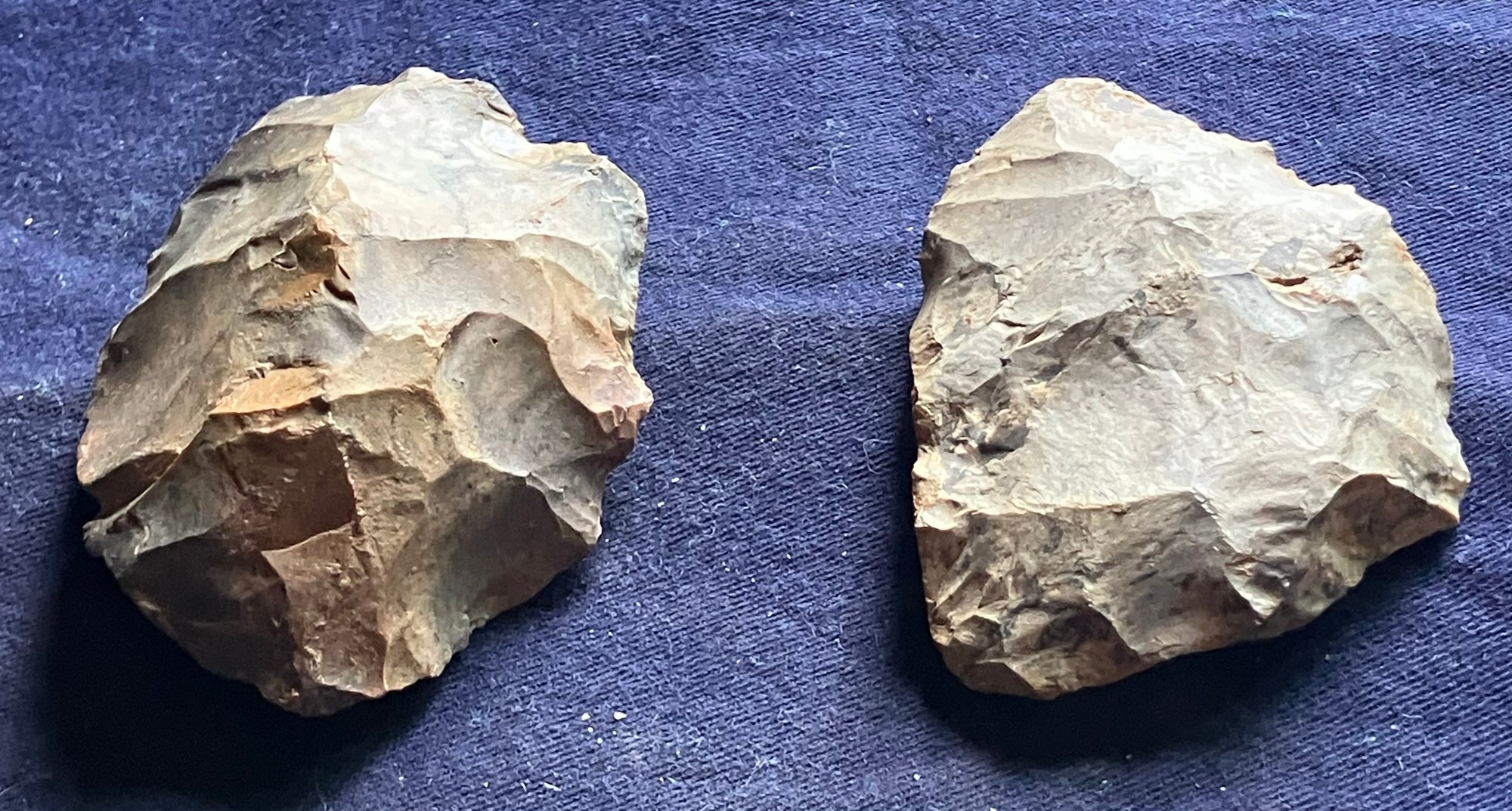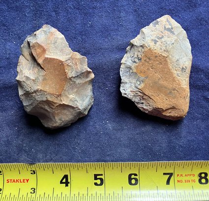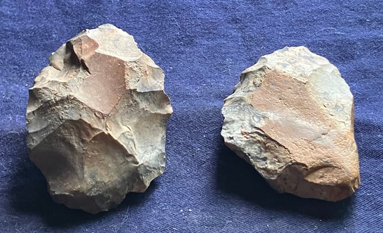 Found at a Native American dig site. One is a large knife blade that is flat on one edge. The other is a large Omni-facial hand axe. Made of chirt.