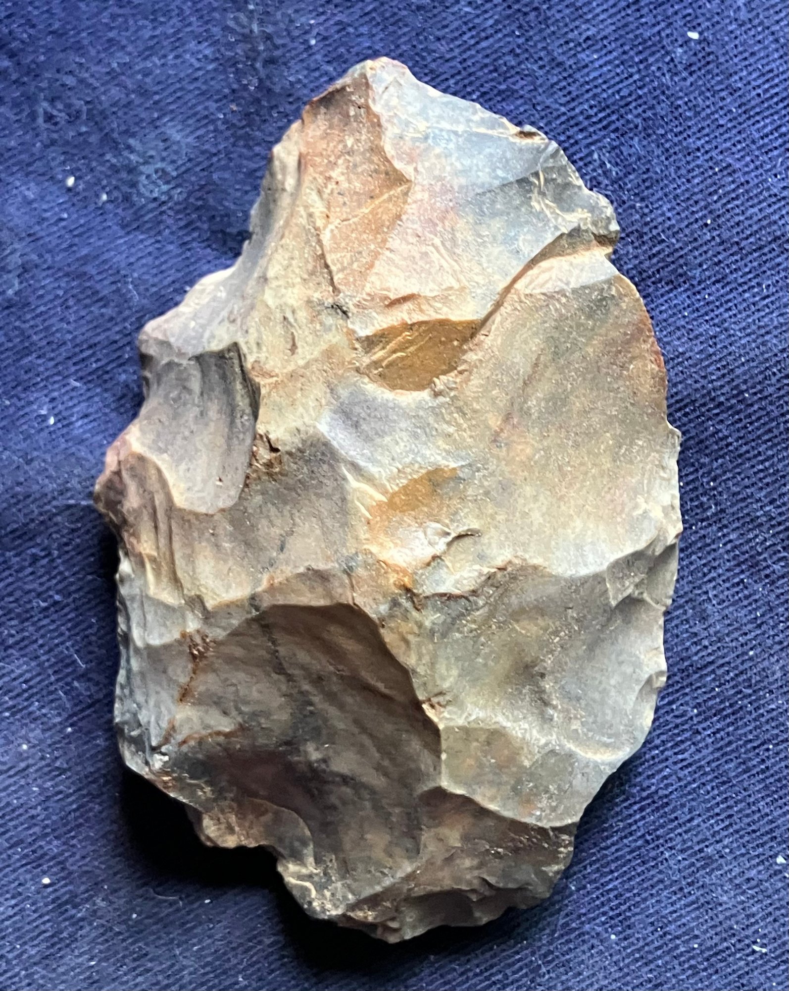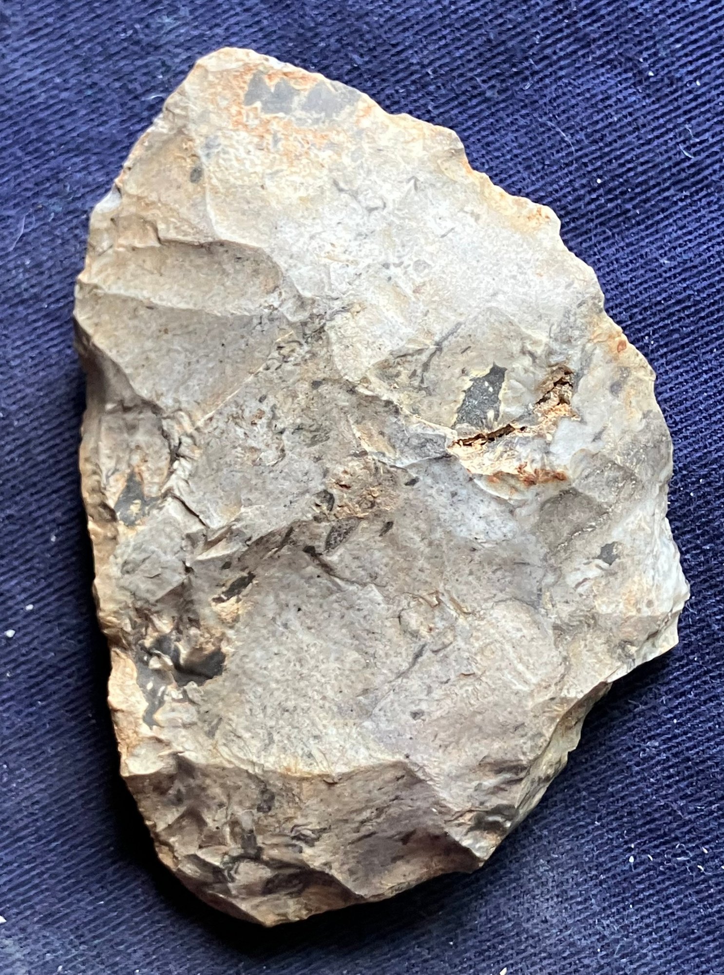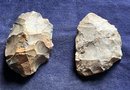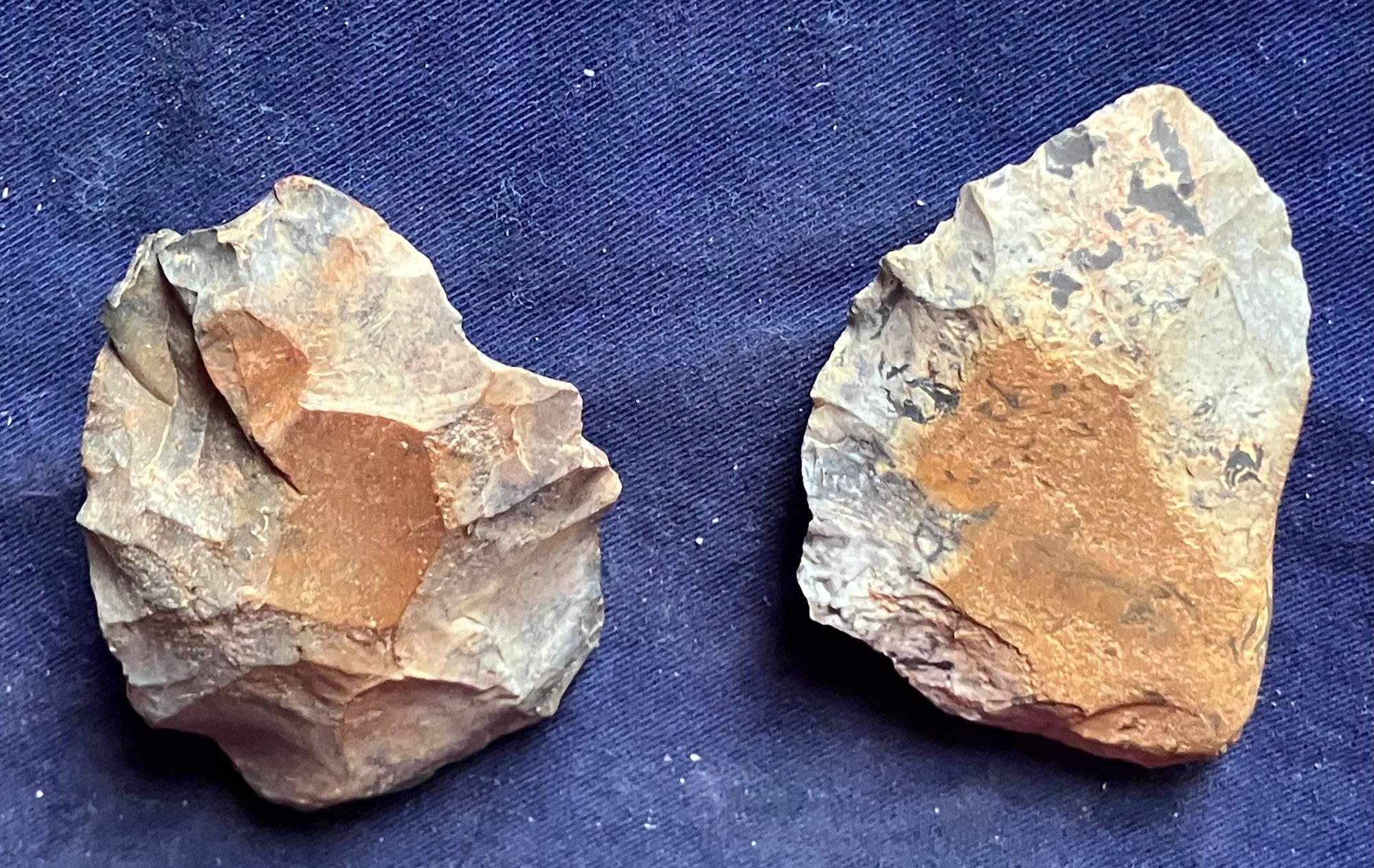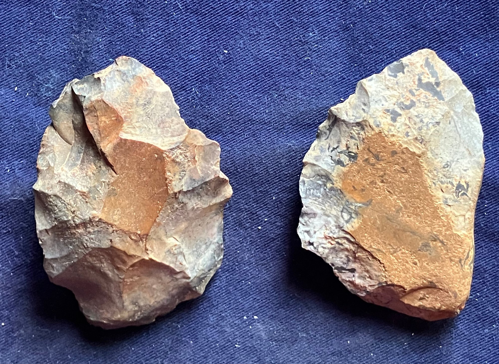Found at a Native American dig site. One is a large knife blade that is flat on one edge. The other is a large Omni-facial hand axe. Made of chirt.