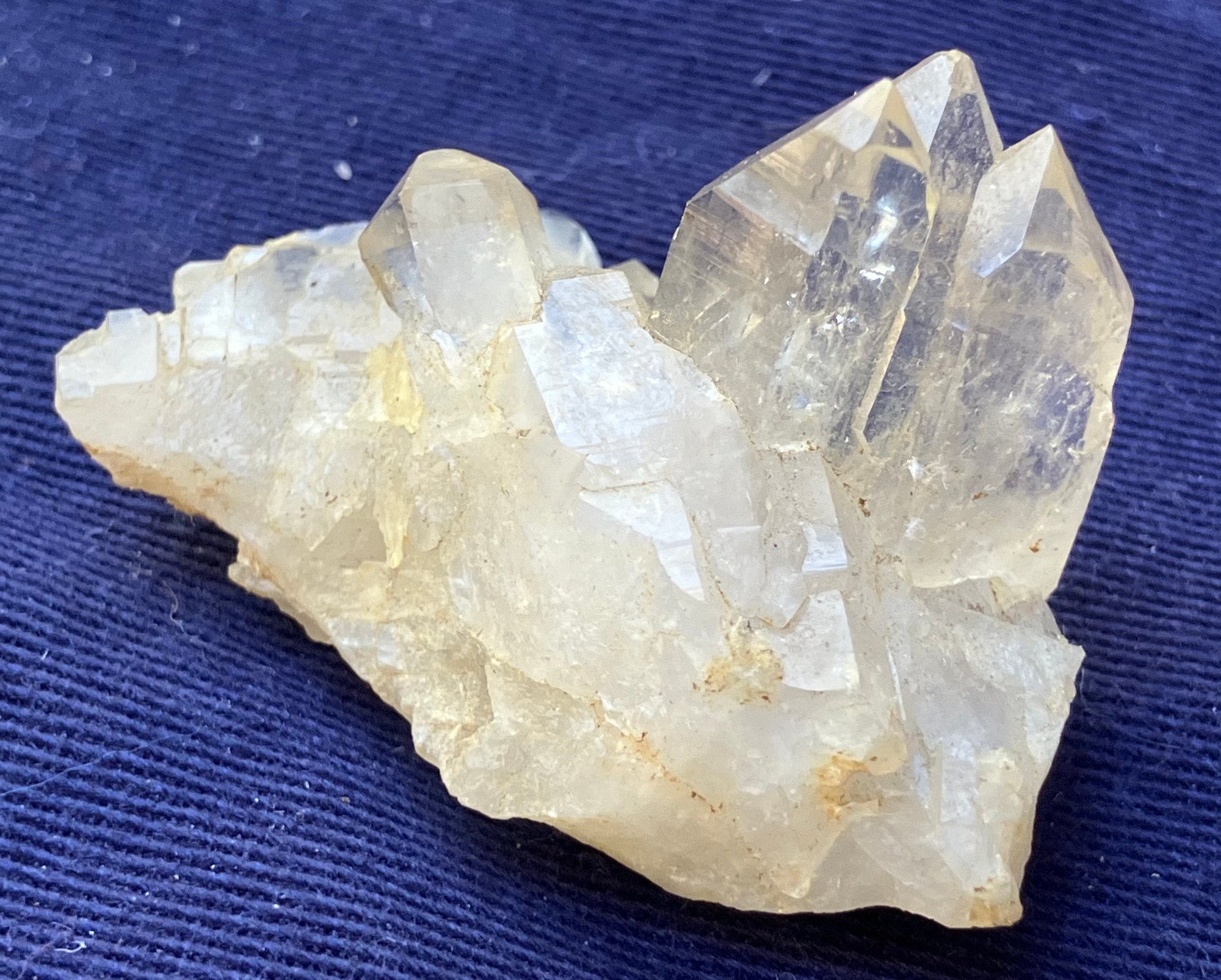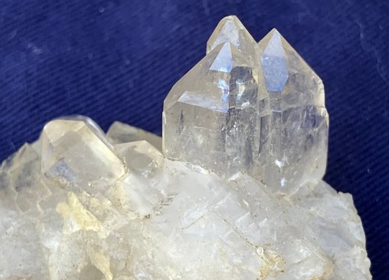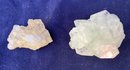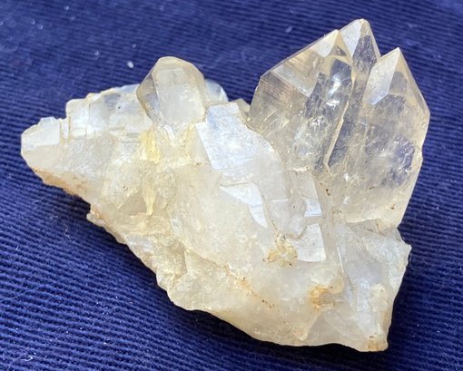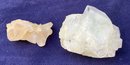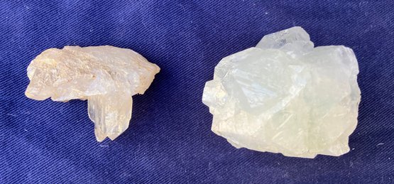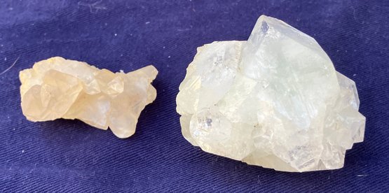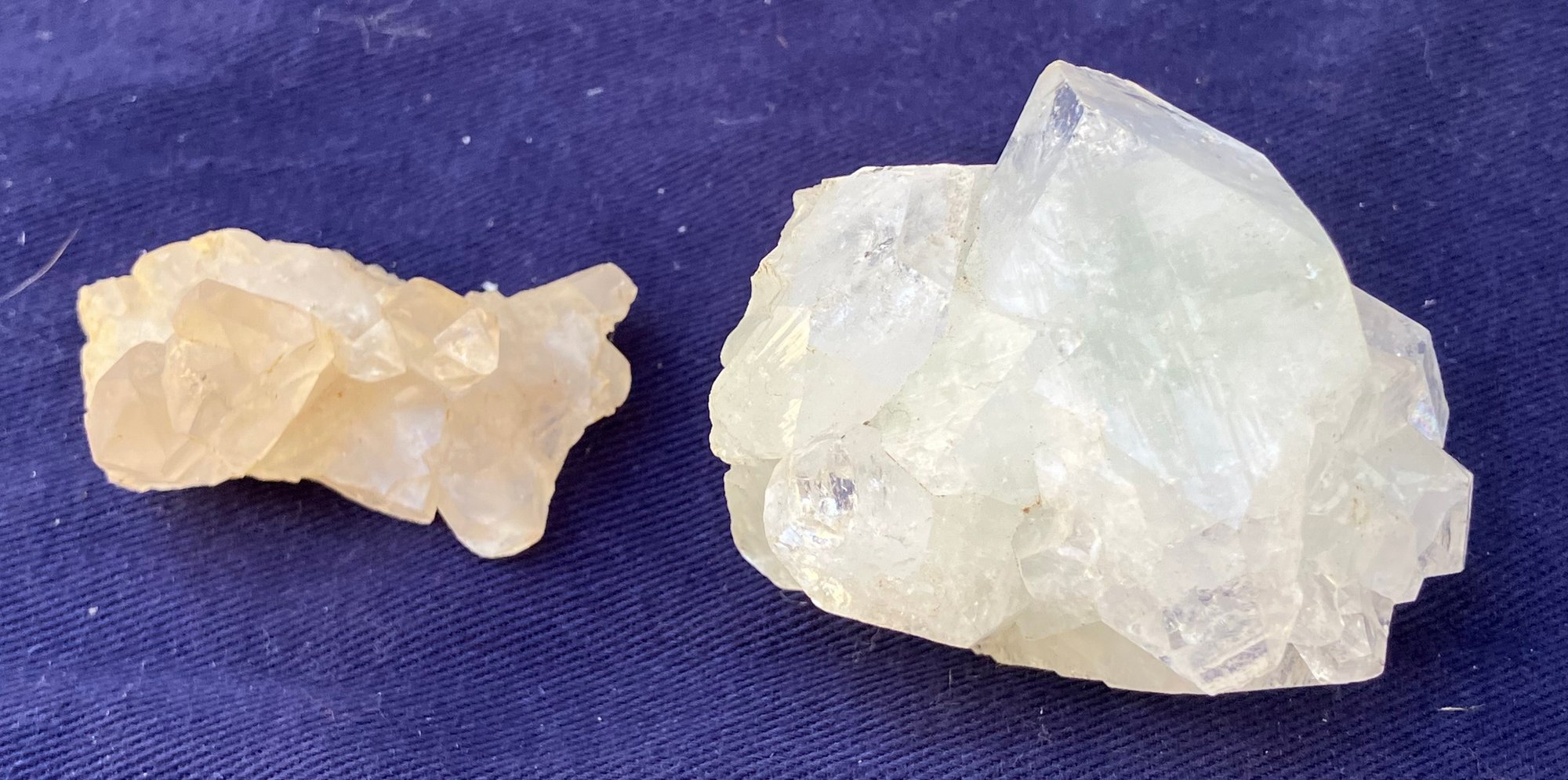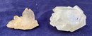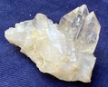 Larger quartz cluster is milky to clear. The other cluster has clearer crystals with a slight golden tint. Larger cluster measures: 1 1/2” tall x 1 3/4” wide x 2” long & the other cluster measures: 7/8” tall x 3/4” wide x 1 3/4” long. Larger cluster weighs: 2.8 ounces & the other cluster weighs: 0.6 ounces.