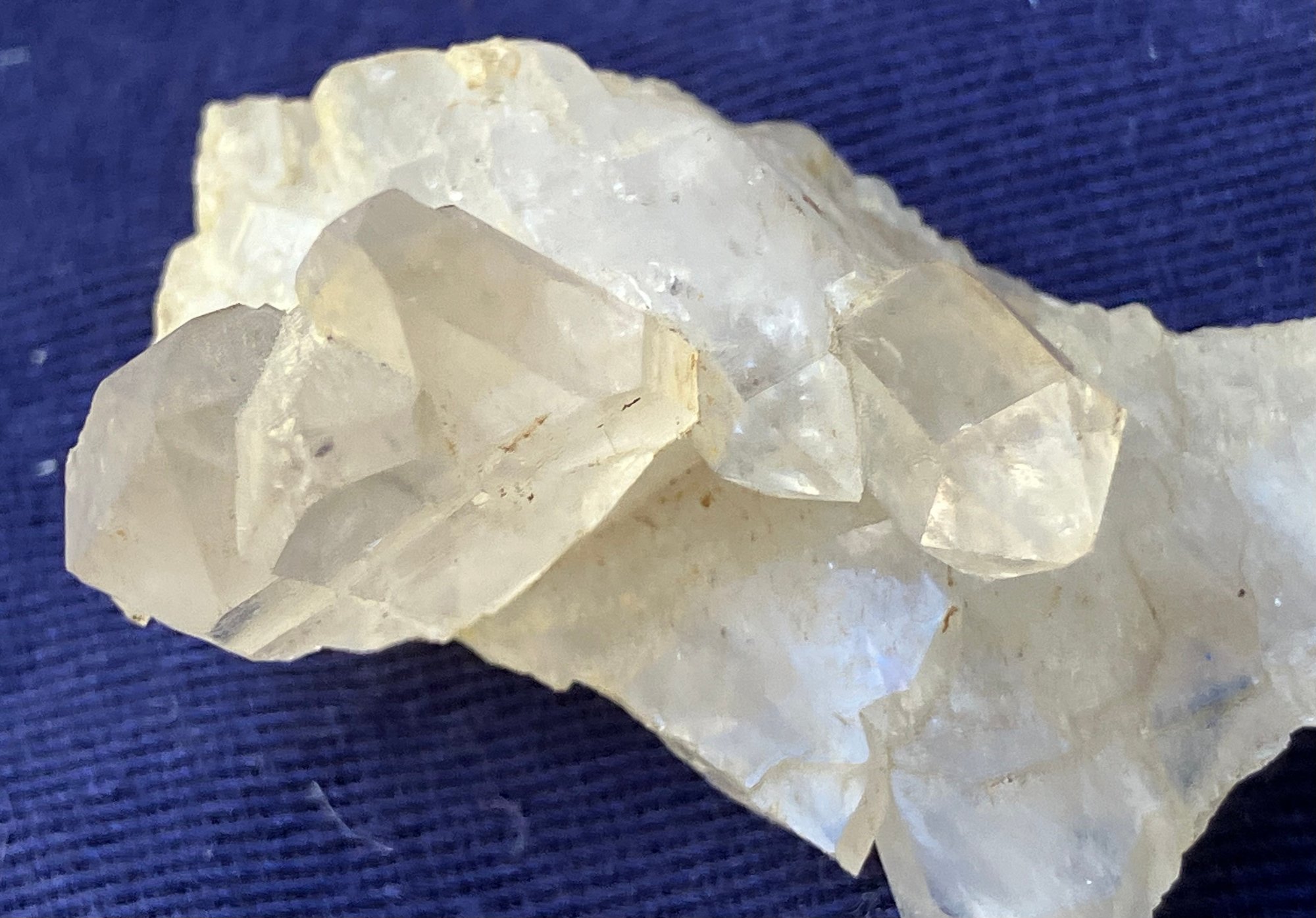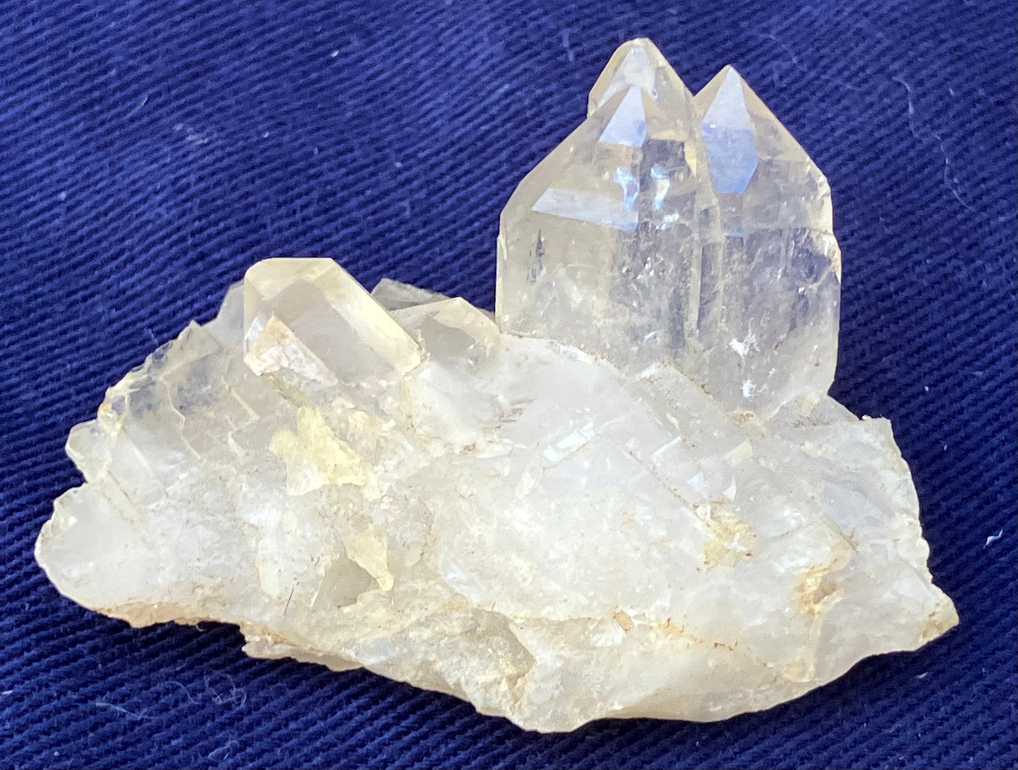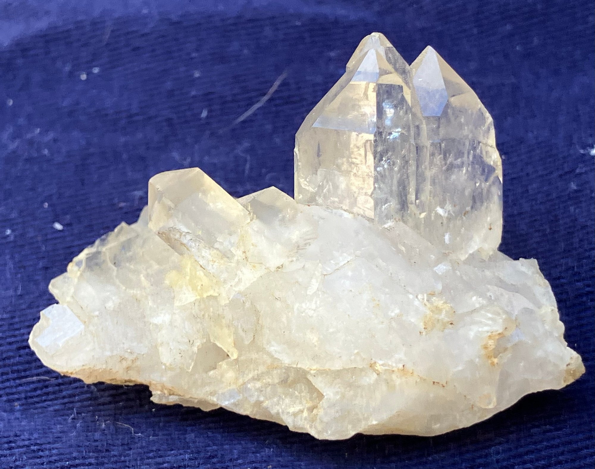 Larger quartz cluster is milky to clear. The other cluster has clearer crystals with a slight golden tint. Larger cluster measures: 1 1/2” tall x 1 3/4” wide x 2” long & the other cluster measures: 7/8” tall x 3/4” wide x 1 3/4” long. Larger cluster weighs: 2.8 ounces & the other cluster weighs: 0.6 ounces.