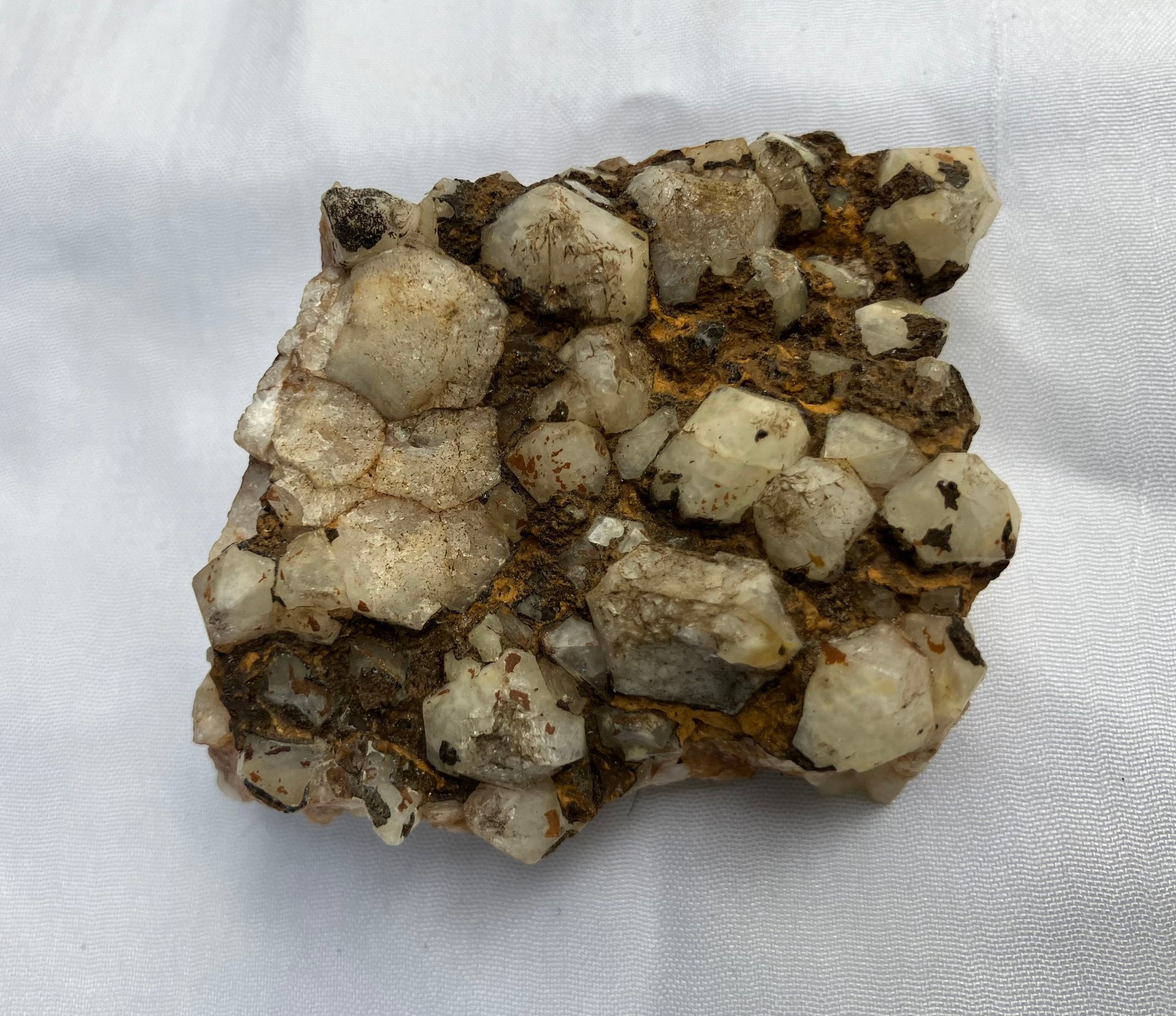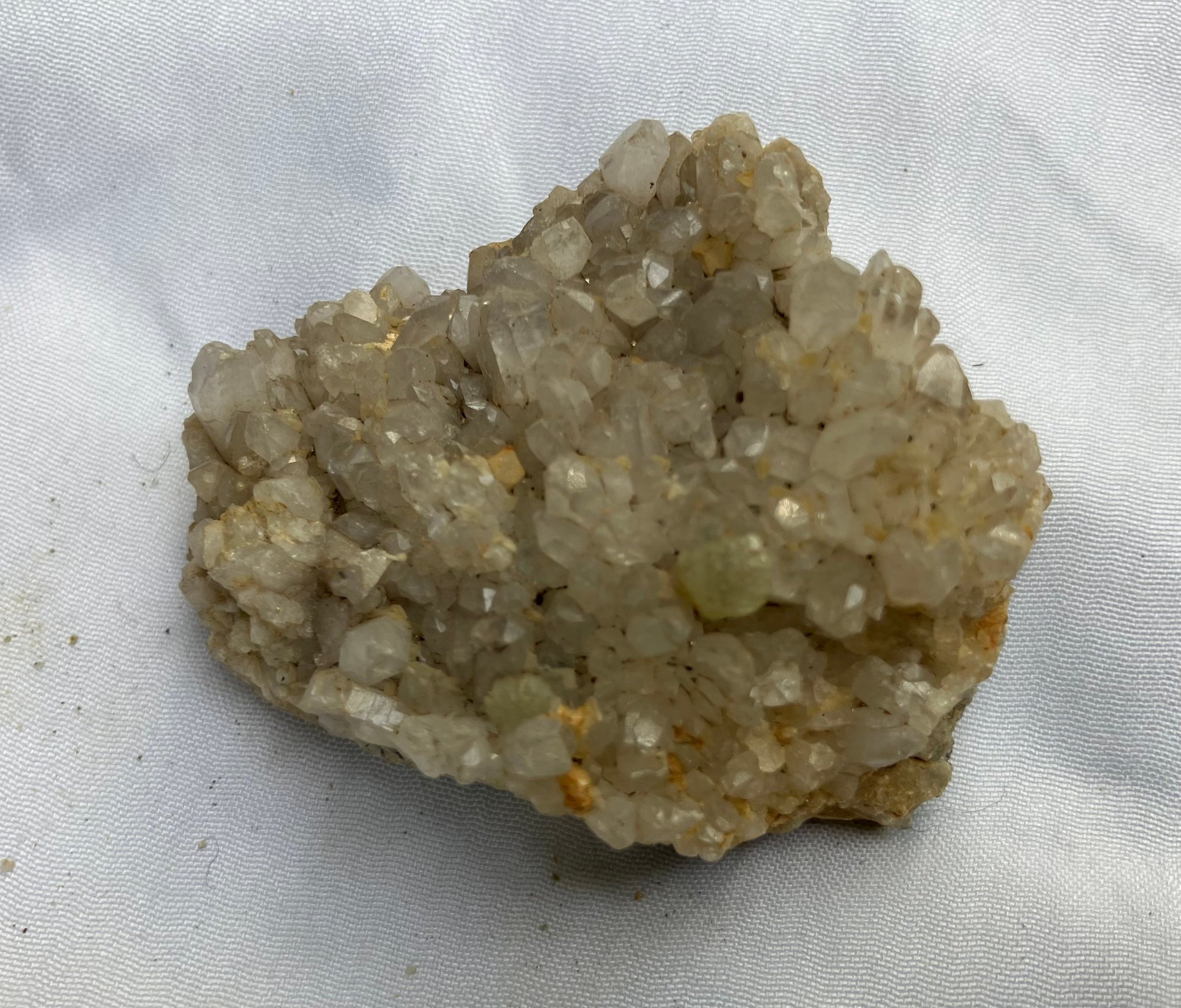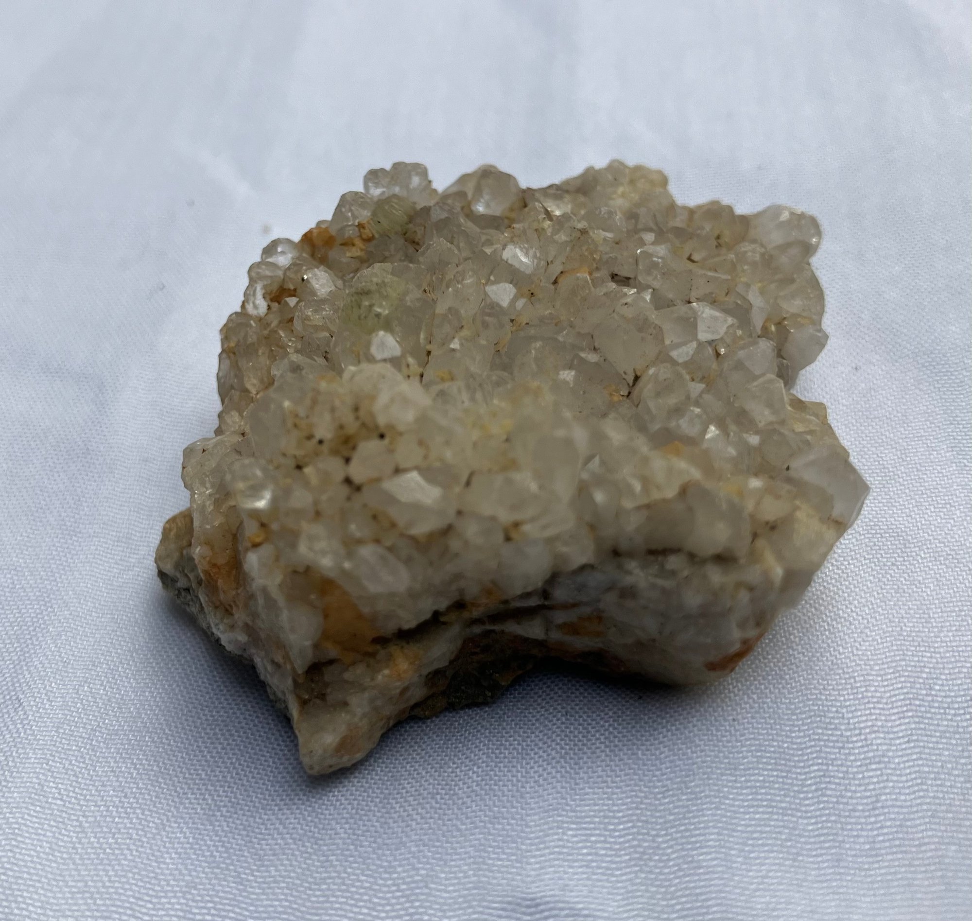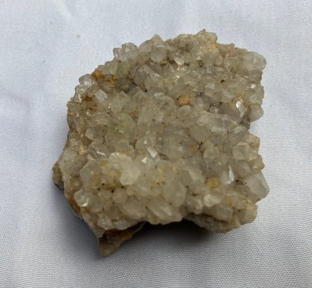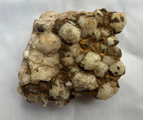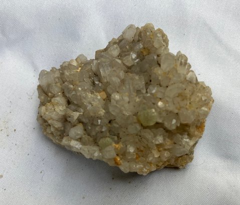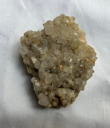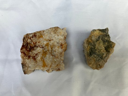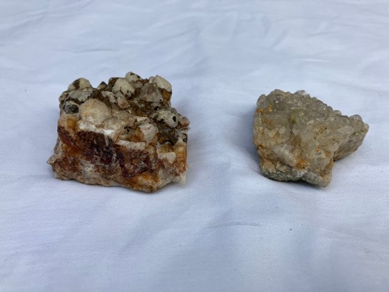 Two Quartz crystal clusters. Larger crystal has milky Quartz with iron staining. The smaller one has clearer crystals. Measurements: 2” wide x 2” long & 1 1/2” wide x 1 3/4” long.