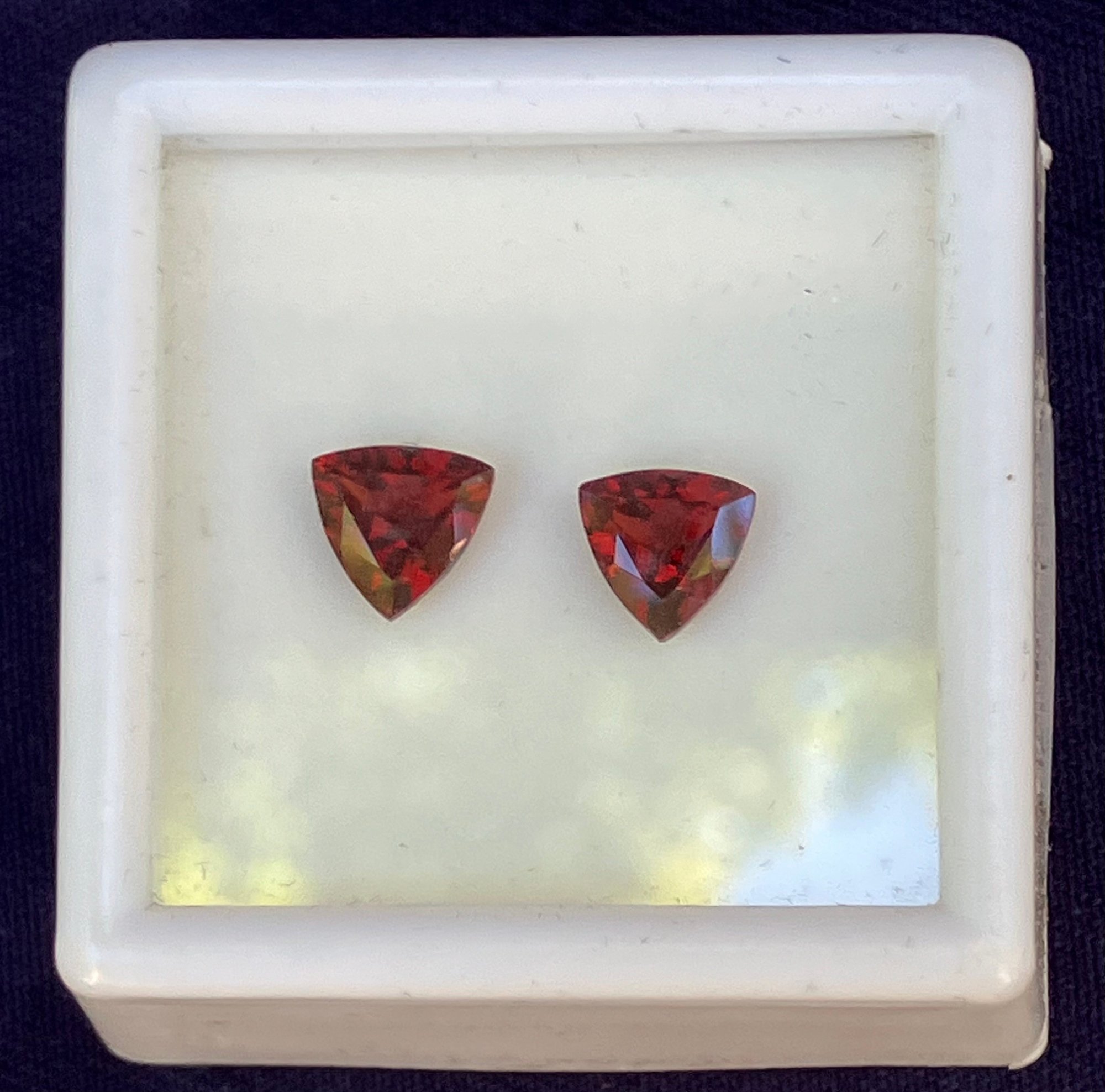 Two Tanga Garnet Trillion Cut Matched Pair 2.6 CTW. Average size is: 7 x 7 mm.