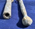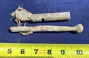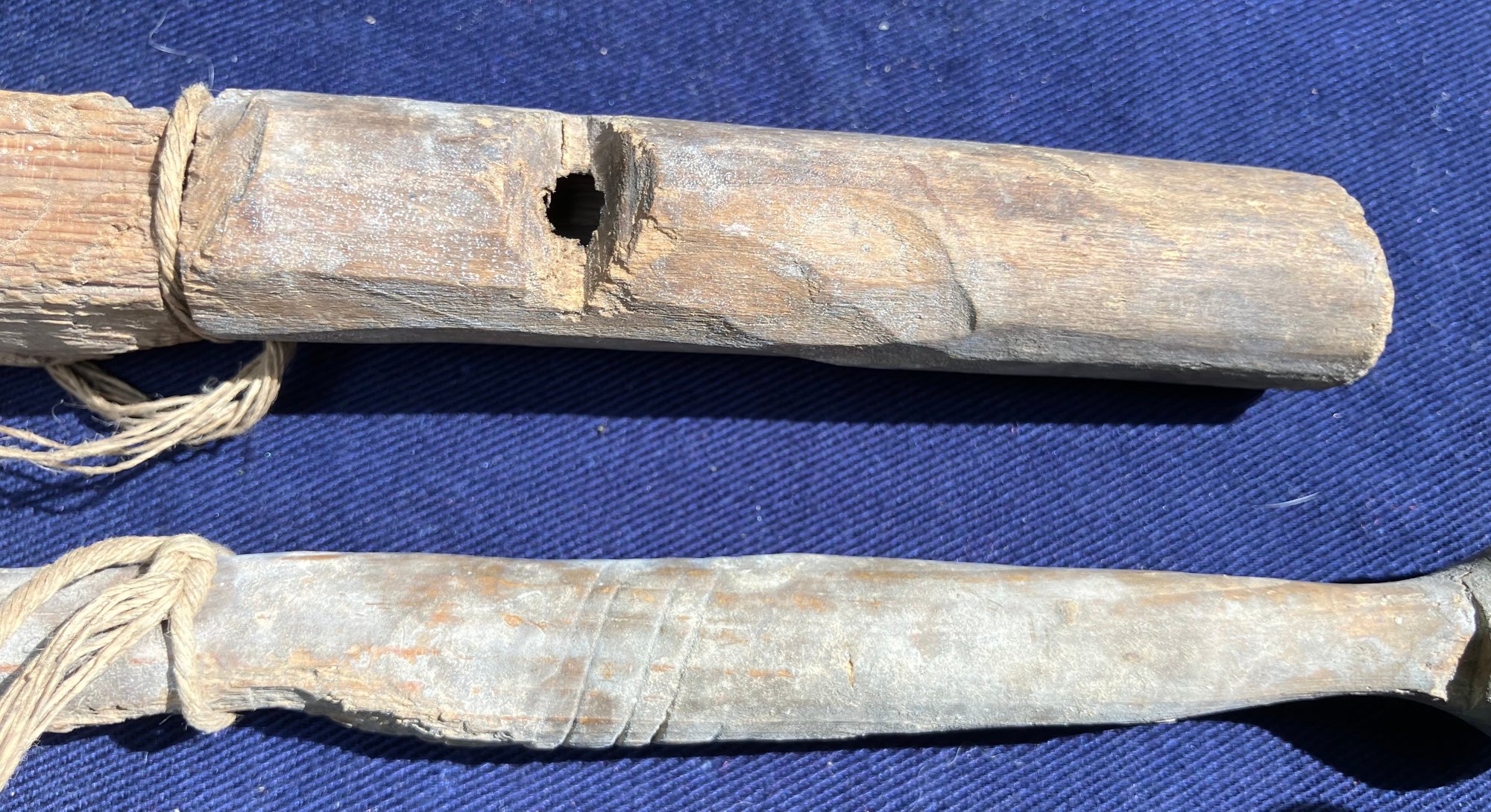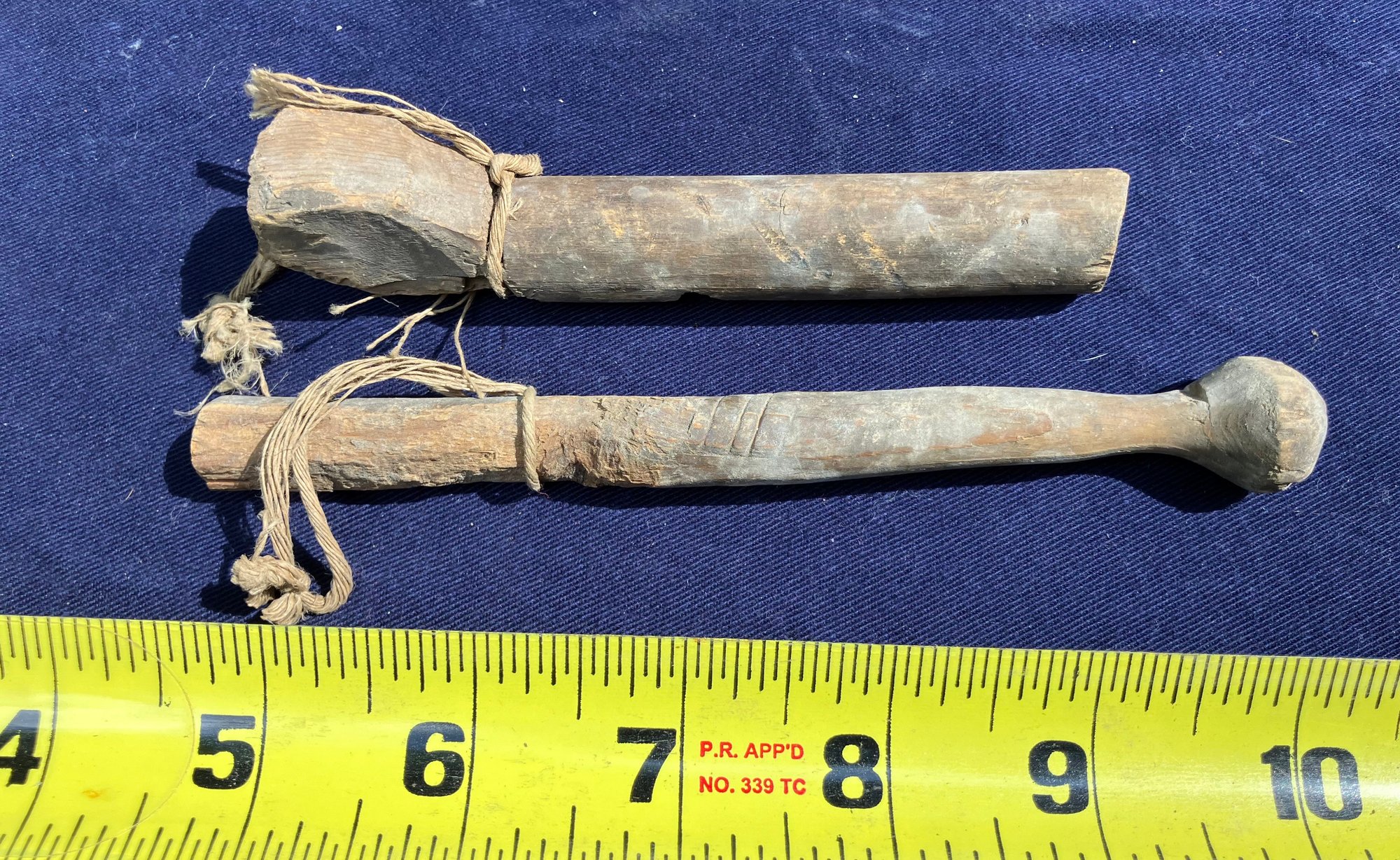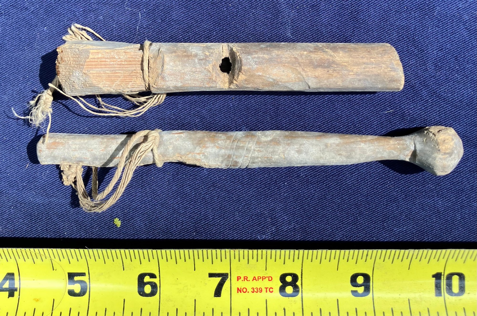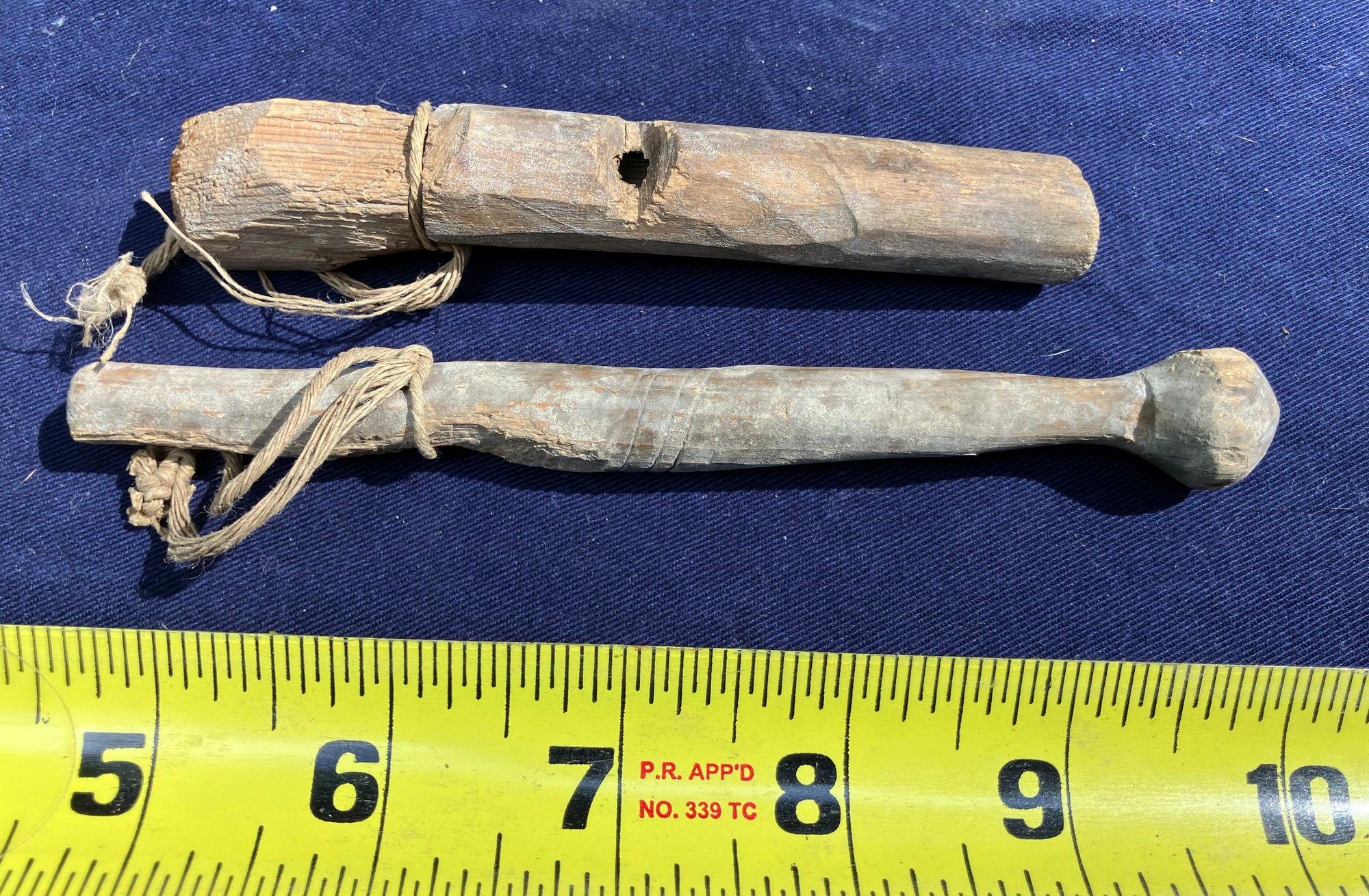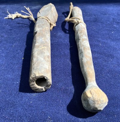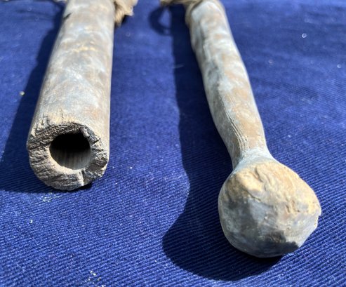 Found at a Native American dig site. Woodland or Colonial Period wooden artifacts. One appears to be a whistle of some sort but it doesn’t whistle. Both have cotton string around them.