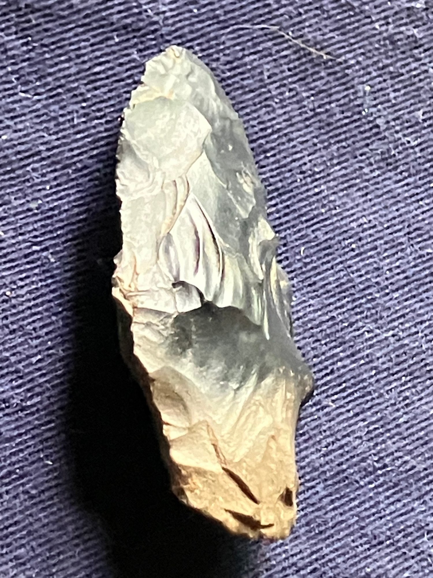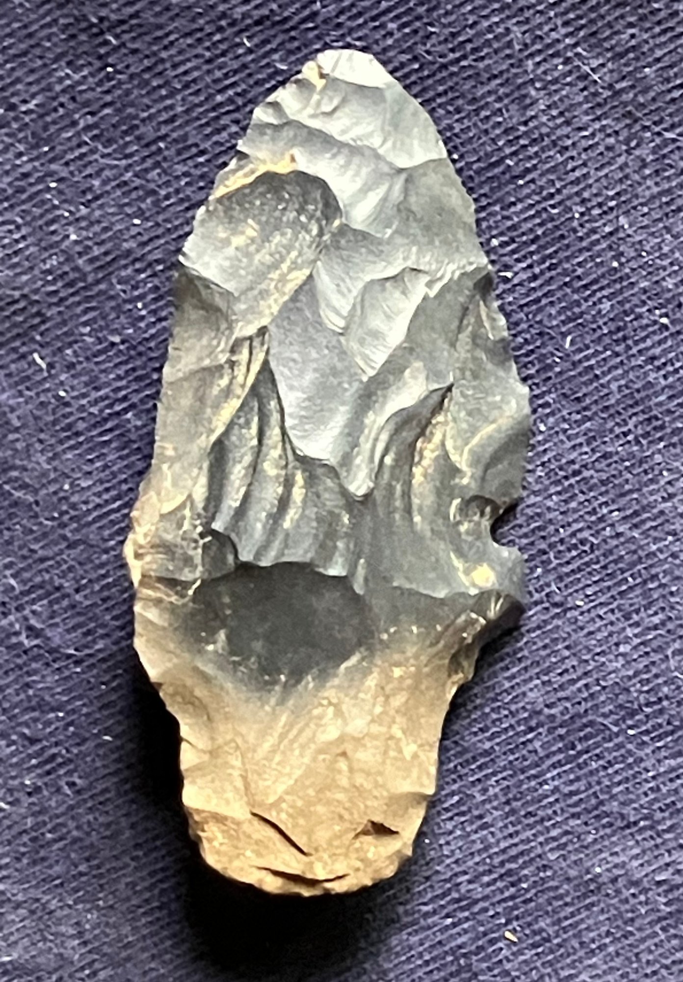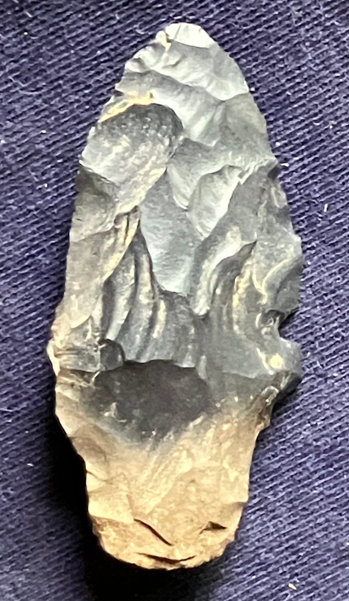 Found at a Native American dig site. Made of chirt. Bi-facial projectile point with rare notch on one side. Excellent condition.