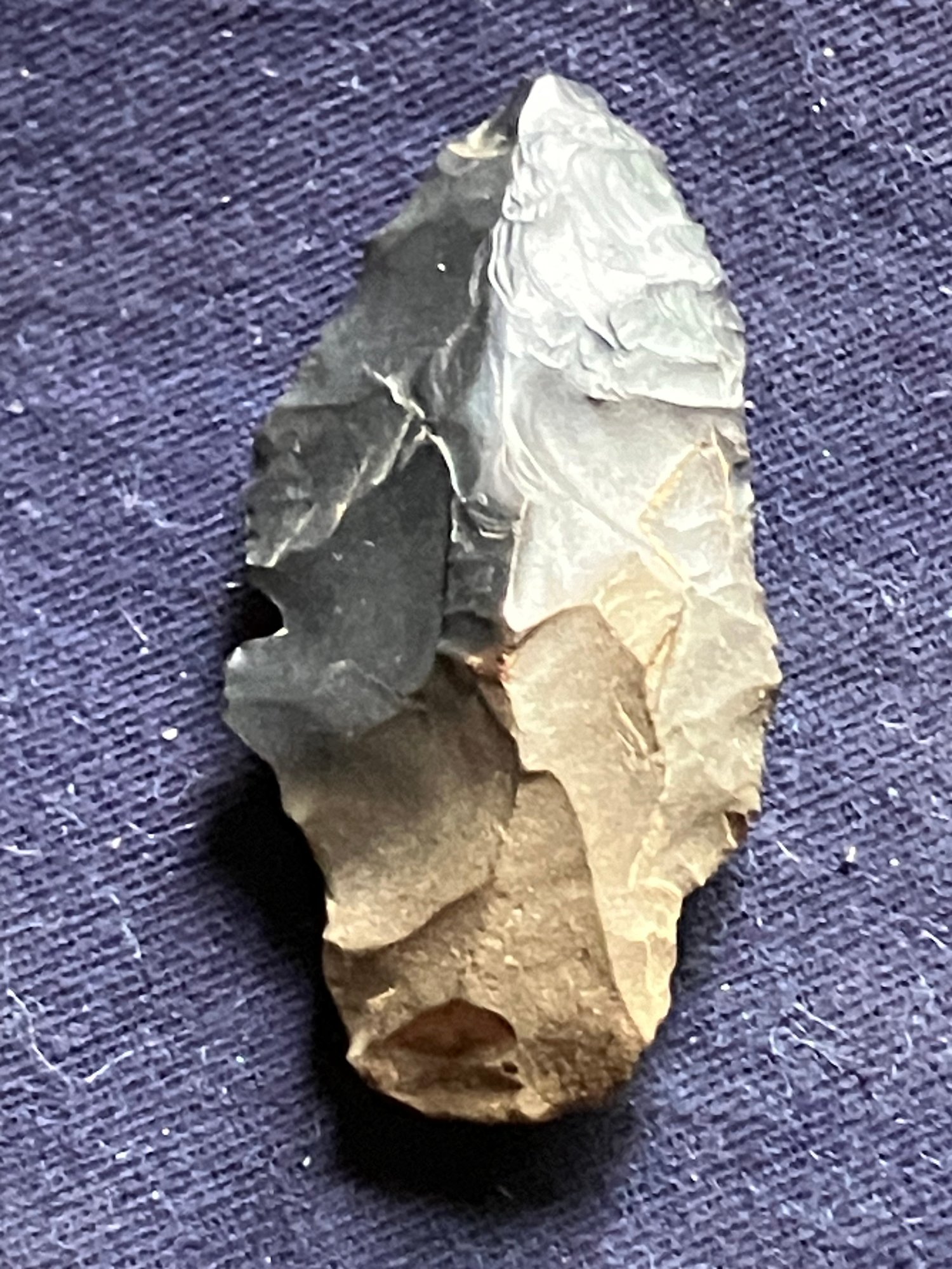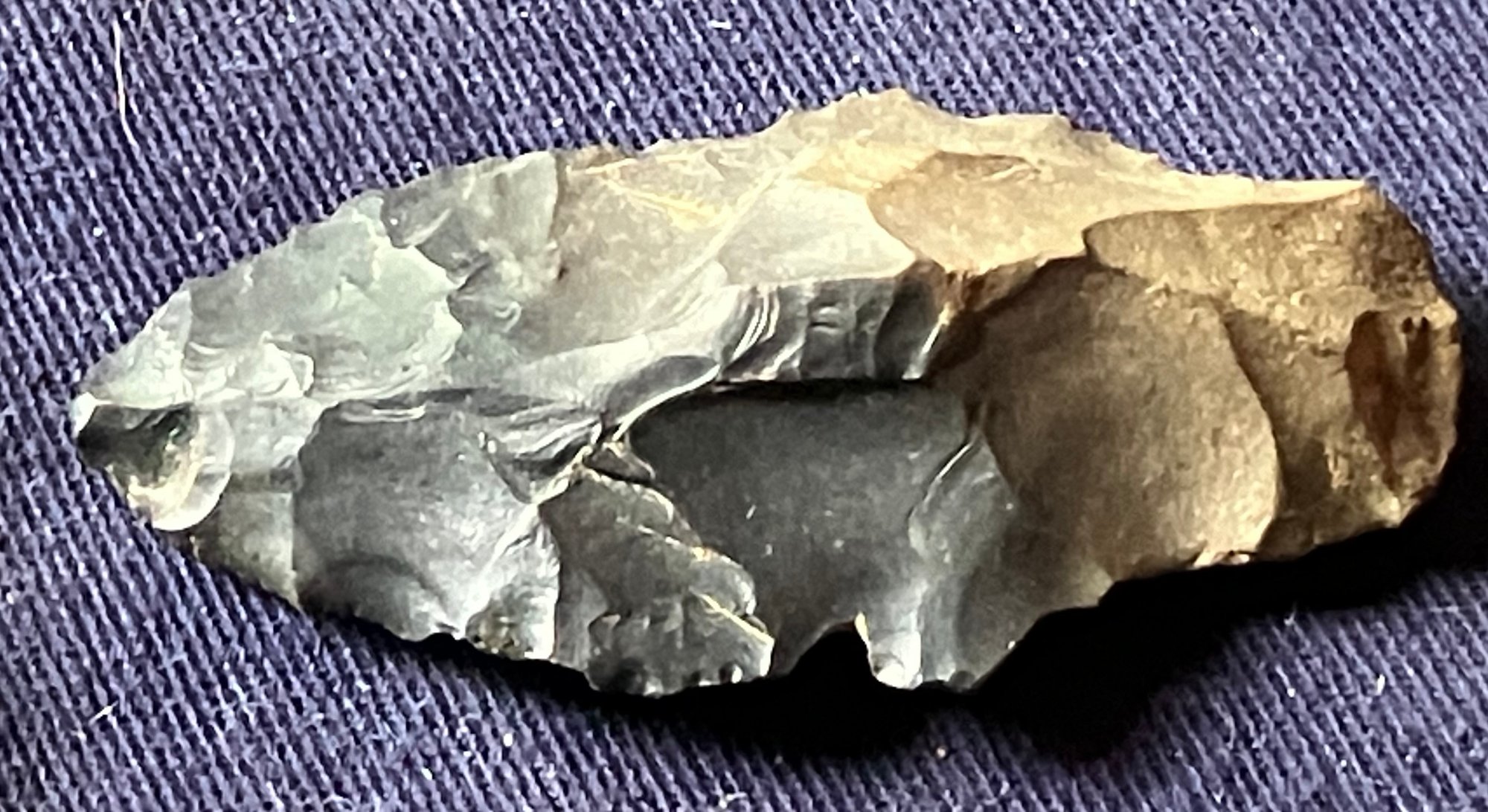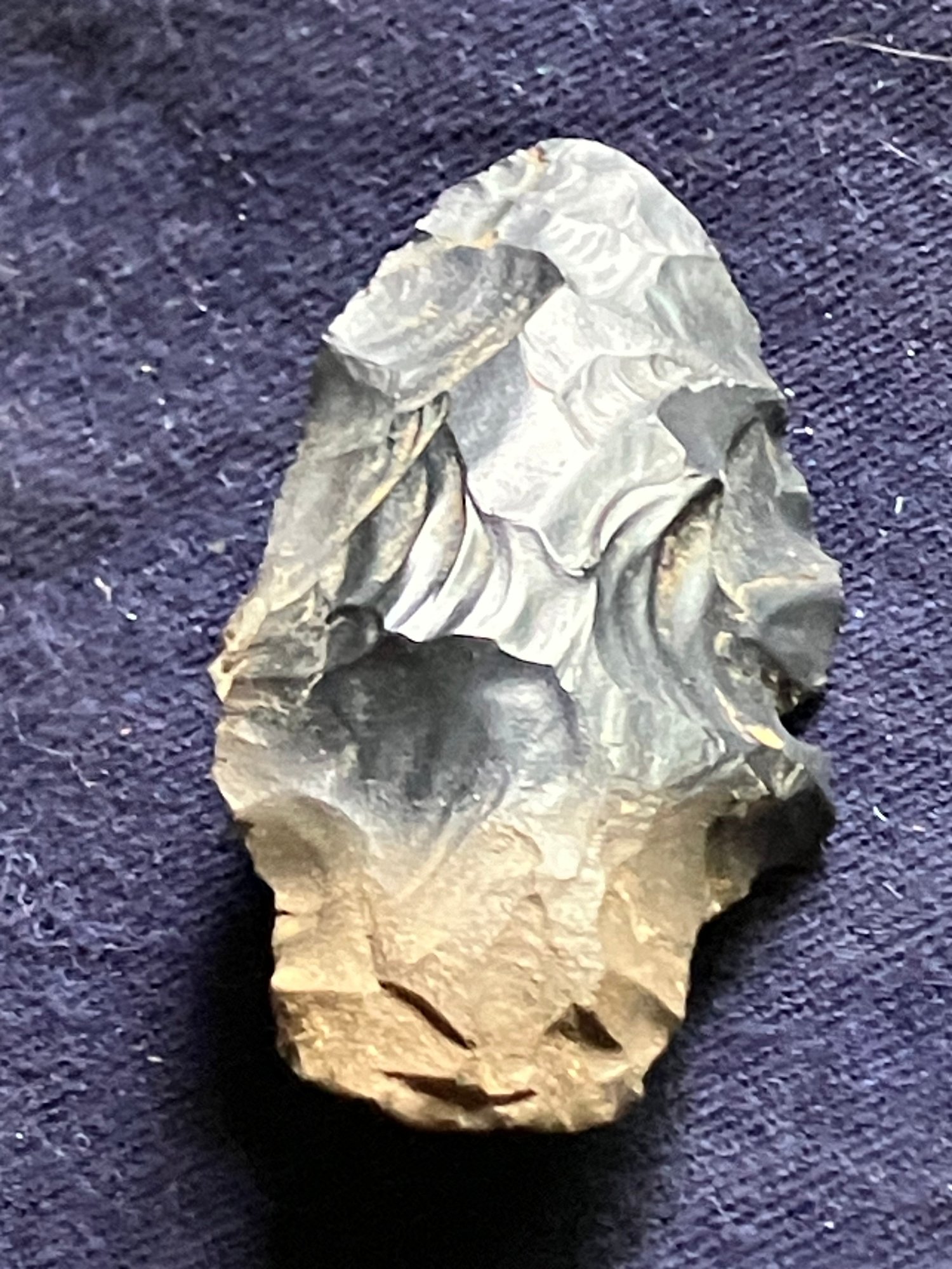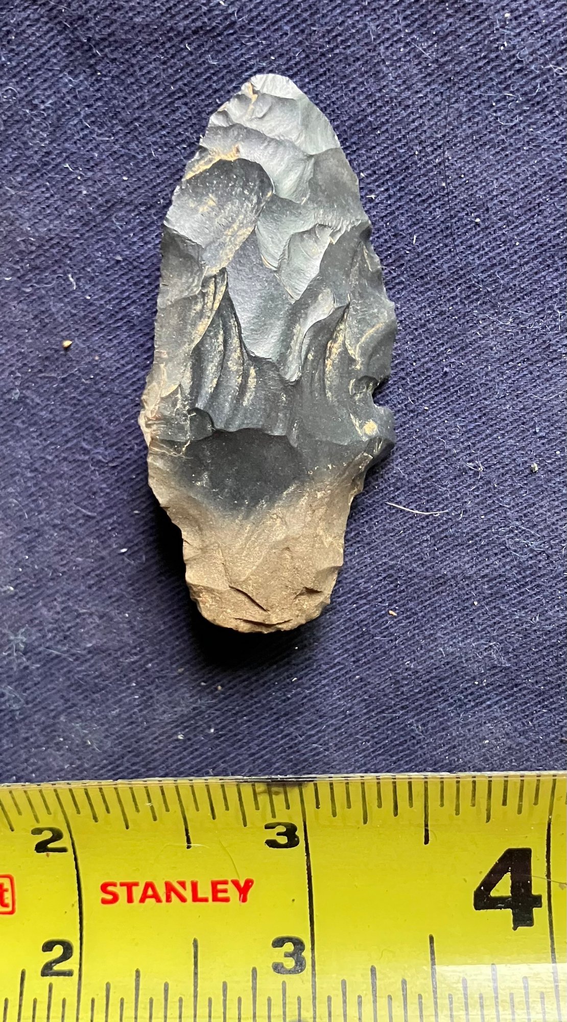 Found at a Native American dig site. Made of chirt. Bi-facial projectile point with rare notch on one side. Excellent condition.