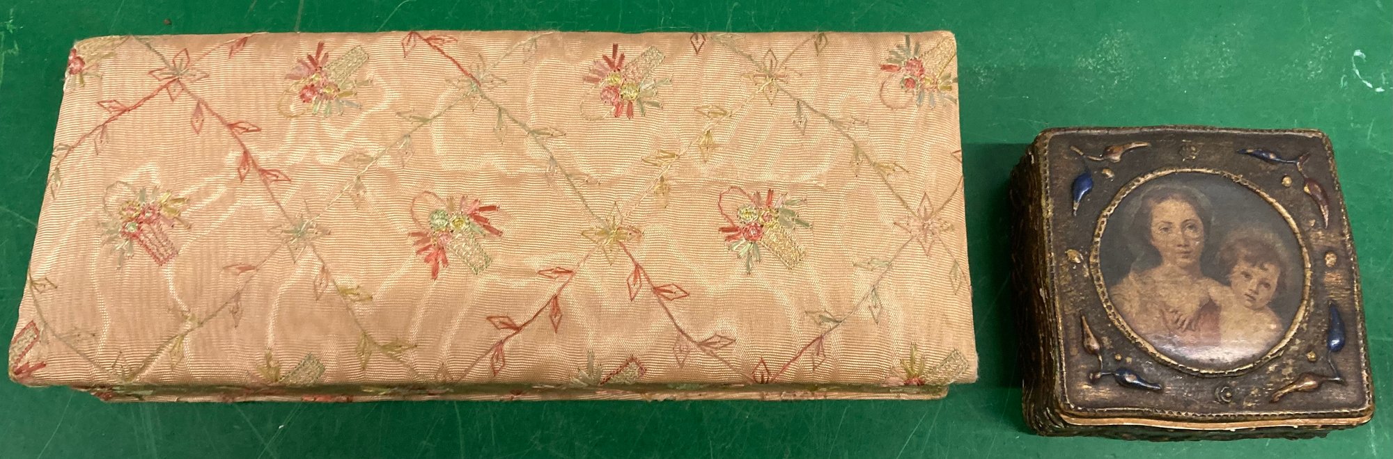 Victorian Portrait On Box And Upholstered Box. Dimensions are: 1 3/4” tall x 4” wide and 2 1/4” tall x 12” wide x 5” deep. Good condition.