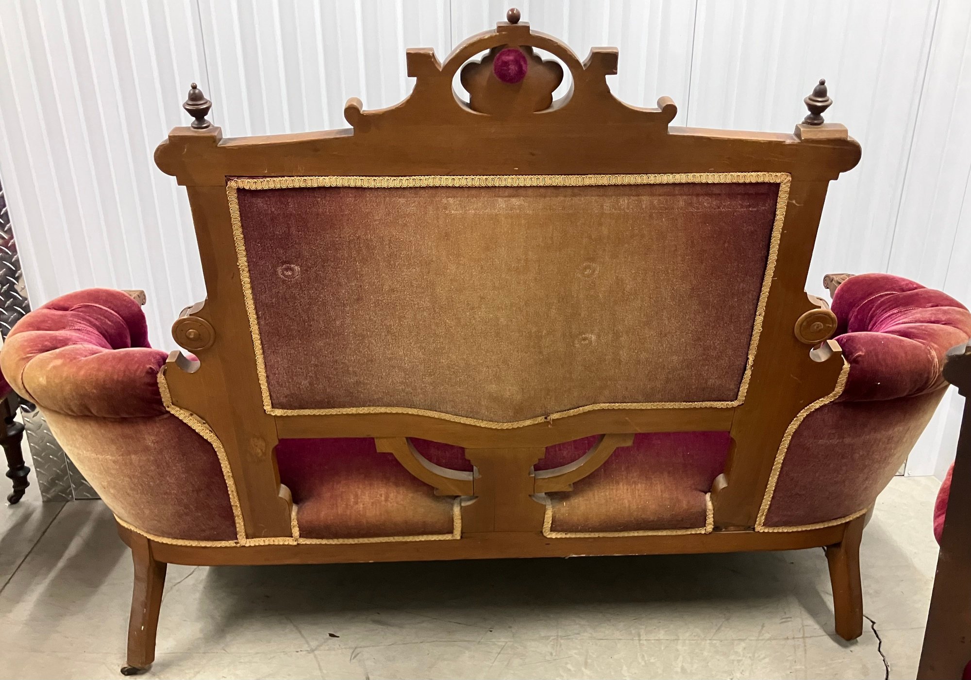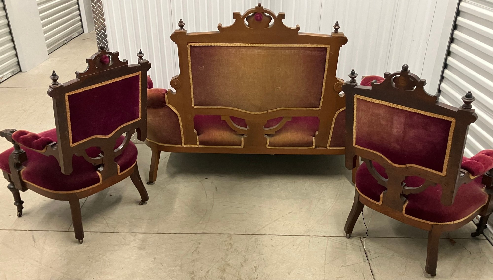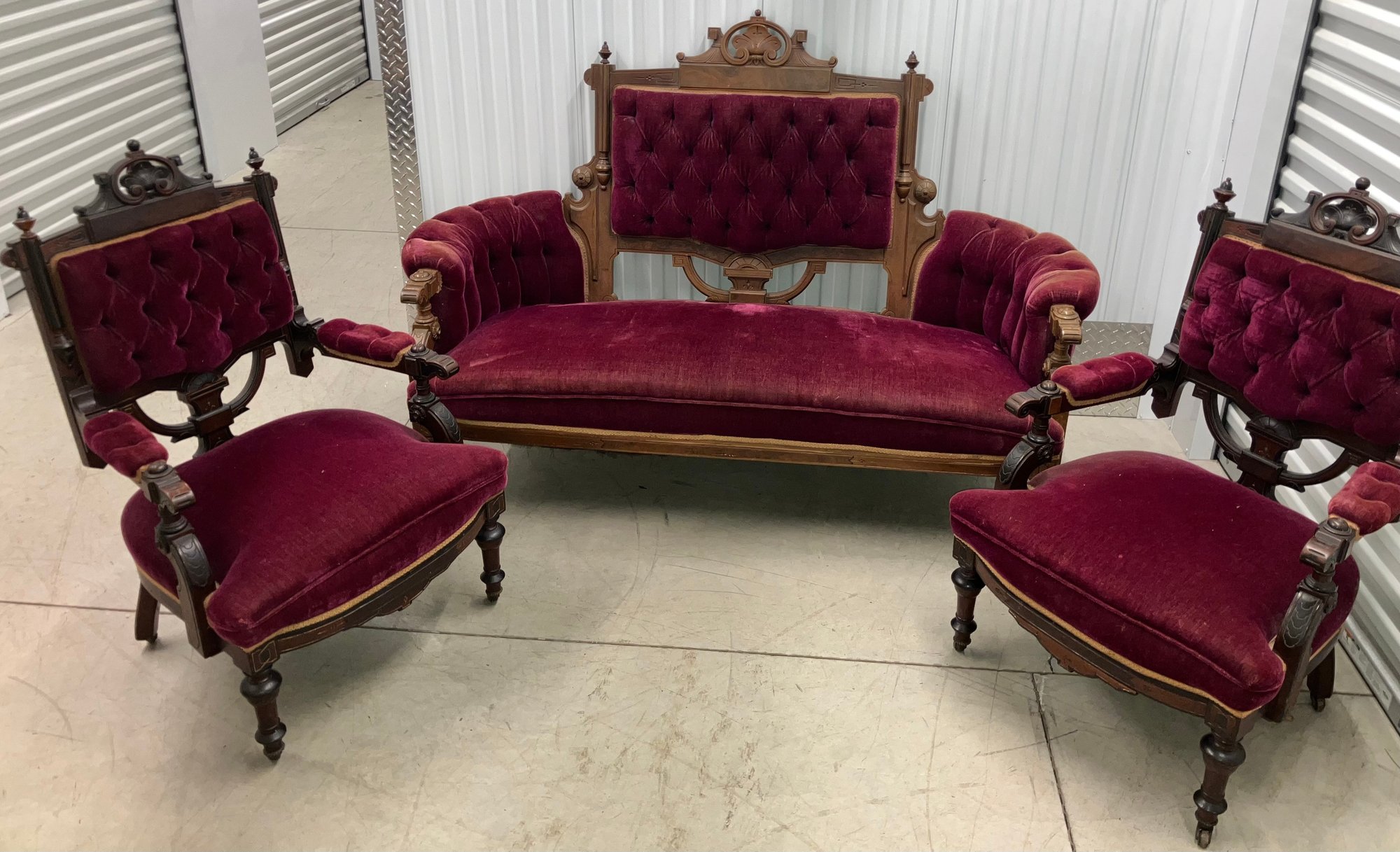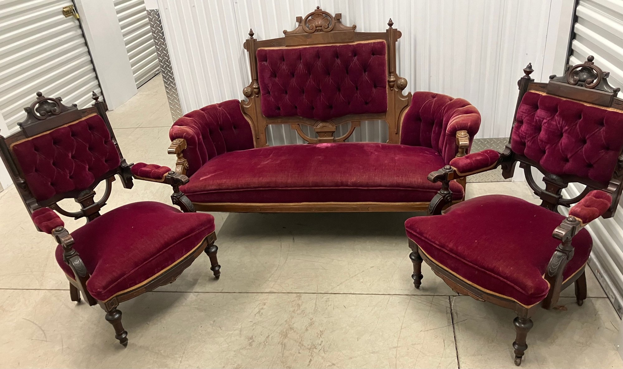 Victorian set. There is a sofa and two chairs. The set is upholstered in a burgundy color velvet fabric. The two arm chairs have ebonizing on them. There is also a matching set of four chairs up for auction. Dimensions are: sofa: 46” tall x 65” wide x 25” deep, the two arm chairs are: 41 1/2” tall x 25 1/4” wide x 24” deep. There is a set is solid and sturdy.