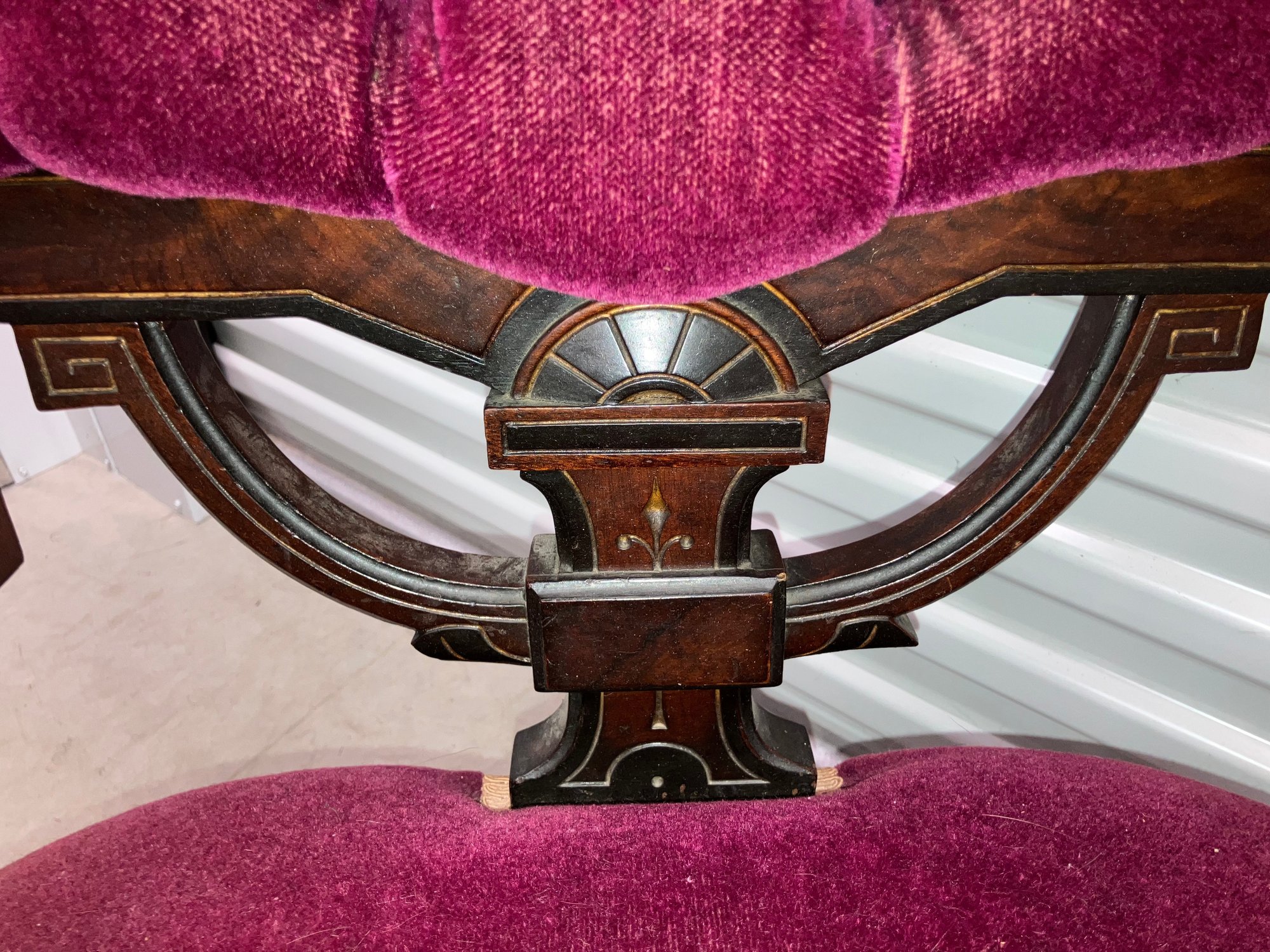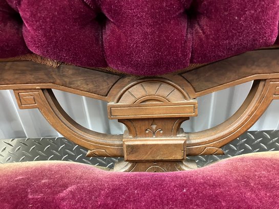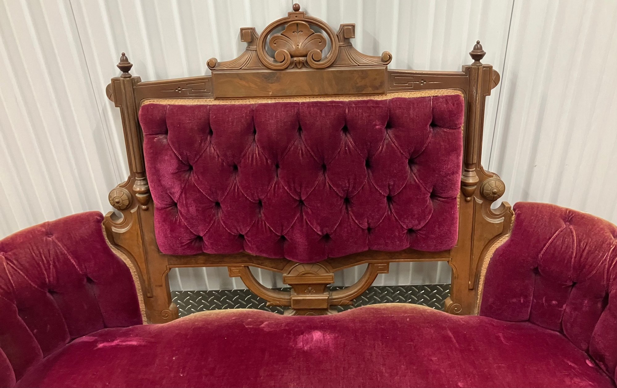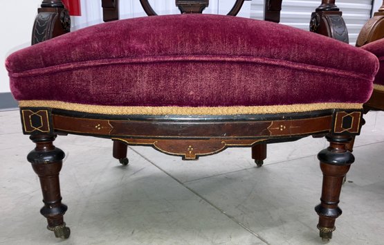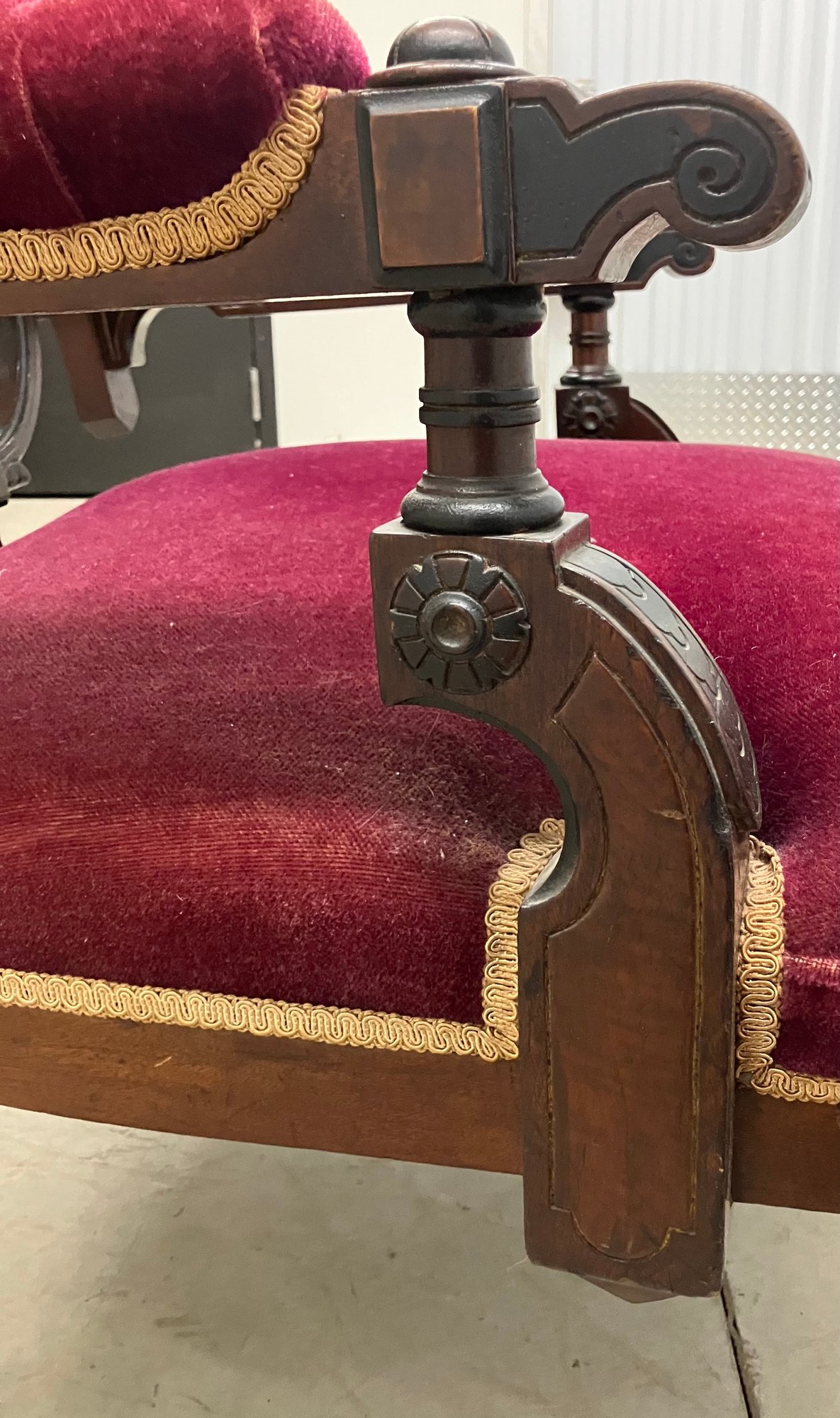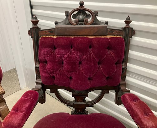 Victorian set. There is a sofa and two chairs. The set is upholstered in a burgundy color velvet fabric. The two arm chairs have ebonizing on them. There is also a matching set of four chairs up for auction. Dimensions are: sofa: 46” tall x 65” wide x 25” deep, the two arm chairs are: 41 1/2” tall x 25 1/4” wide x 24” deep. There is a set is solid and sturdy.