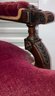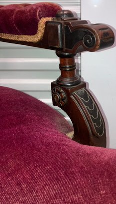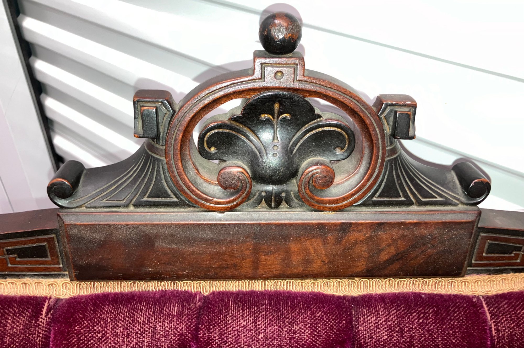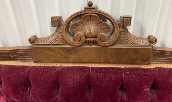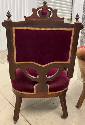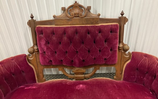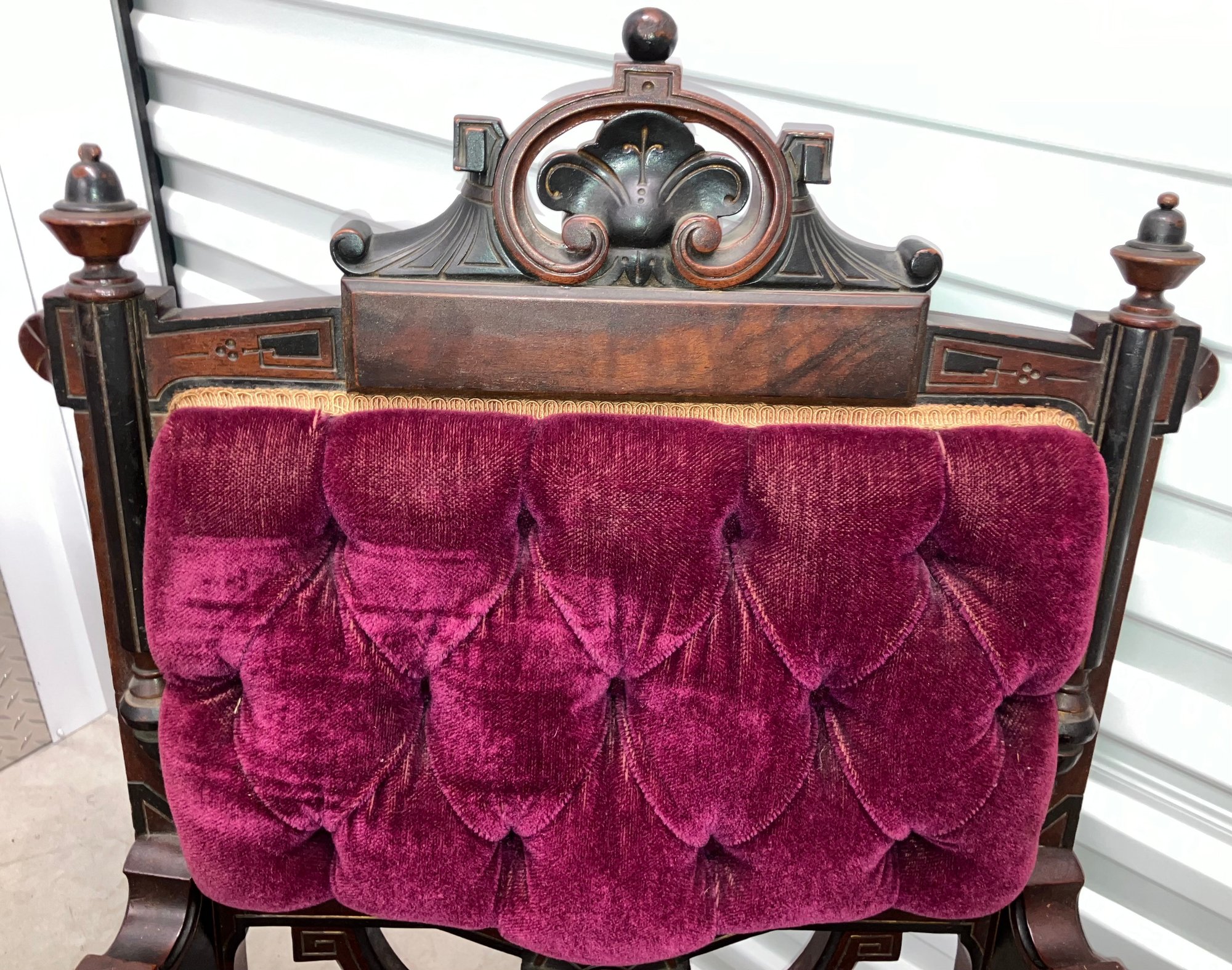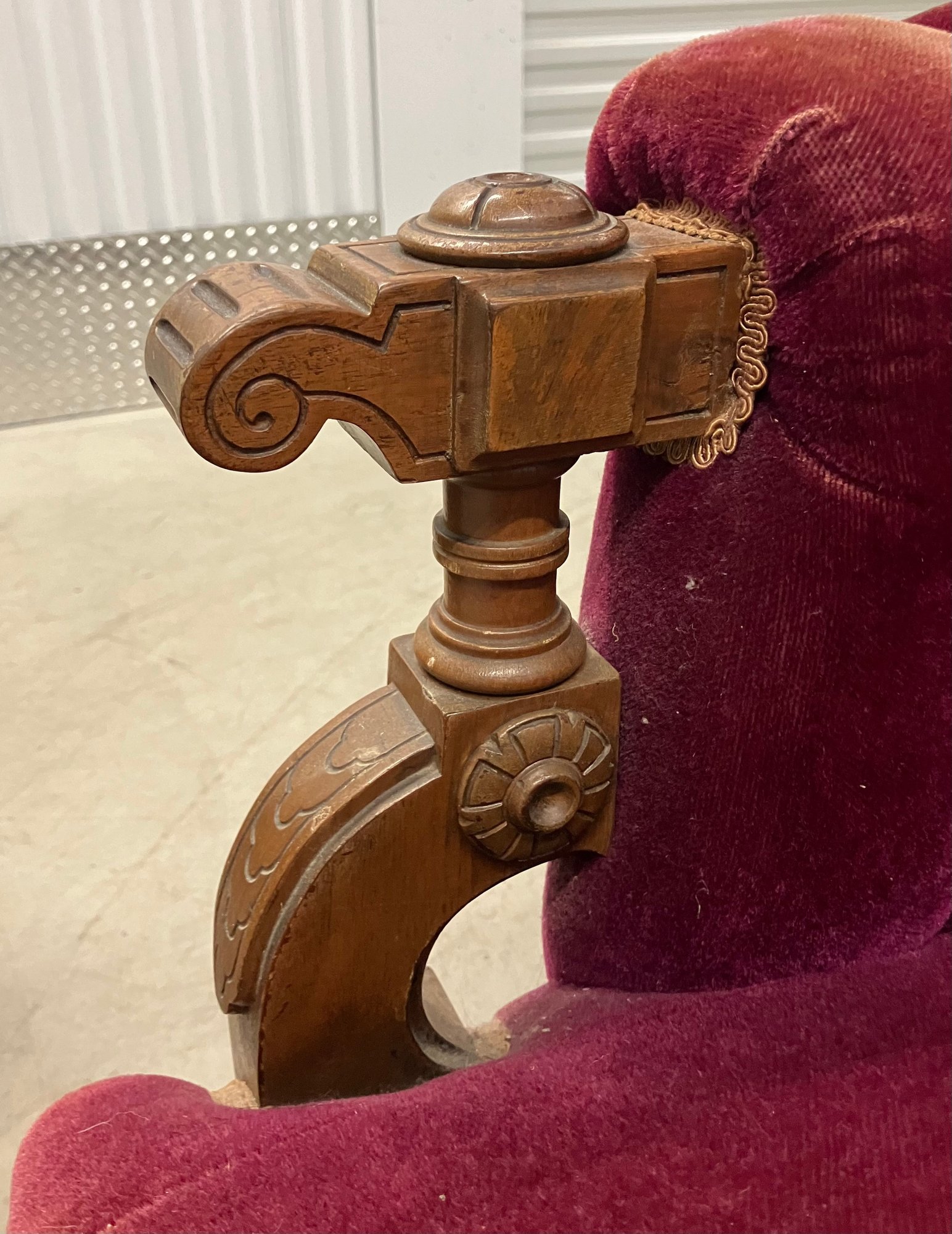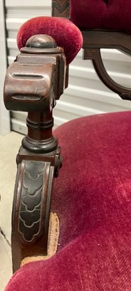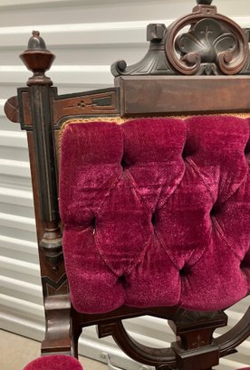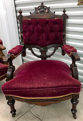 Victorian set. There is a sofa and two chairs. The set is upholstered in a burgundy color velvet fabric. The two arm chairs have ebonizing on them. There is also a matching set of four chairs up for auction. Dimensions are: sofa: 46” tall x 65” wide x 25” deep, the two arm chairs are: 41 1/2” tall x 25 1/4” wide x 24” deep. There is a set is solid and sturdy.
