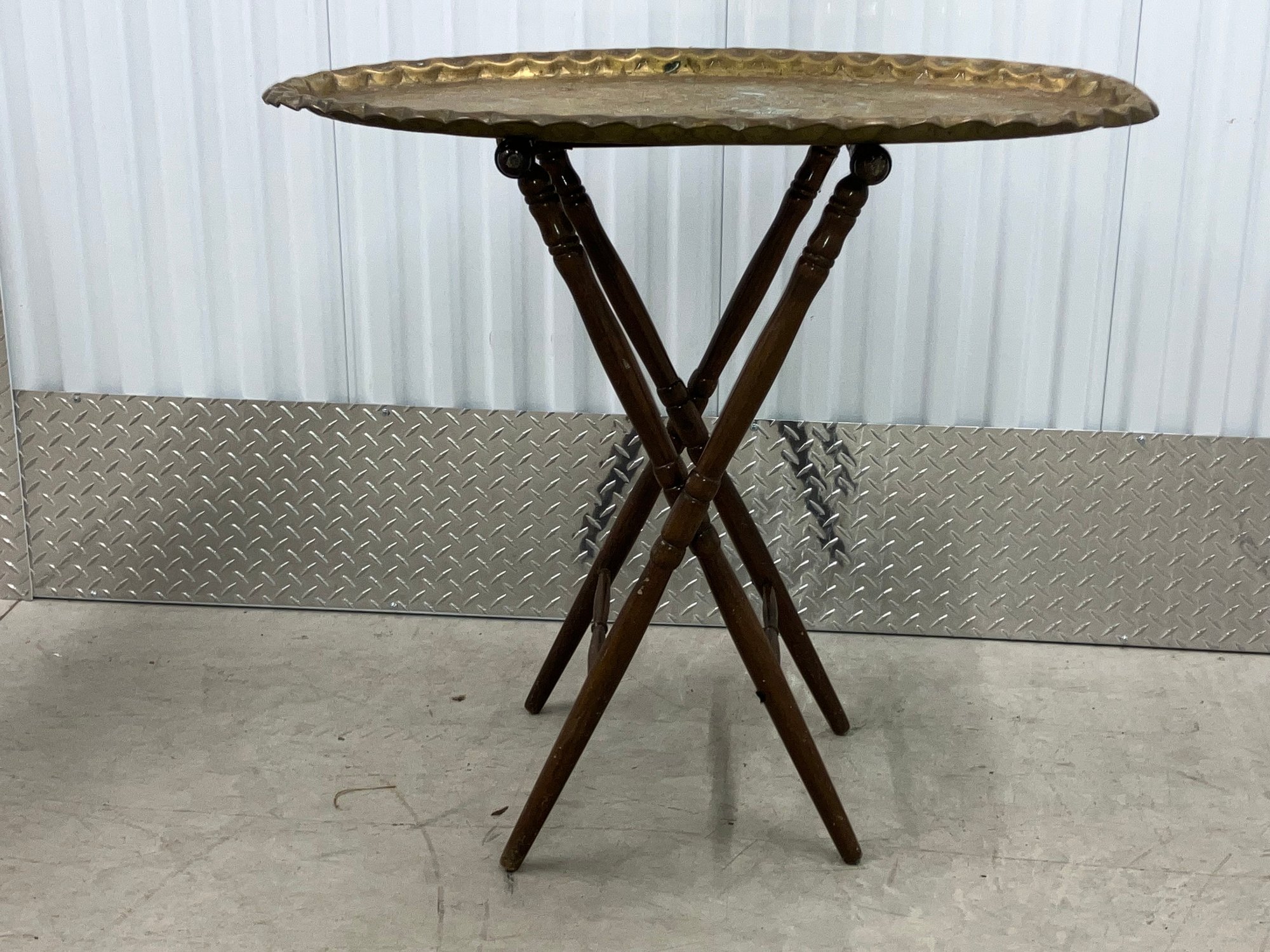 Vintage brass tray with stand. Tray has heavily carved design with a scalloped edge. Good patina to the tray. The stand is very sturdy. Dimensions of the tray are: 3/4” tall x 36” wide x 22 1/2” deep and the stand measures: 32 1/2” tall x 15” wide. Good condition.