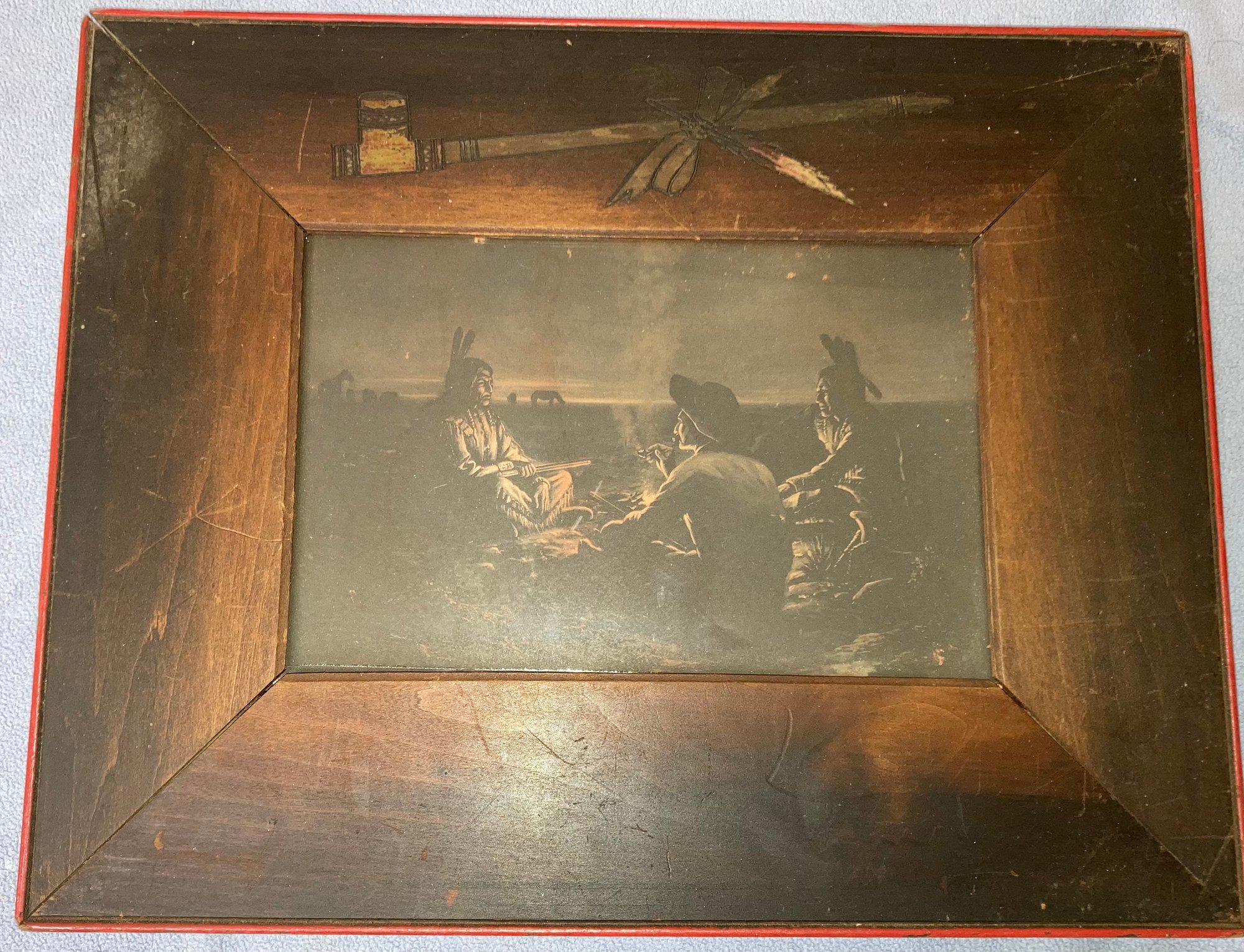 Vintage Native American print in matching frame. Frame dimensions are: 11 3/4” tall x 15 3/4” wide. Print dimensions: 6” tall x 8 3/4” wide. O diction: See photos.