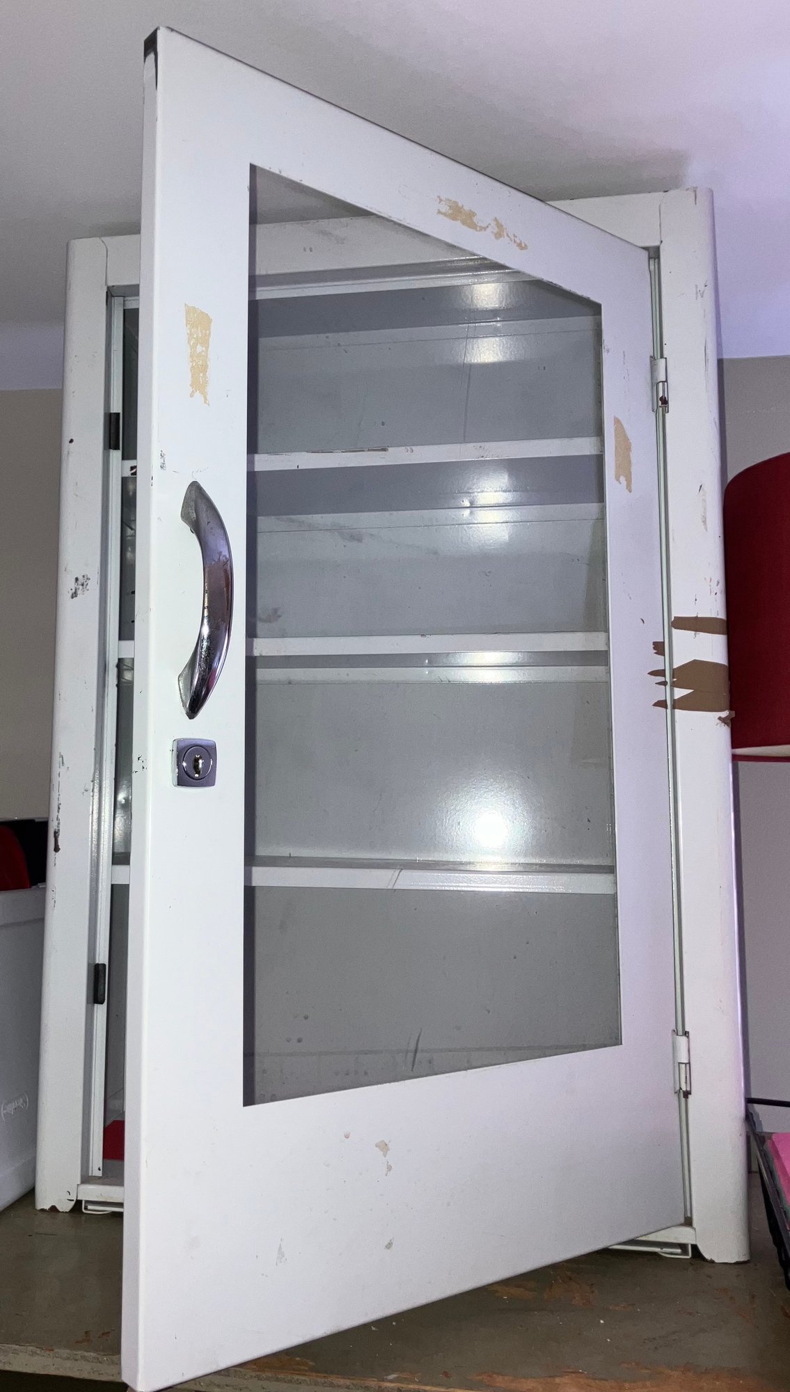 White Metal cabinet with glass door. Dimensions: 27” tall x 18 1/2” wide x 9” deep. Good condition.