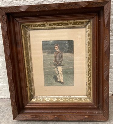 Wood frame print of guy playing tennis. Frame dimensions are: 15” tall x 13” wide. Print dimensions: 10” tall x 8” wide. Condition: See photos.