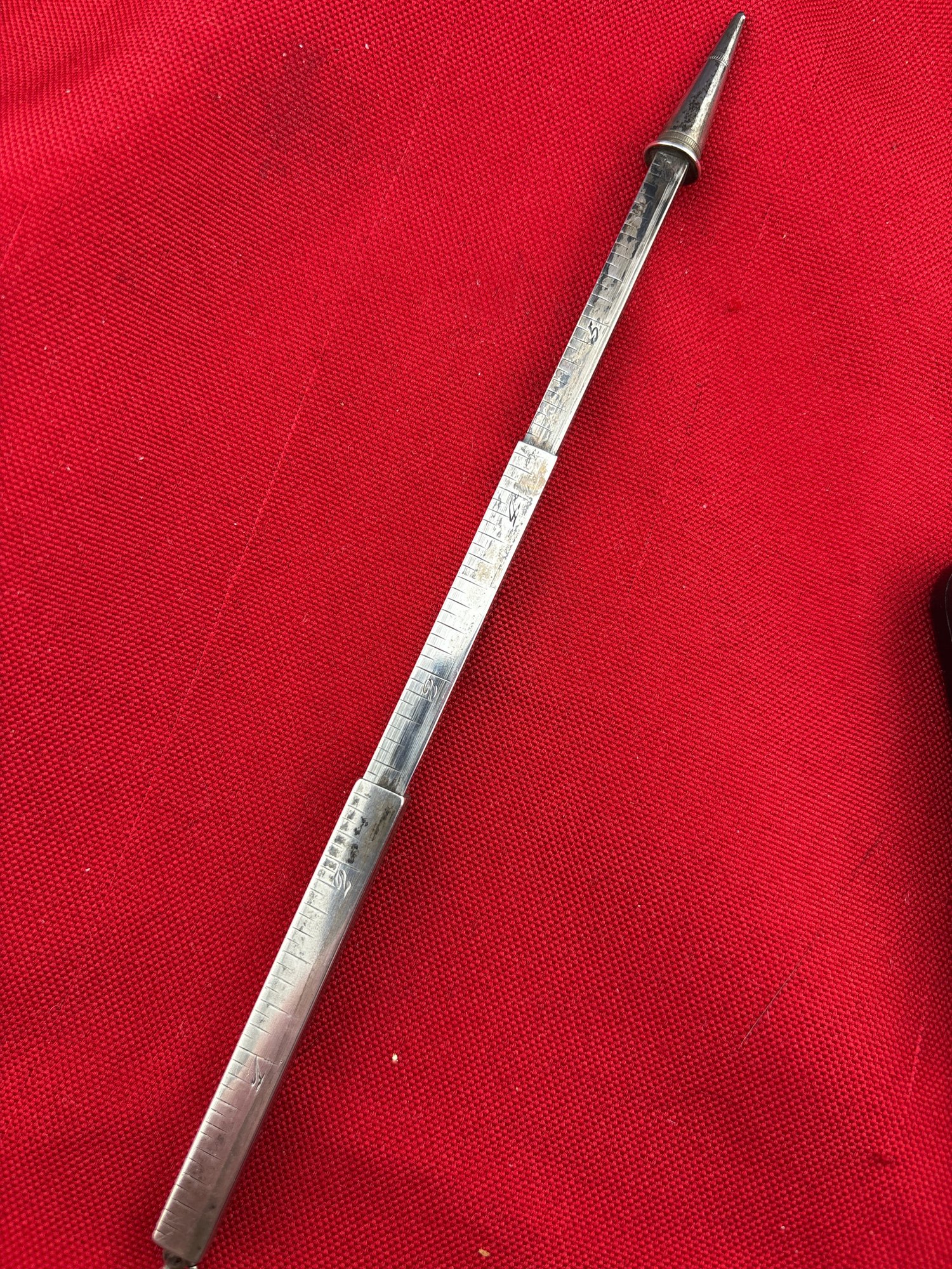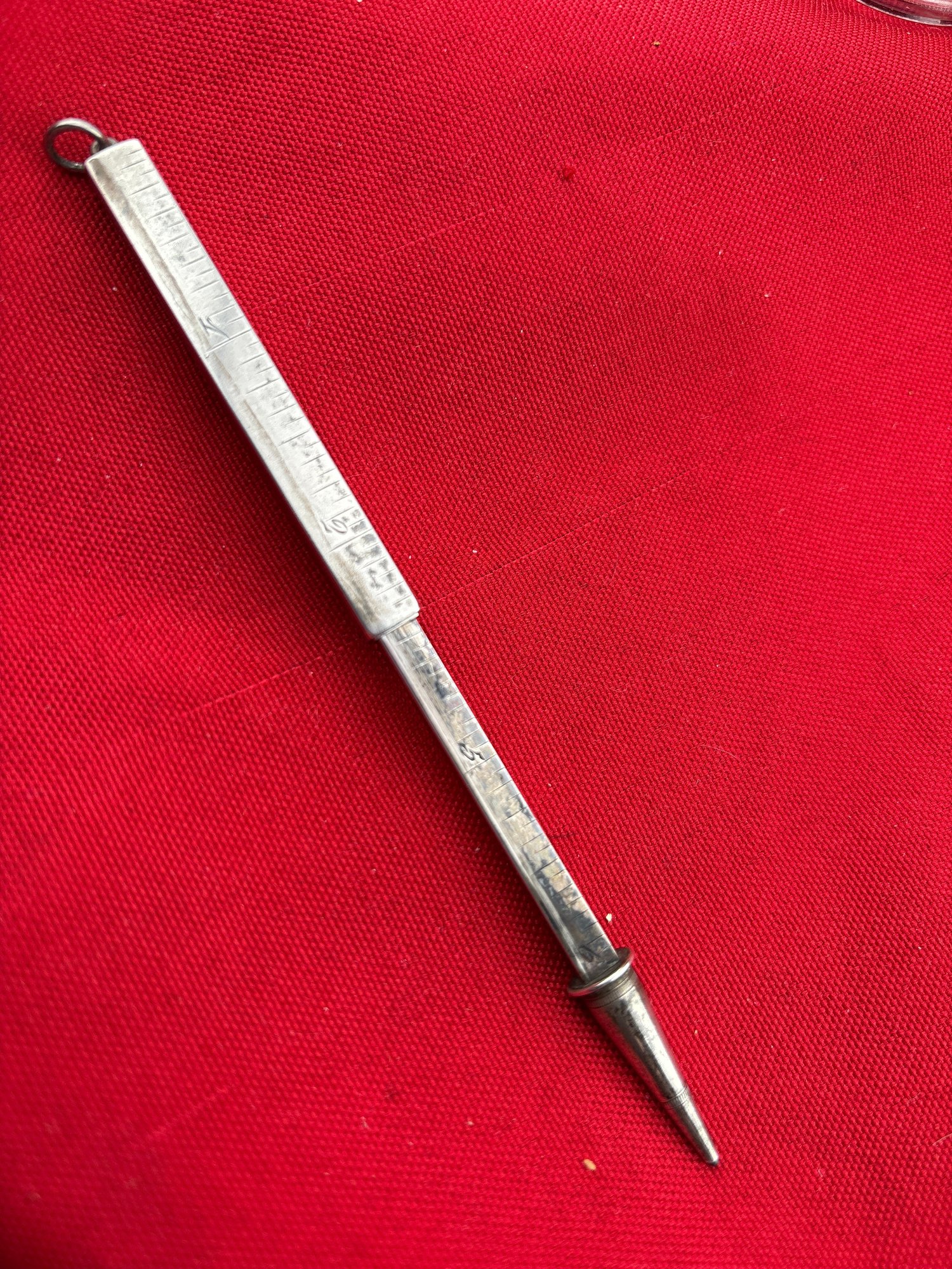 Great sterling silver telescoping ruler pencil from the 1920s . So cool . It measures 7 inches long open and 2 1/2 inches closed and weighs 17.7 grams. We use UPS for shipping. We drop off the Monday after the auction and they will contact you and you pay them directly.