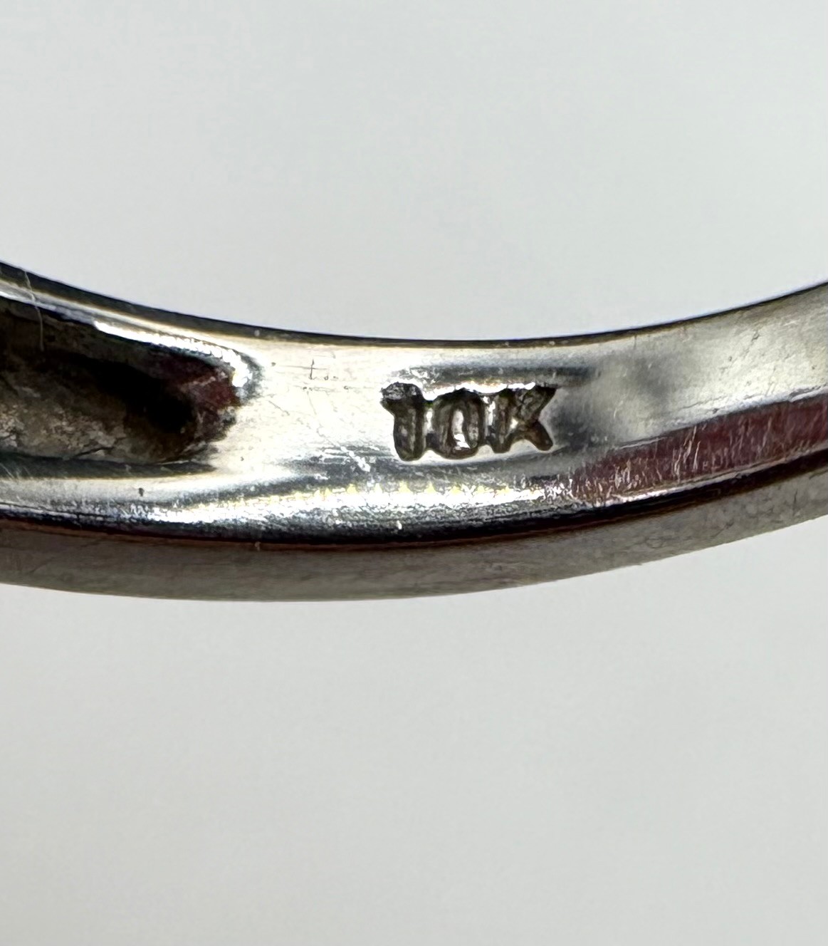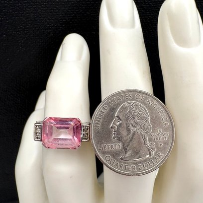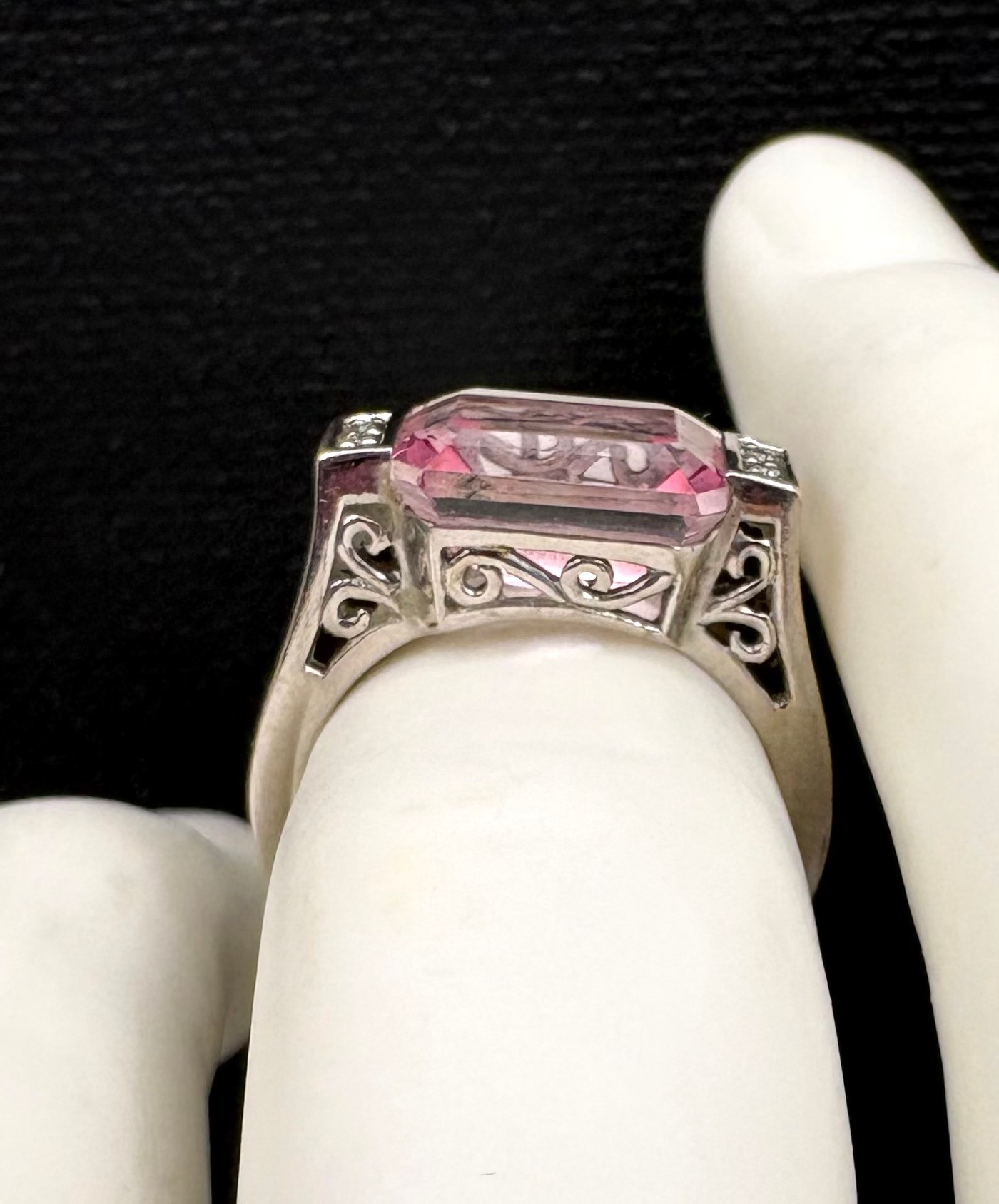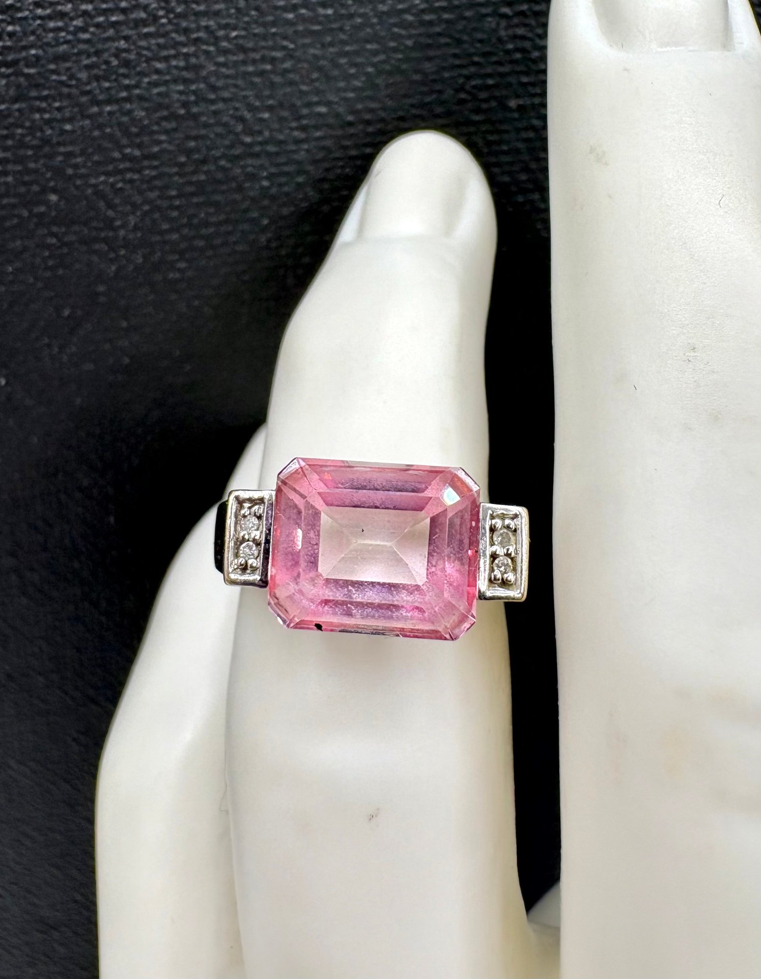 This beautiful ring has an emerald cut pink sapphire and genuine diamonds set in 10kt white gold . Size 7 and weighs 5 grams. Good condition.