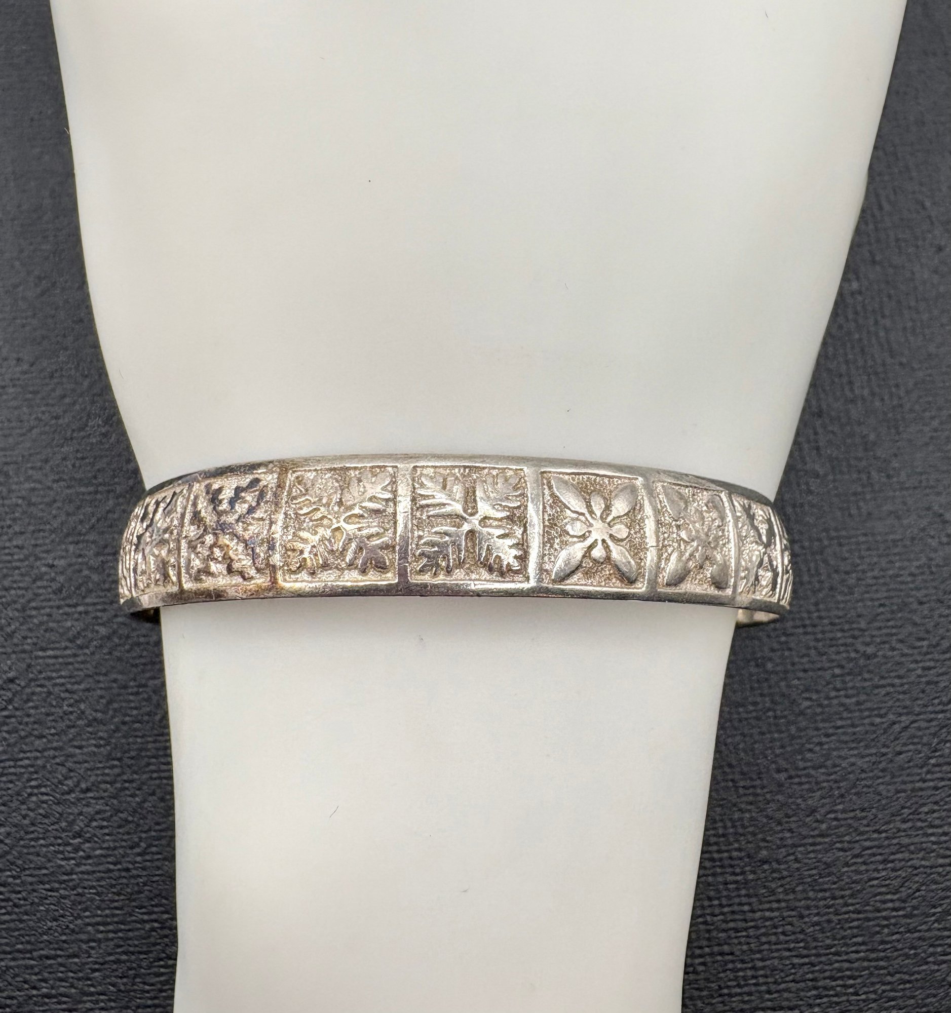 Beautiful snowflake design Sterling Silver artisan cuff bracelet . Measures inches inside including the gap and weighs grams . Good condition.