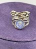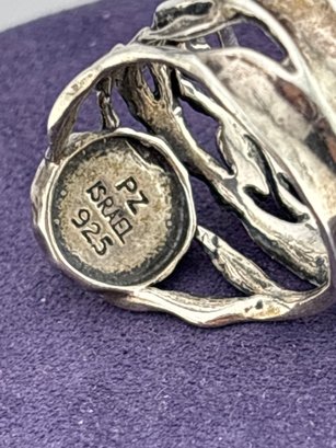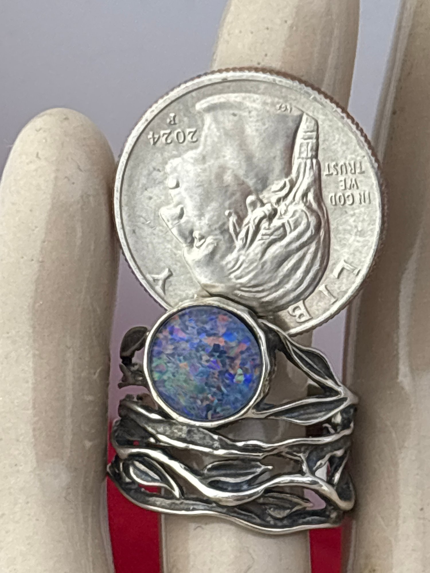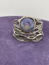 Beautiful oval synthetic opal set in wide flowing sterling silver artisan setting.Size 9 and Weighs 6.6 grams. Excellent condition. For shipping We drop off items at UPS Monday afternoon. They will contact you and you pay them directly.😊