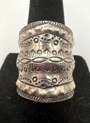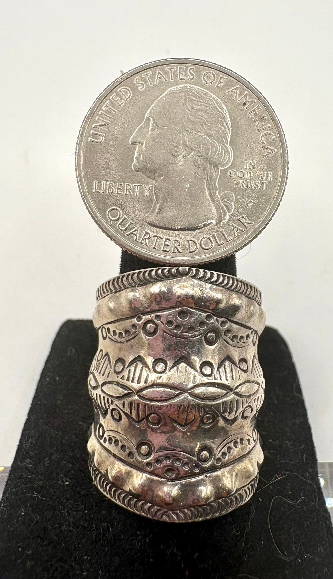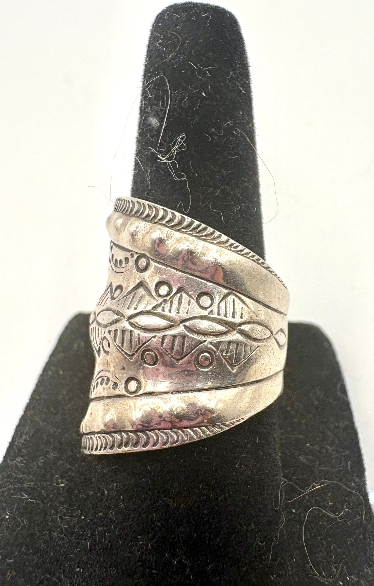 Beautiful southwest stamped design wide sterling silver ring band . Size 8 and Weighs 9.2 grams . We use UPS for shipping. We drop off the Monday after the auction and they will contact you and you pay them directly.