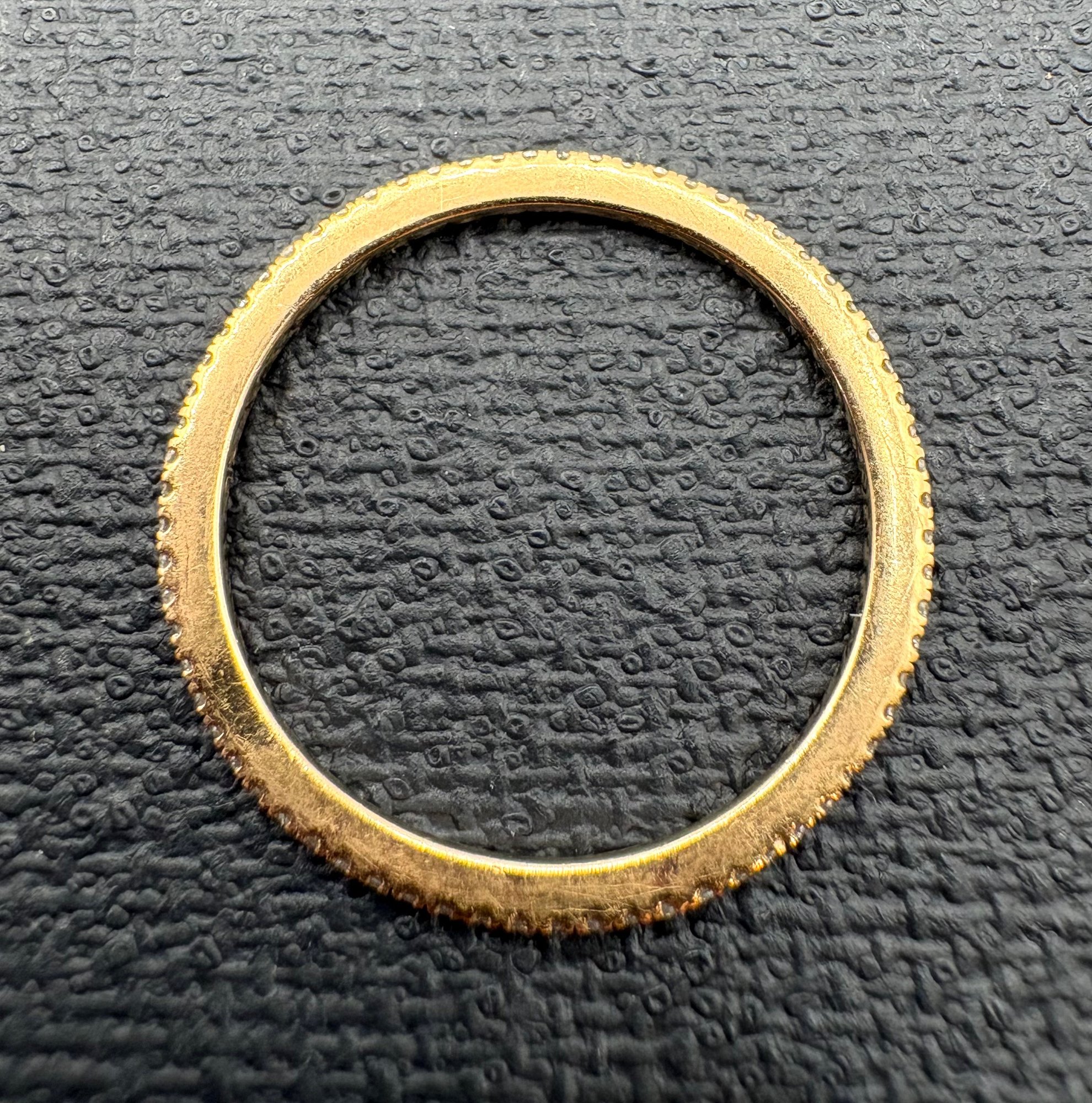 Classic 18 kt yellow gold and genuine white natural diamonds. Size 7 1/2 and weighs 1.3 grams. Good condition. We work with UPS to get your purchases shipped. We drop off your order and they contact you. You pay them directly and they deliver to your address.