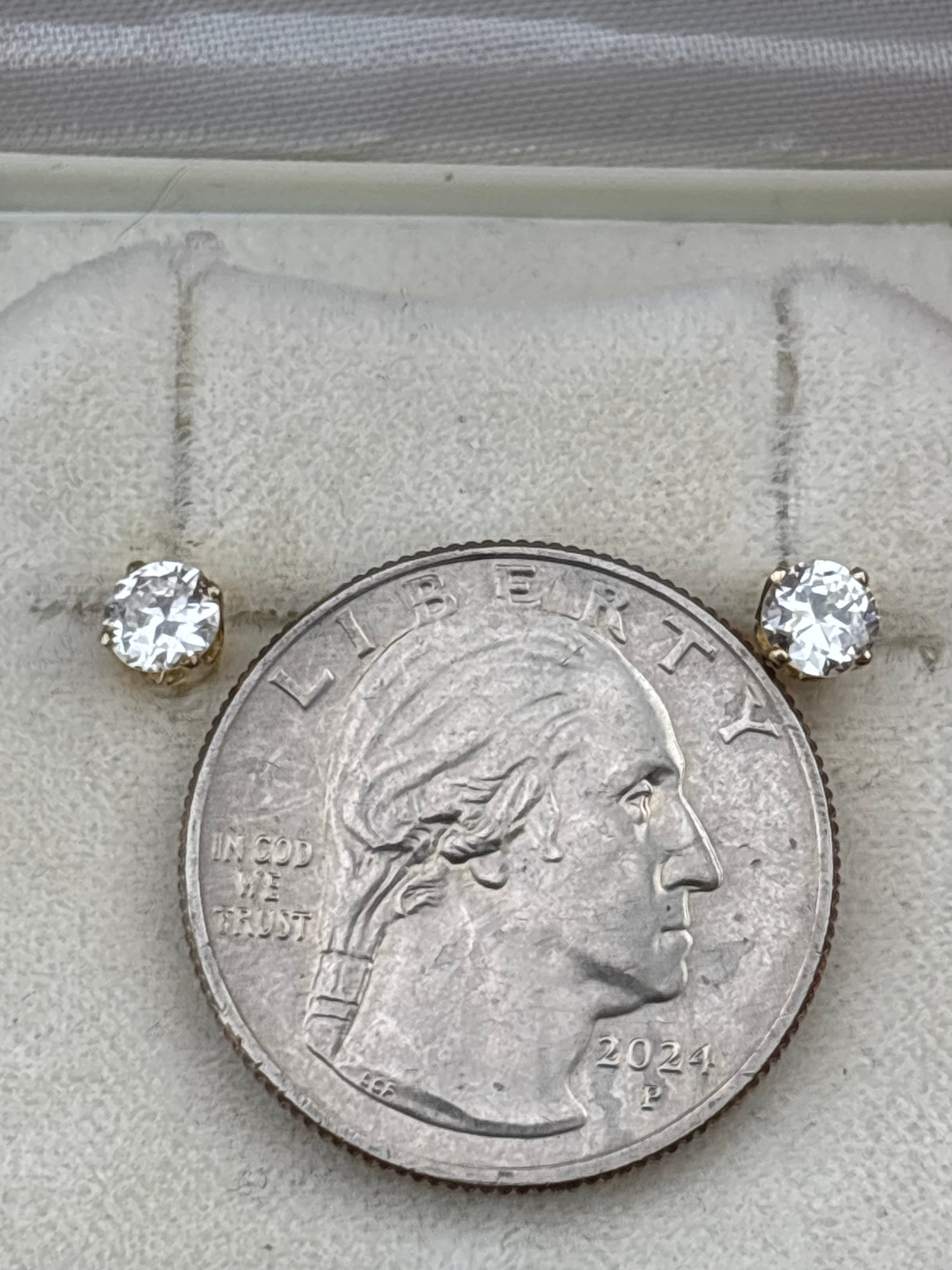 Stunning 25 points each ( 1/2 carat total weight) of genuine natural diamonds set in 14 kt yellow gold . Good condition. We use UPS for shipping. We drop items off and they notify you and you pay them directly.