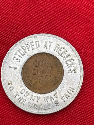 Cool advertising aluminum holder with 1938 penny. I stopped at Reese’s on my way to the Worlds Fair.