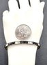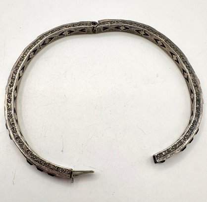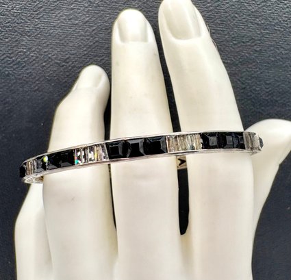 Elegant deco with black and white rhinestone crystals set in sterling silver. Measures inches 6 1/2 inches inside and weighs 10 grams. Dates from the 1930s . Good condition. We work with UPS to get your purchases shipped. We drop off your order and they contact you . You pay them directly and they deliver to your address.