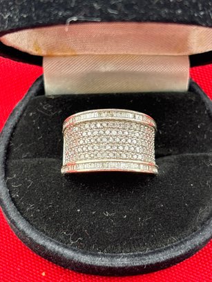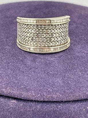 Genuine natural round and baguette diamonds pave set in sterling silver . Size 7 and weighs 6.1 grams. Good condition. We work with UPS to get your order to you. We drop off your order and they contact you . You pay them directly and they deliver to your address.
