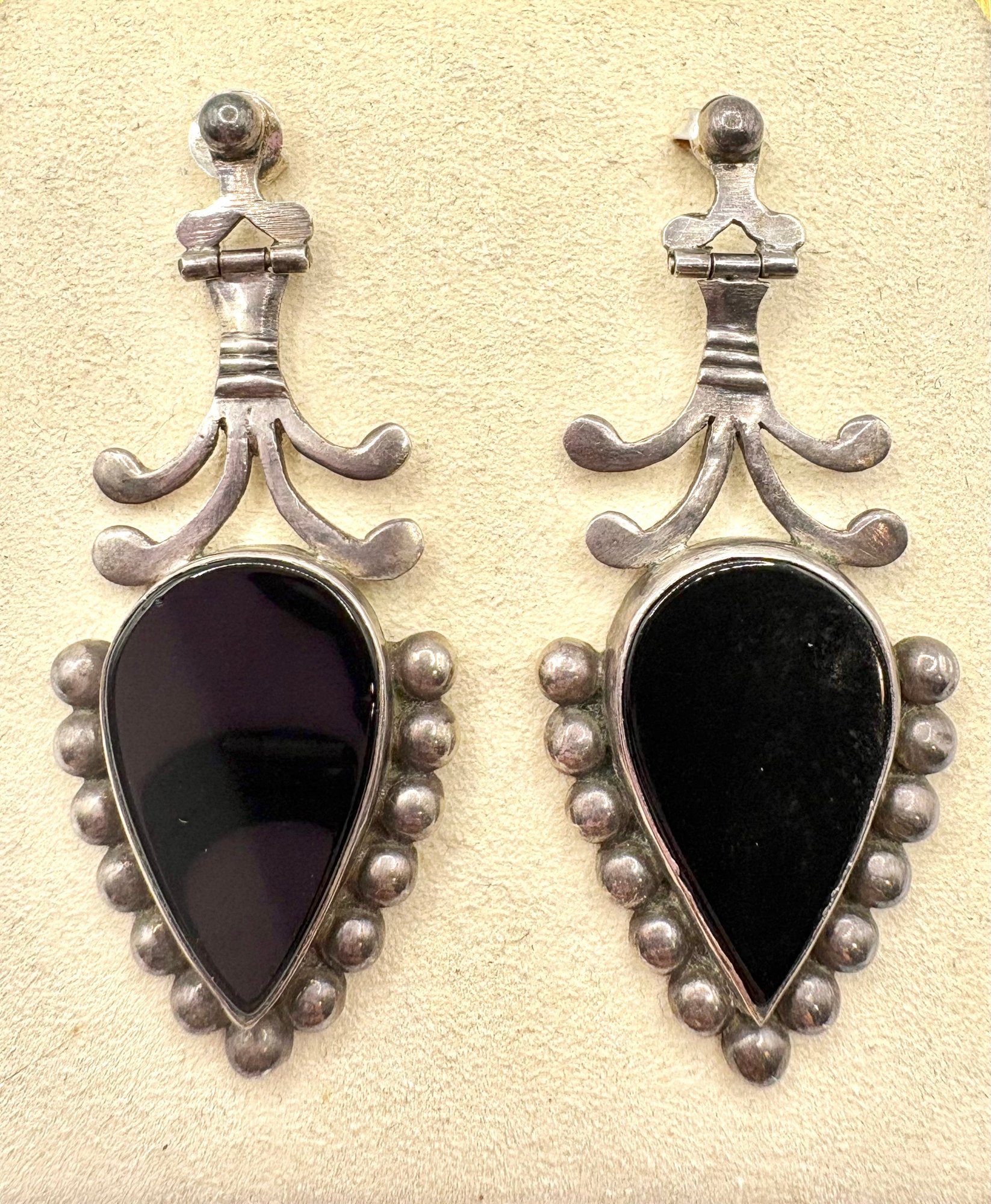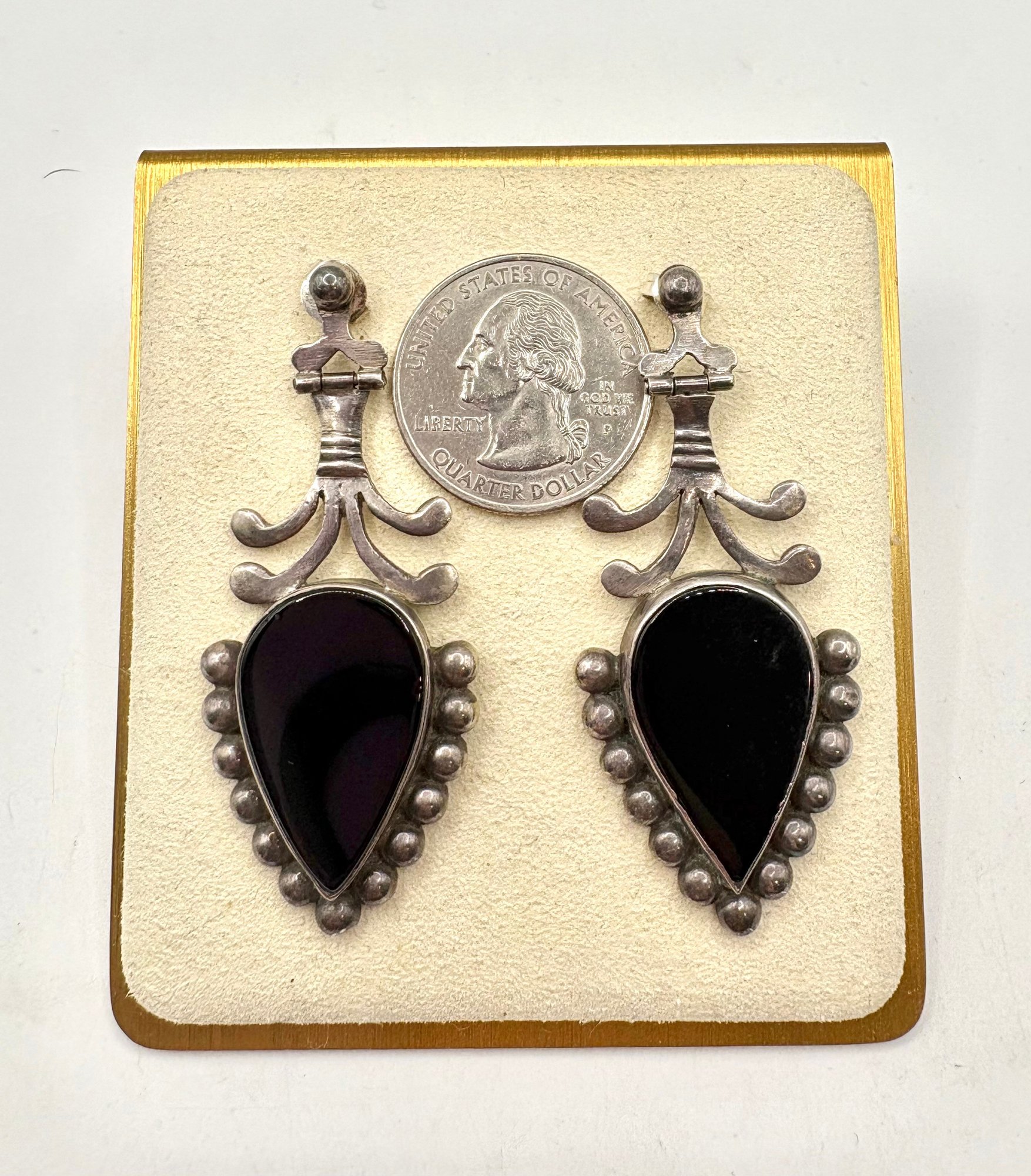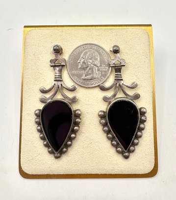 Vintage large hanging sterling silver and onyx earrings. They measure inches long and weigh 14 grams. Good condition.
