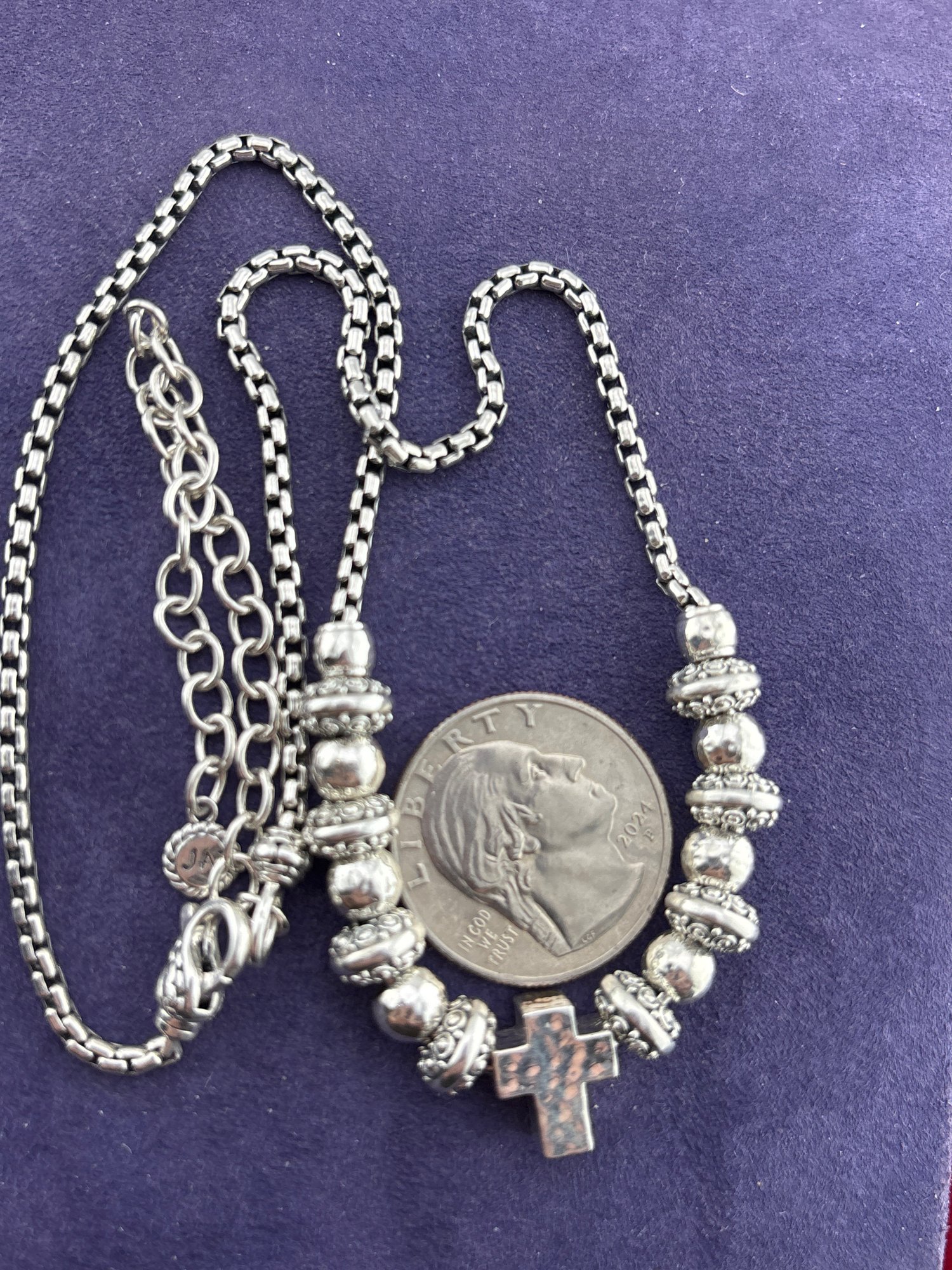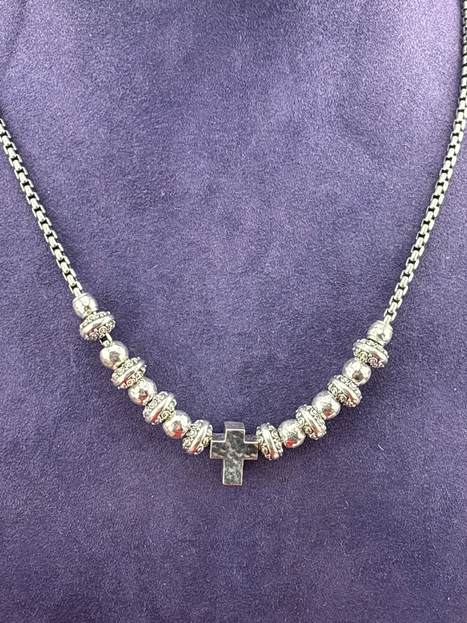Iconic beautiful JOHN HARDY JAI box link in sterling silver with beads and cross. Measures 16 inches plus 4 inch extender and weighs 28.9 grams . Good condition . We work with UPS to get your purchases delivered. We drop off your order and they contact you. You pay them directly and they deliver to your address.