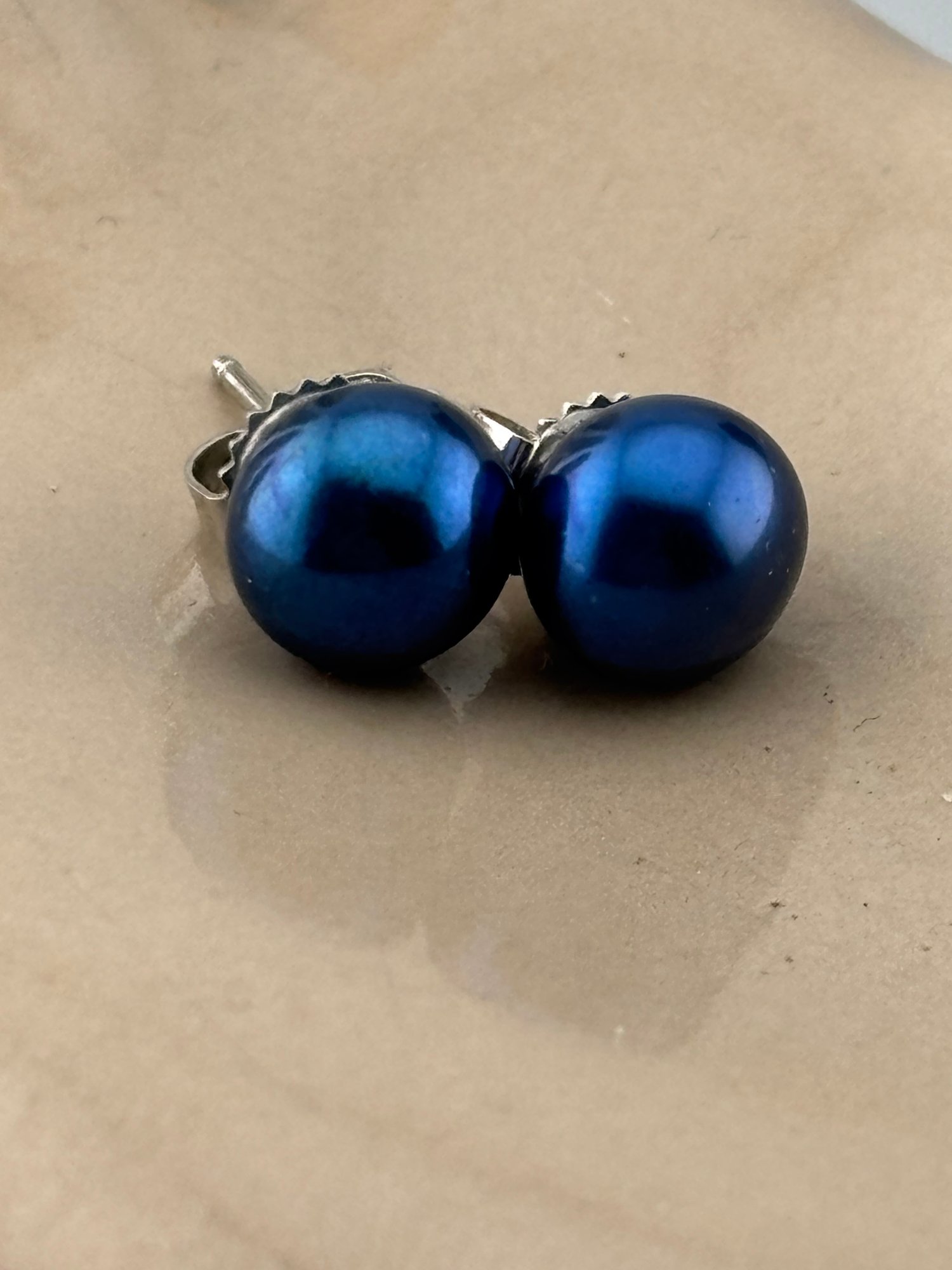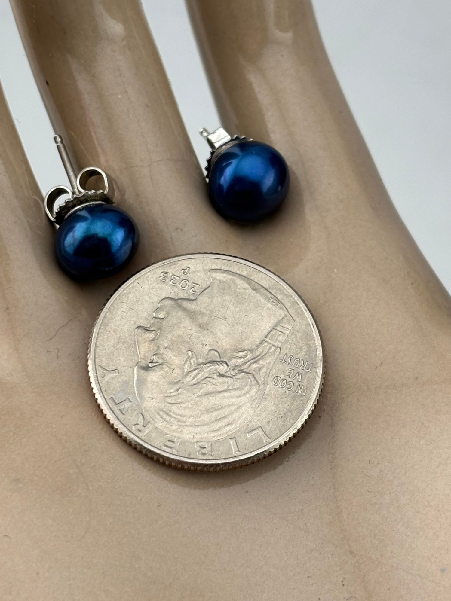 Beautiful HONORA genuine freshwater peacock blue pearls with sterling silver backs and posts . Good condition. We work with UPS to get your purchases shipped . You pay them directly and they deliver to your address.