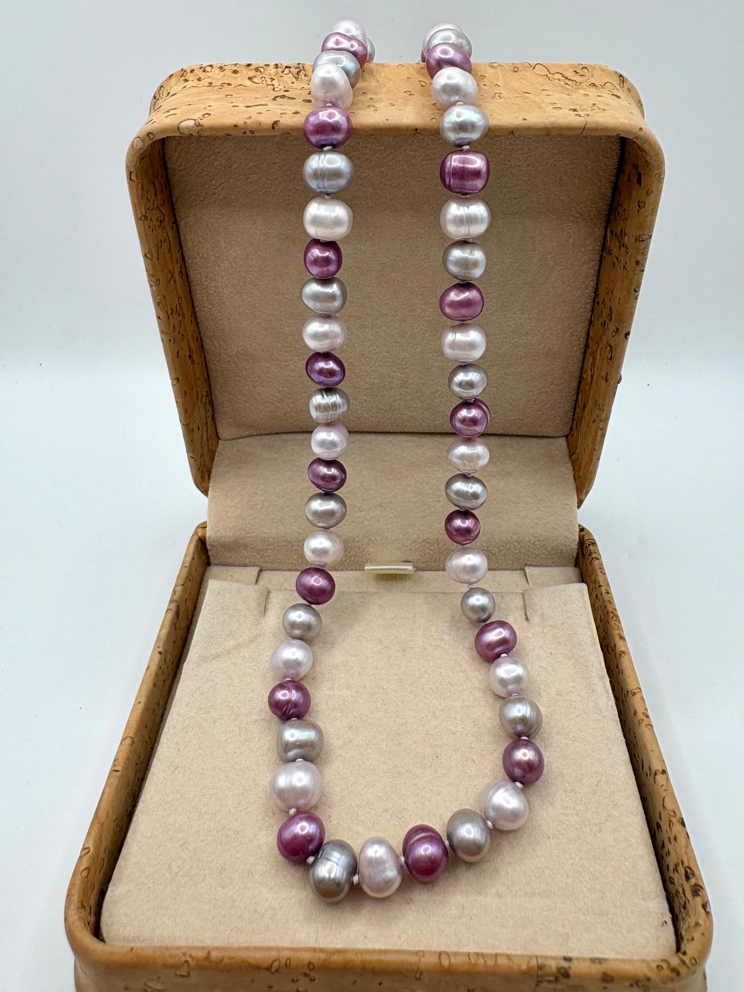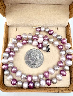 Beautiful fresh water pearls in lustrous shades of lavender with Sterling Silver clasp Measures 18