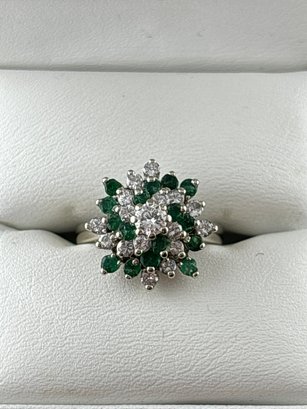 Vintage Absolutely gorgeous swirls of genuine emeralds and sparkling genuine natural diamonds all set in 14 kt white gold cocktail ring . Size 7 and Weighs 6.3 grams. Good condition. We use UPS for shipping. We drop off the Monday after the auction and they will contact you and you pay them directly.