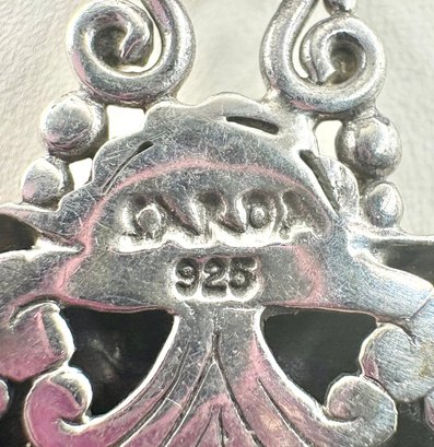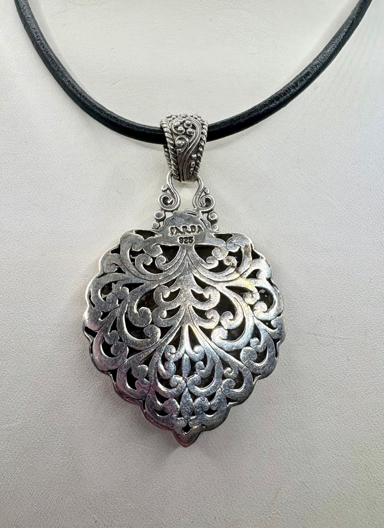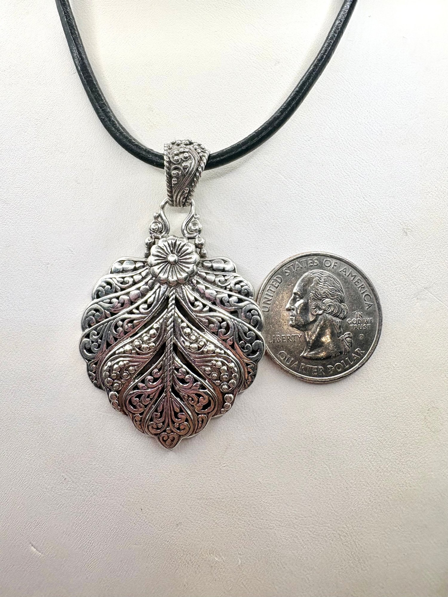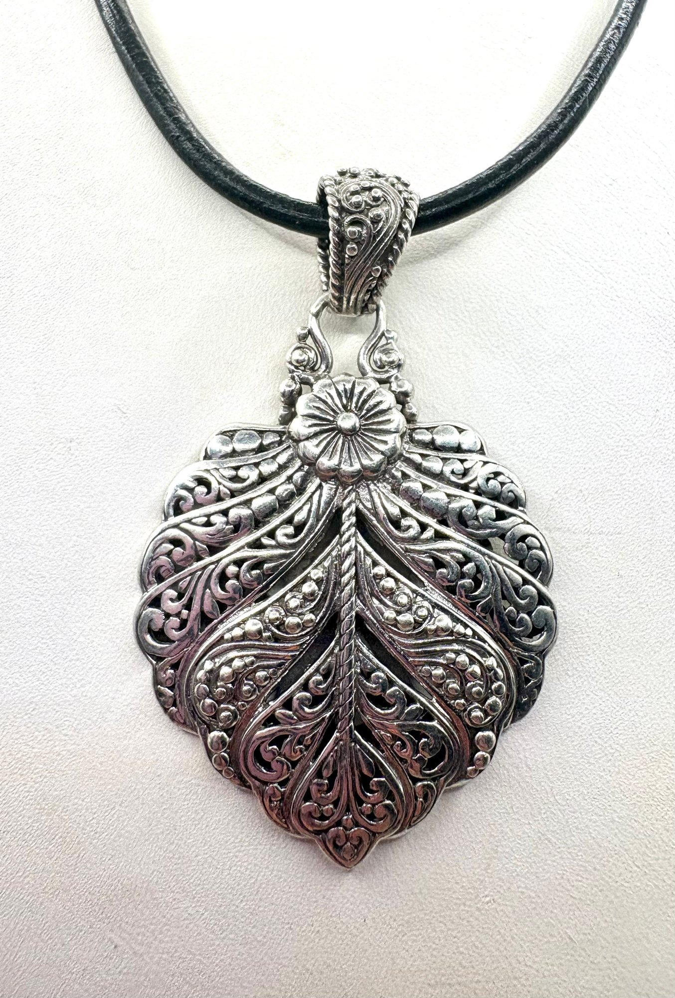 This beautiful necklace has leaf and scroll design on a leather cord. It measures approximately 16 inches and the pendant weighs 12.2 grams . Made by SARDA . Good condition.