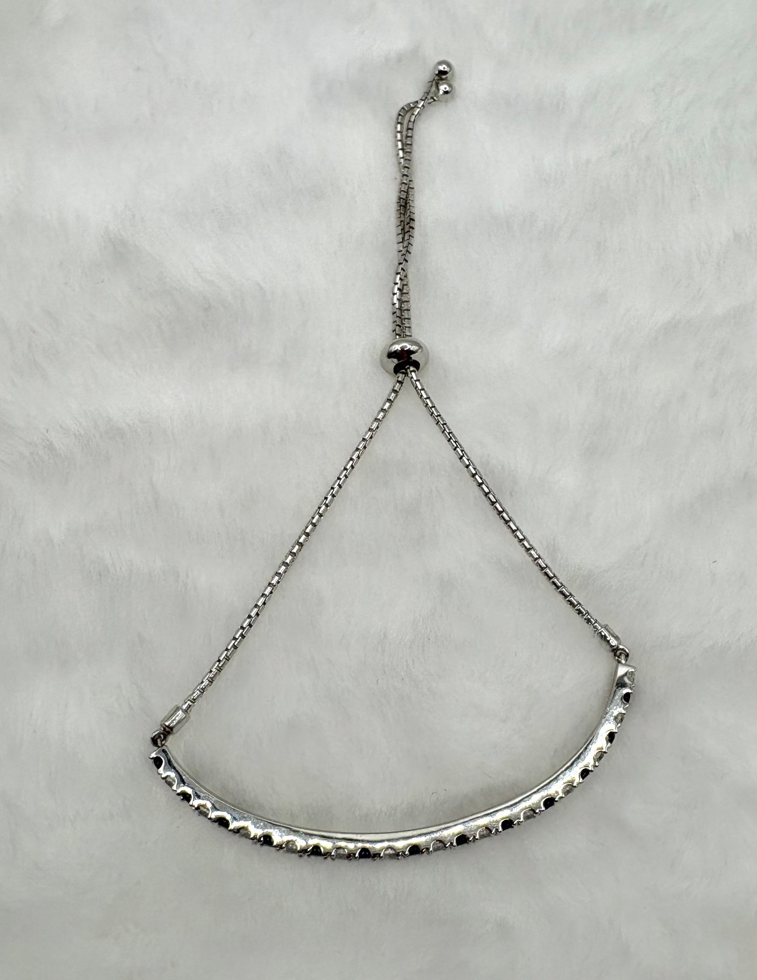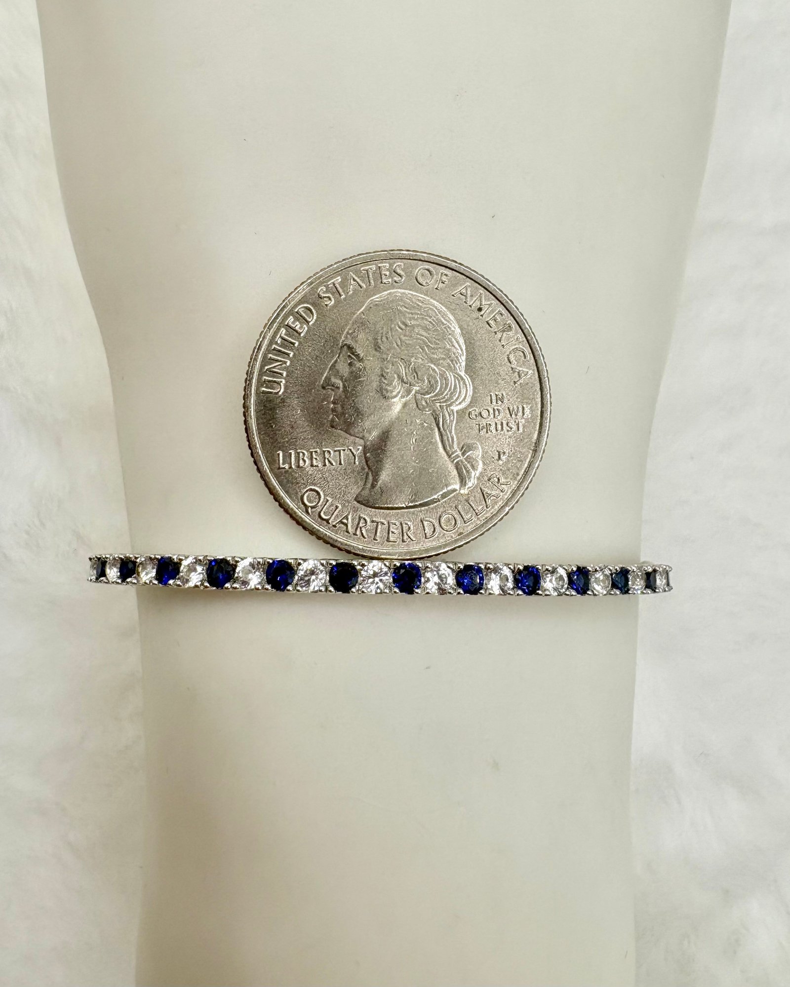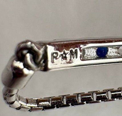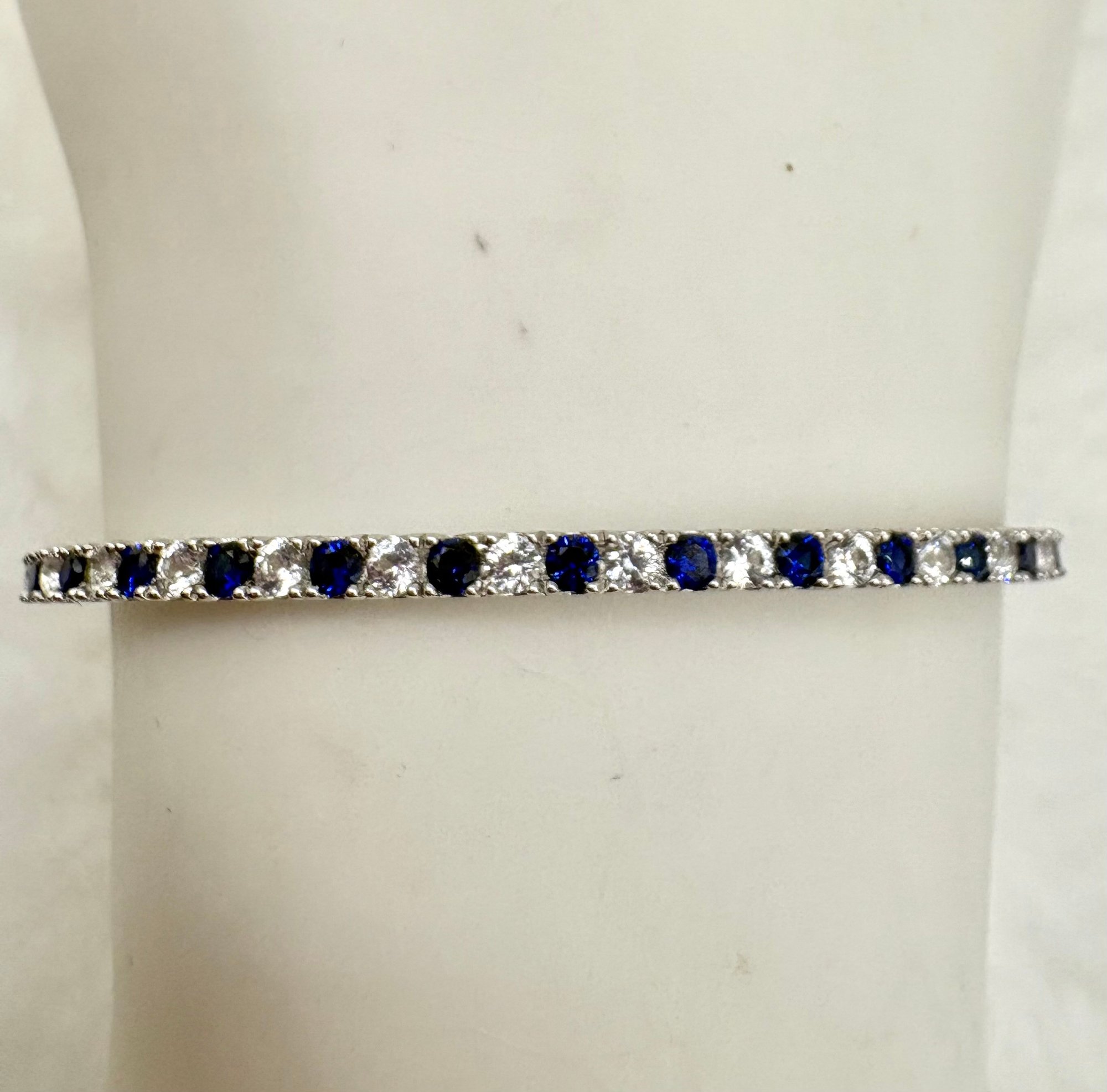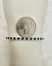 Cool lariat bracelet with synthetic sapphires and sparkling open back crystals set in sterling silver. It can fit up to an 8 inch wrist. Weighs 4.3 grams, good condition. We work with UPS to get your purchases shipped. All you must do is call or email our local UPS Store and they will coordinate with us a pickup time. You pay them directly and they deliver to your address. Call 631-218-5800 for a price quote.